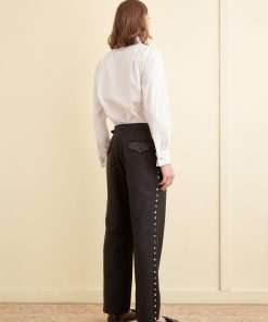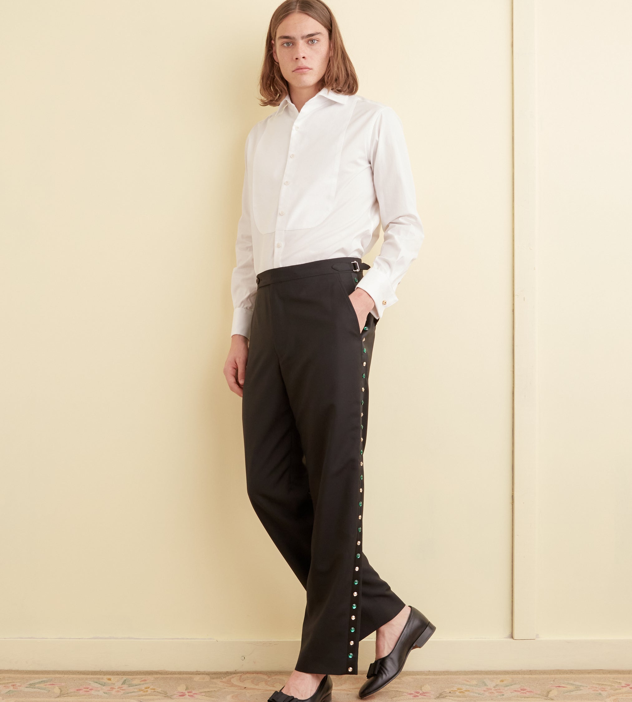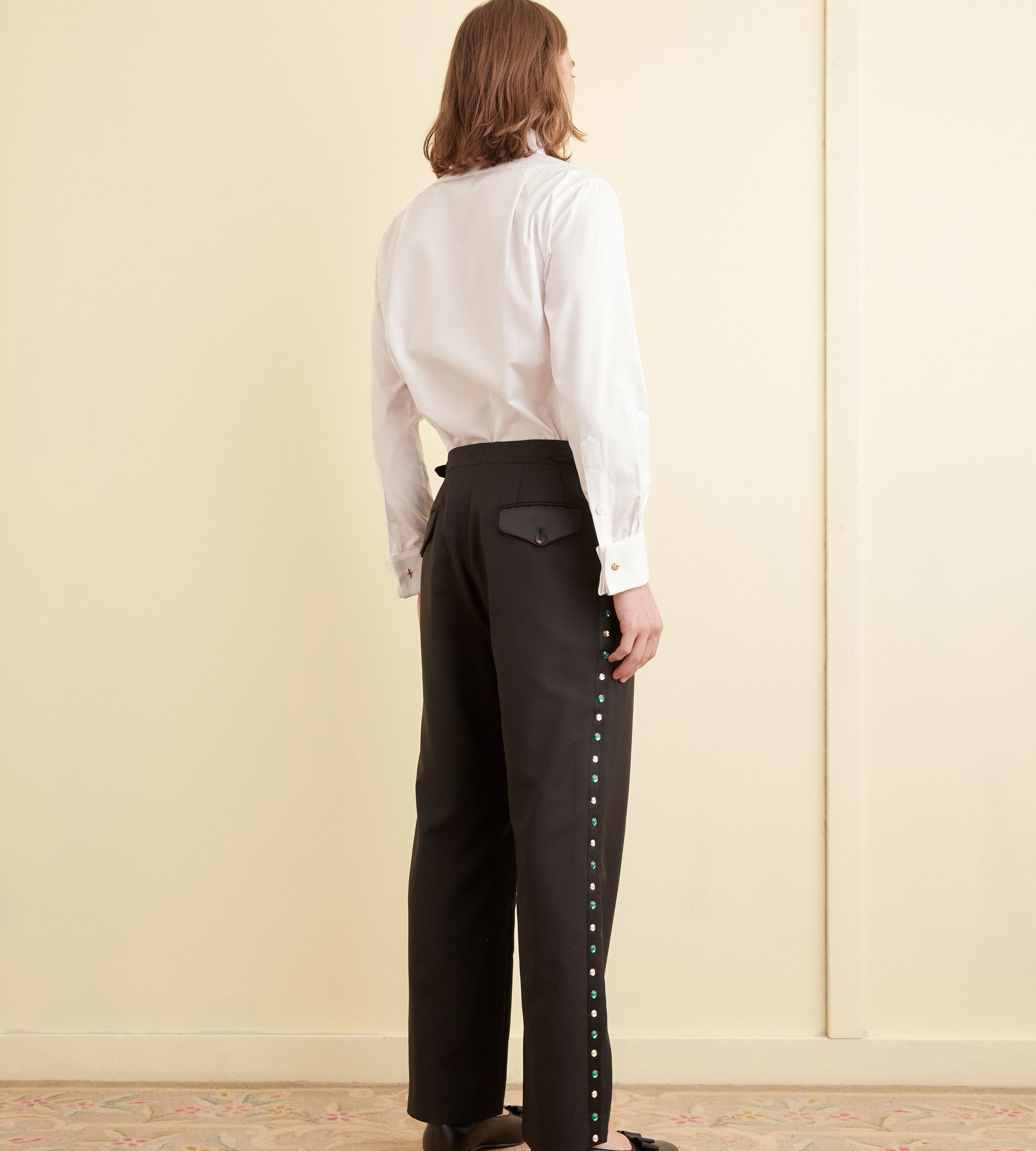 These trousers are inspired by a gemstone collar from the 1960s and are cut according to a classic men’s suiting silhouette. We reproduced the colorful gem studs along the side seams. The trousers have a mid-rise and a straight leg.