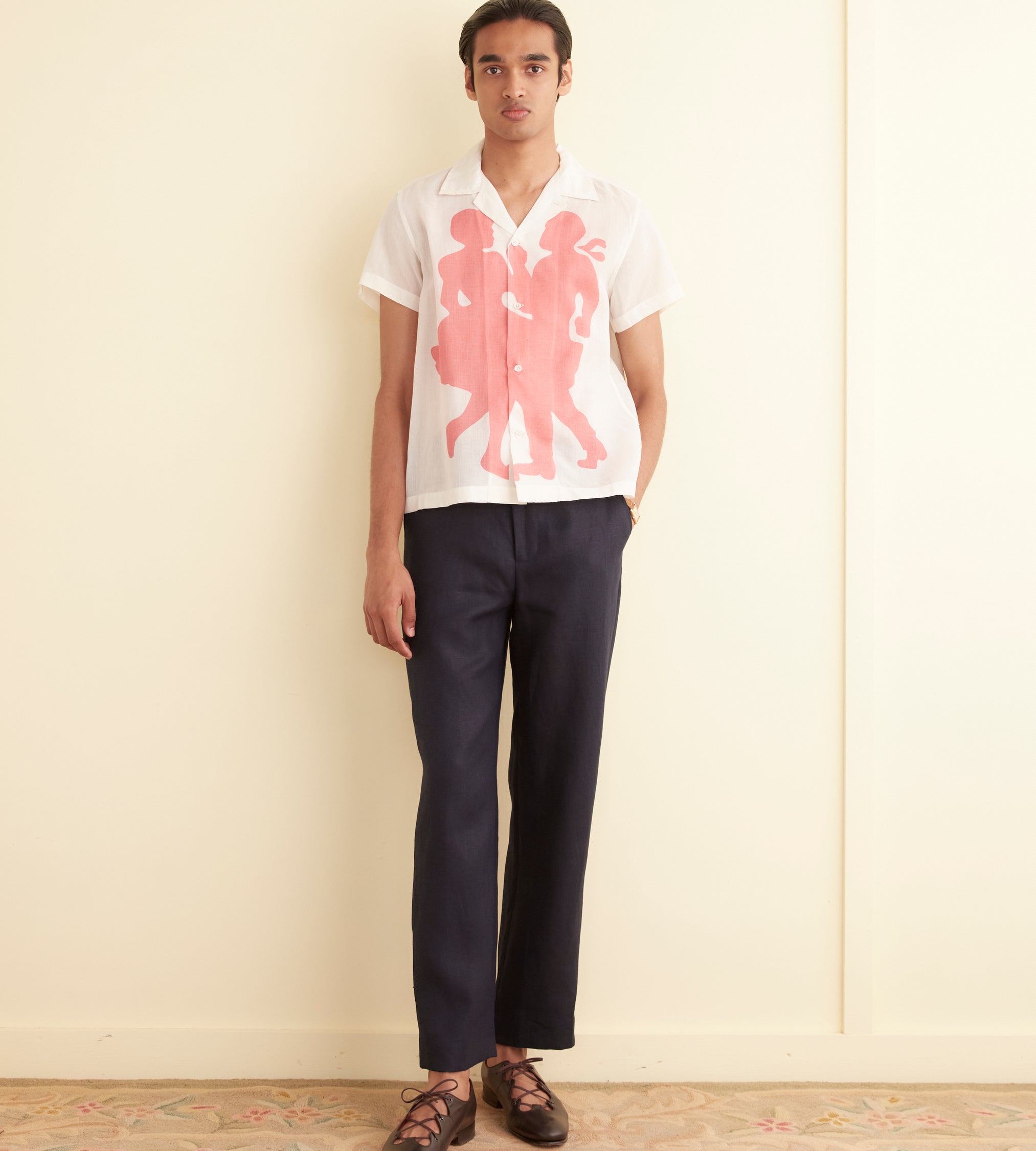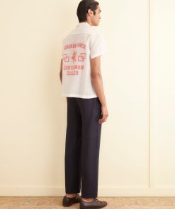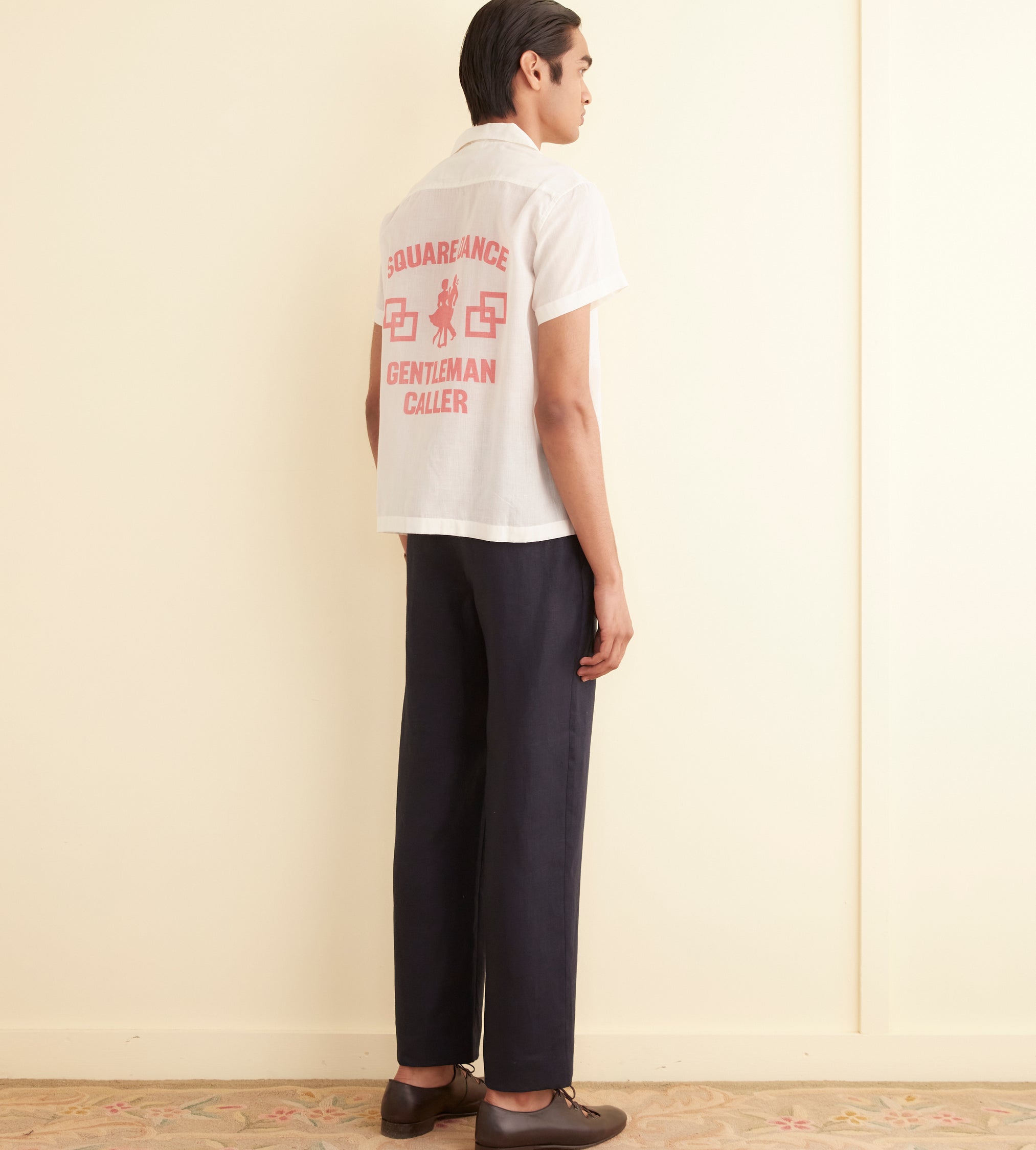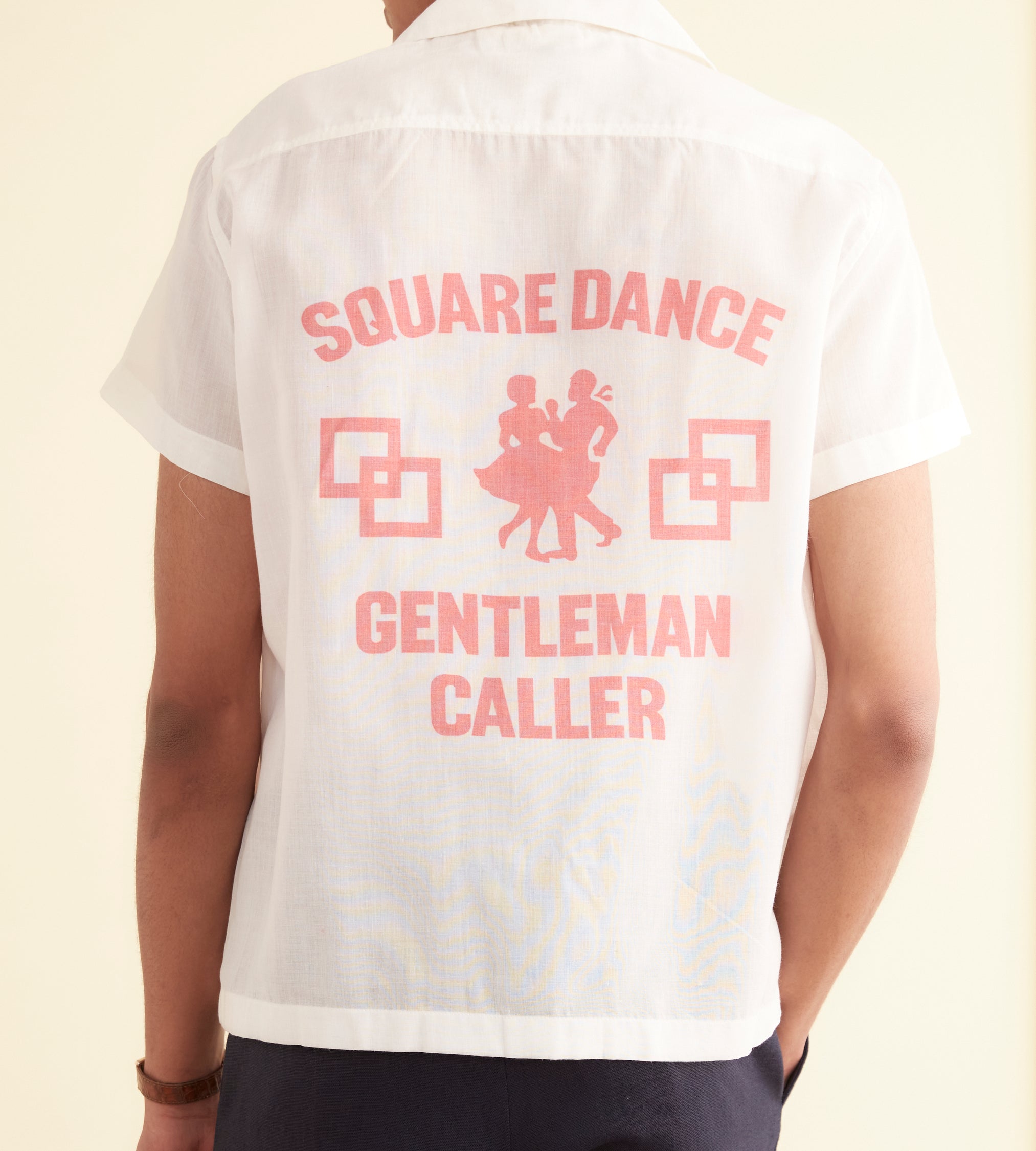 This shirt is inspired by a souvenir flag from a square-dancing competition. We reproduced the design and illustration on this sheer cotton organdy shirt.