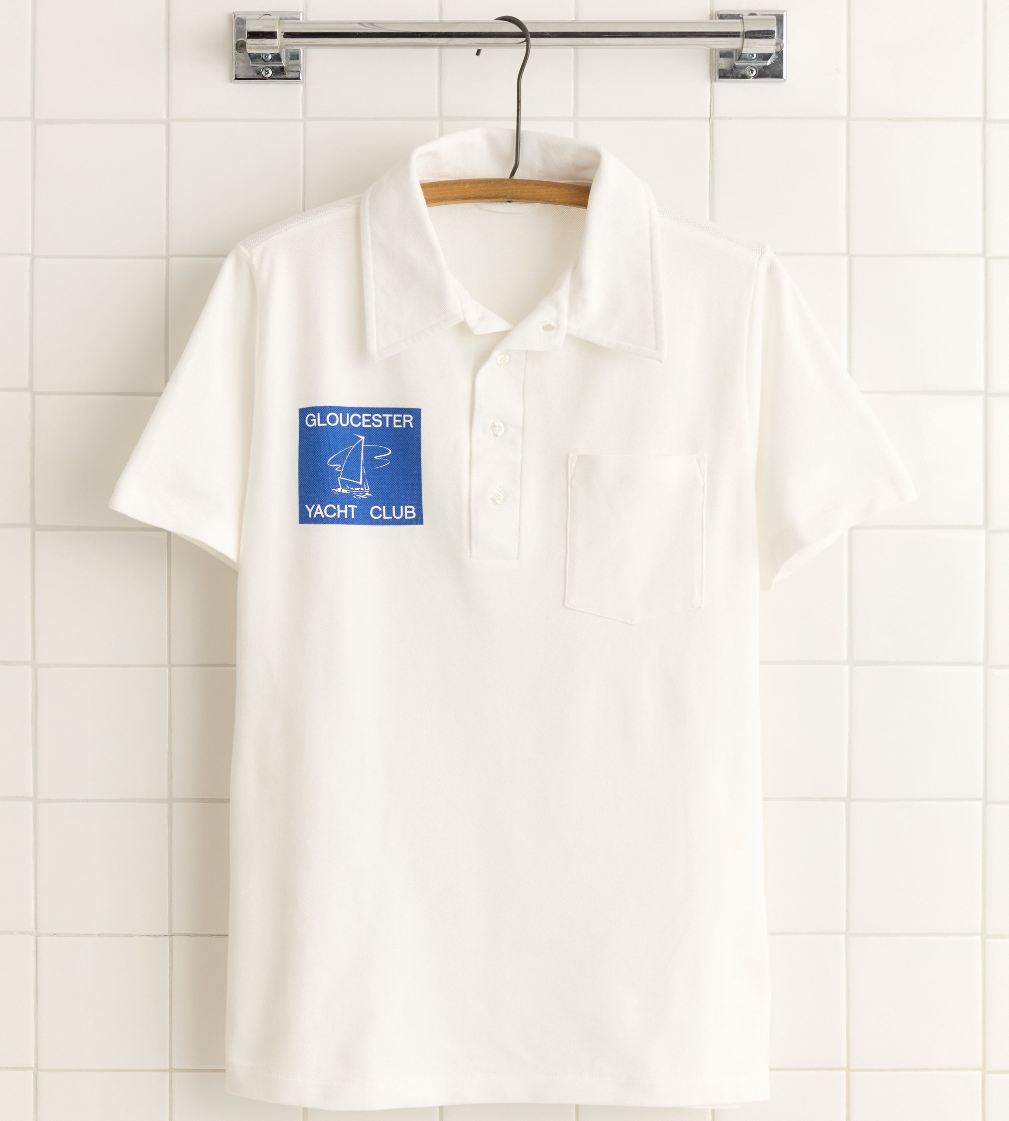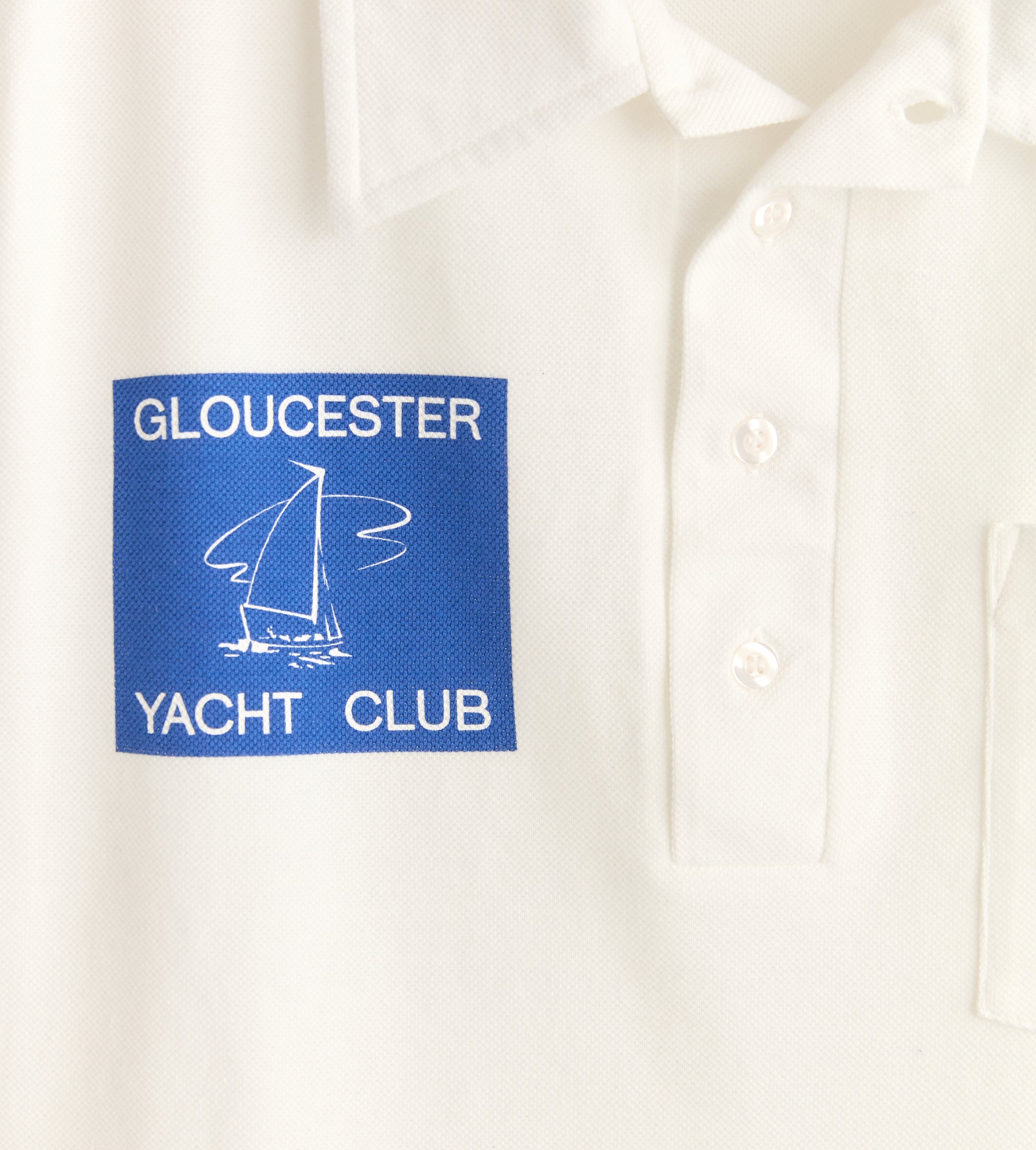 This piece is inspired by a sporting polo from the 1960s-1970s. We reproduced the original silhouette with an illustration of a yacht and the words “Gloucester Yacht Club.”