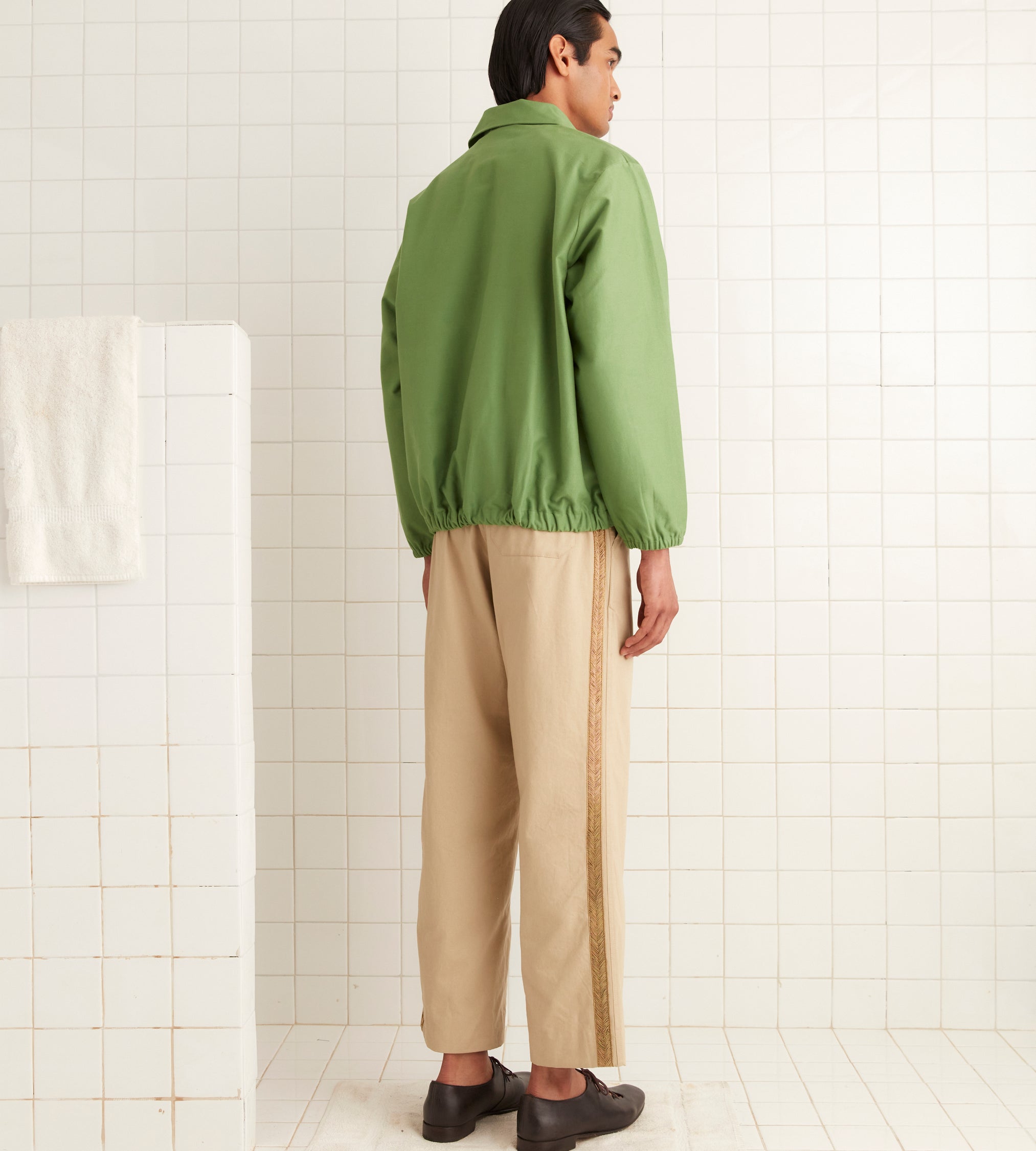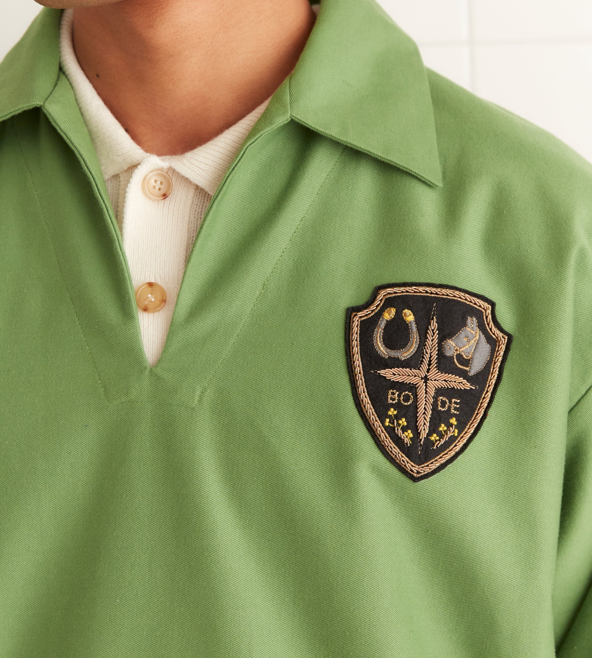 This style is inspired by a canvas pullover from the 1980s. We reproduced the silhouette, with its elasticated hem and cuffs, in midweight green cotton. The pullover is embellished with an embroidered bullion patch featuring a horse, horseshoe, and flowers.