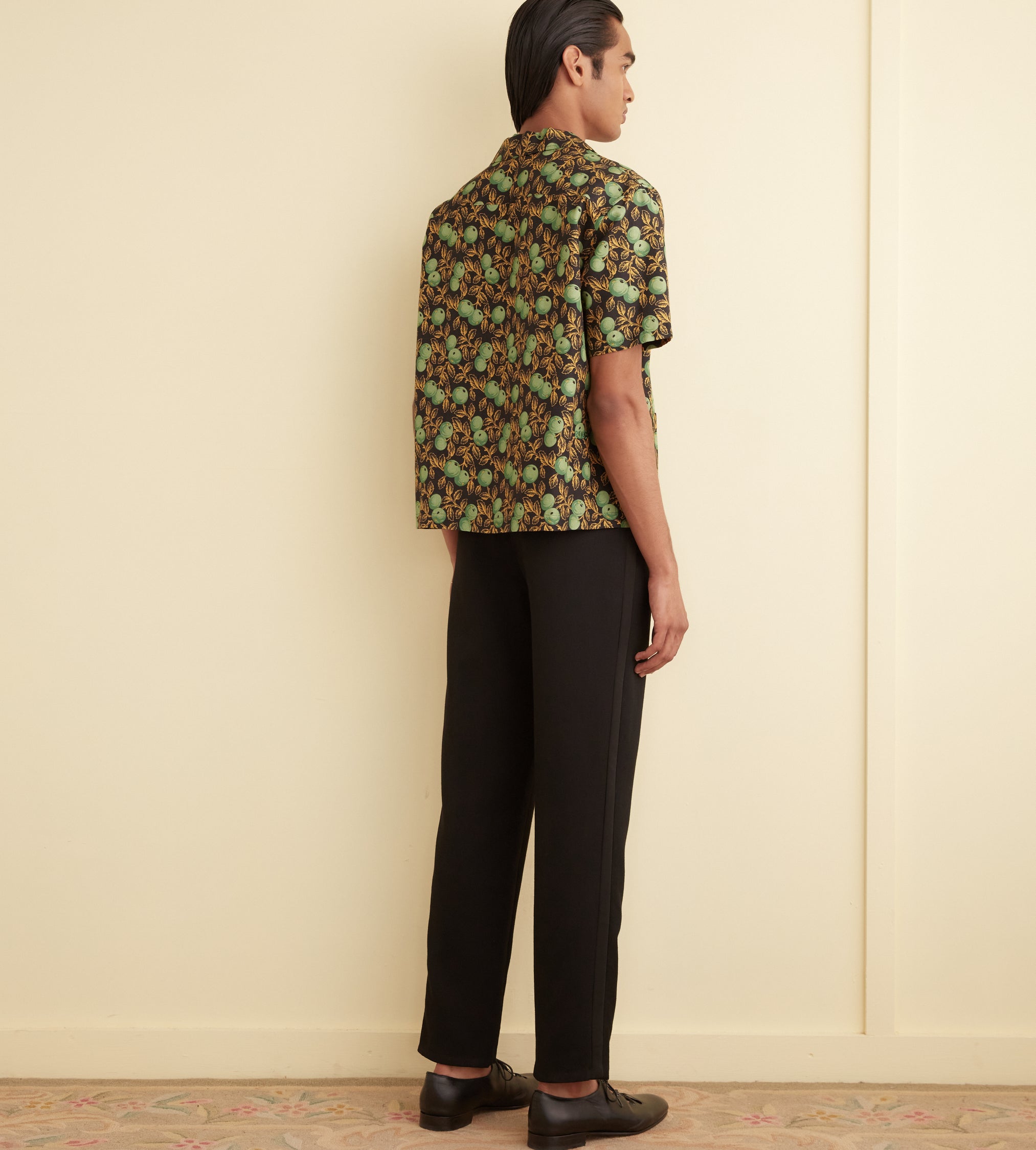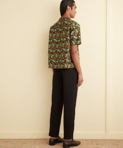 This short sleeve shirt is inspired by a textile salesman’s swatch circa the 19th century. The original fabric was made and printed in England for the Indian market under trade practices that prioritized importing English textiles over domestically produced Indian cotton. The pattern was faithfully reproduced from a small swatch.