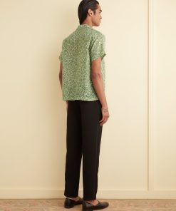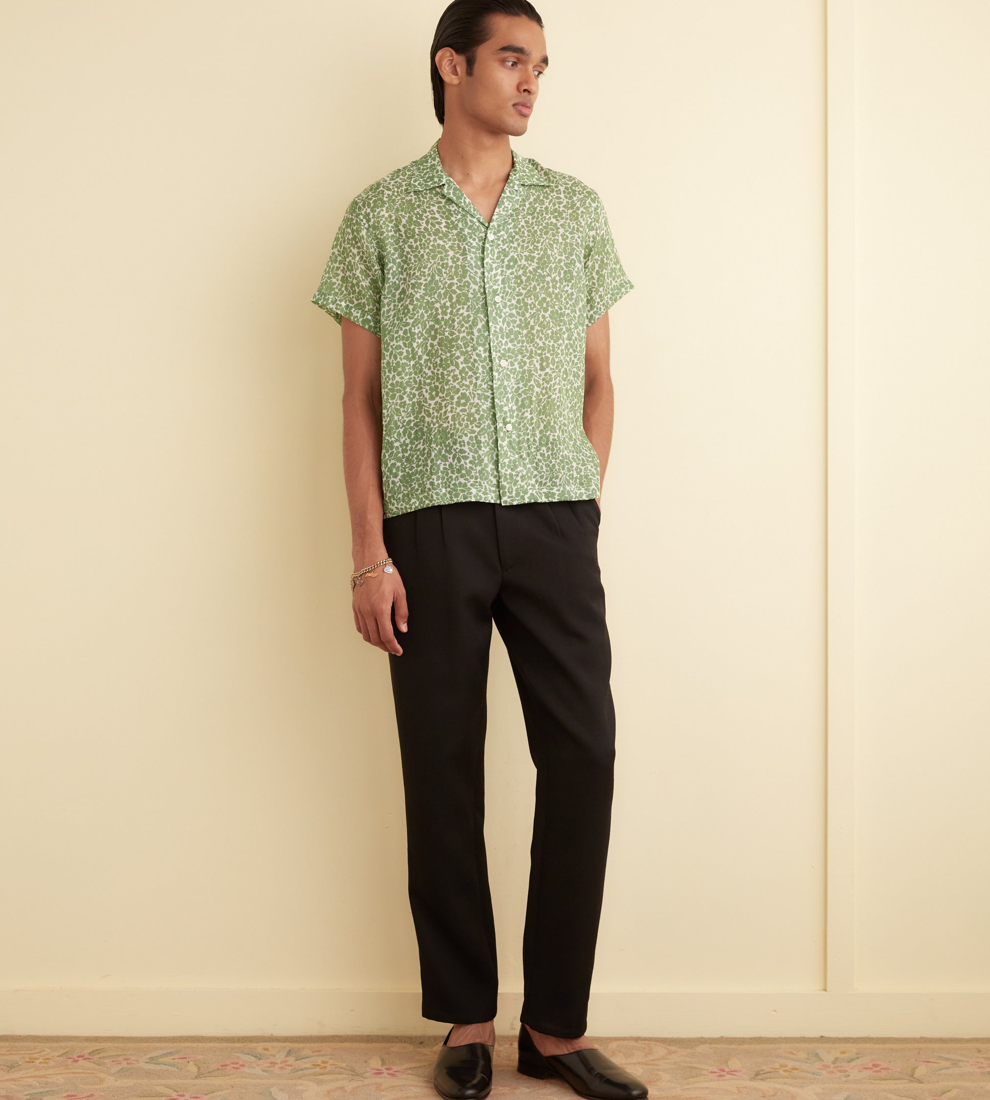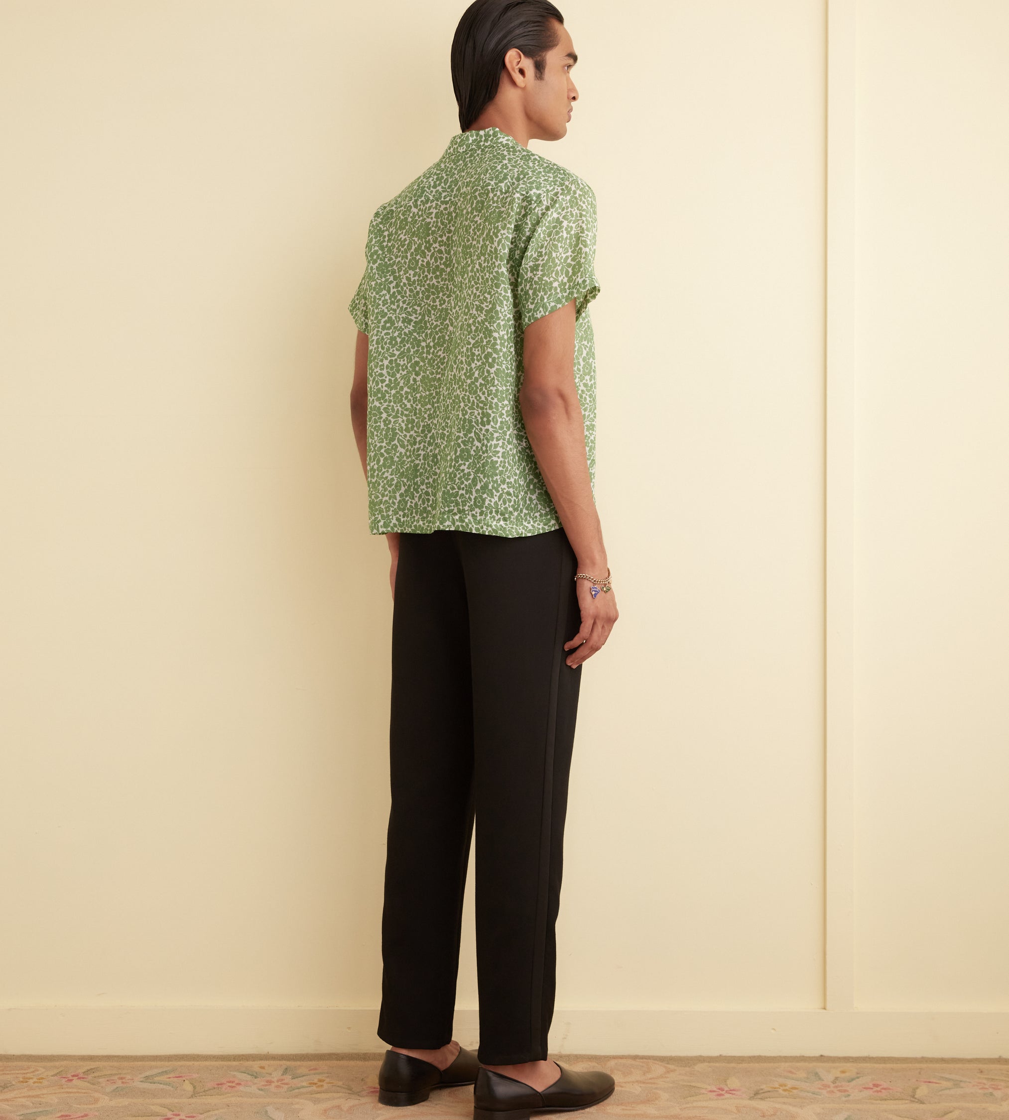 This shirt is inspired by a fabric remnant from the 1940s. We have recreated the original pattern—a green and white all-over floral—for this shirt.
