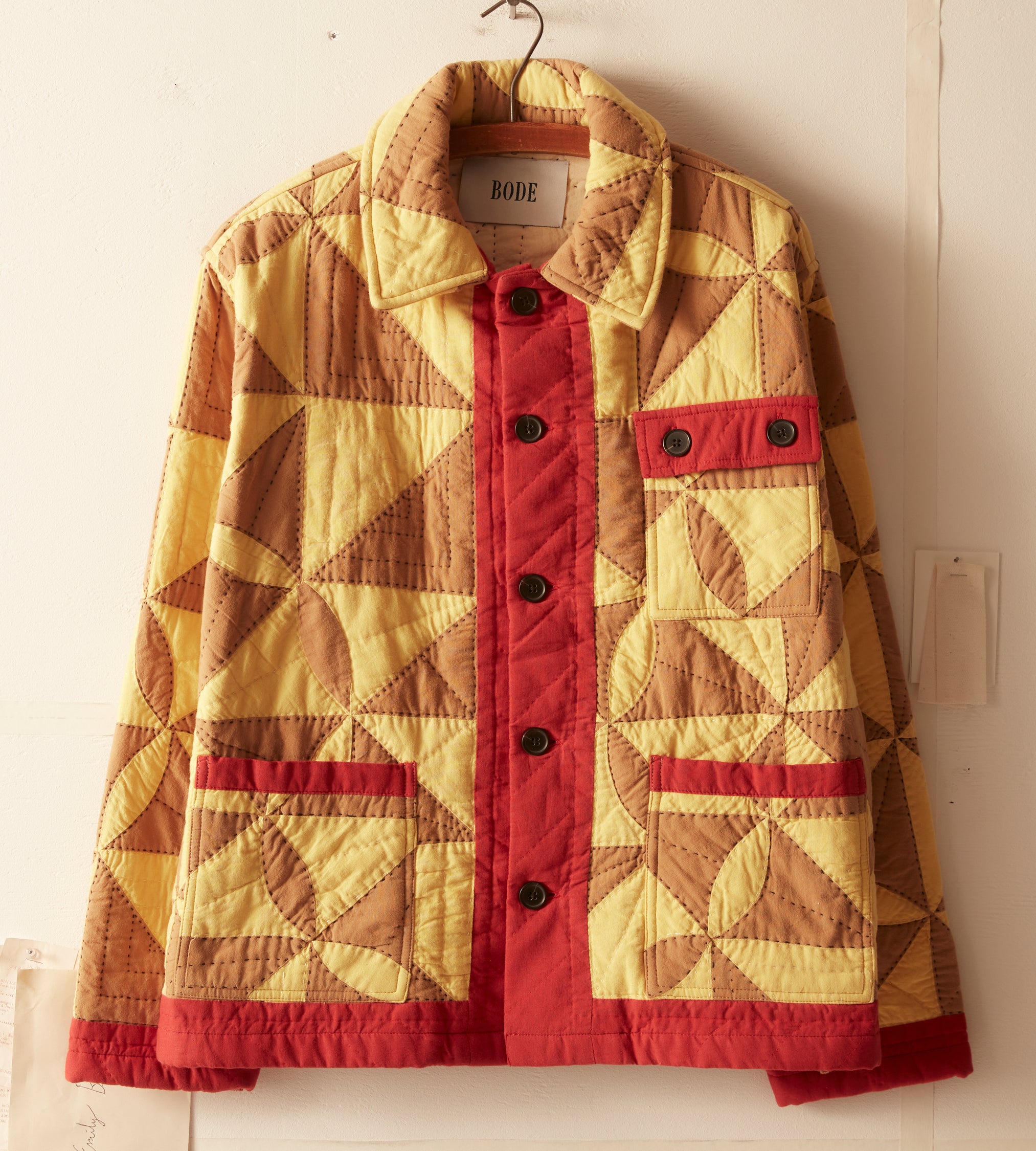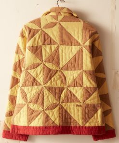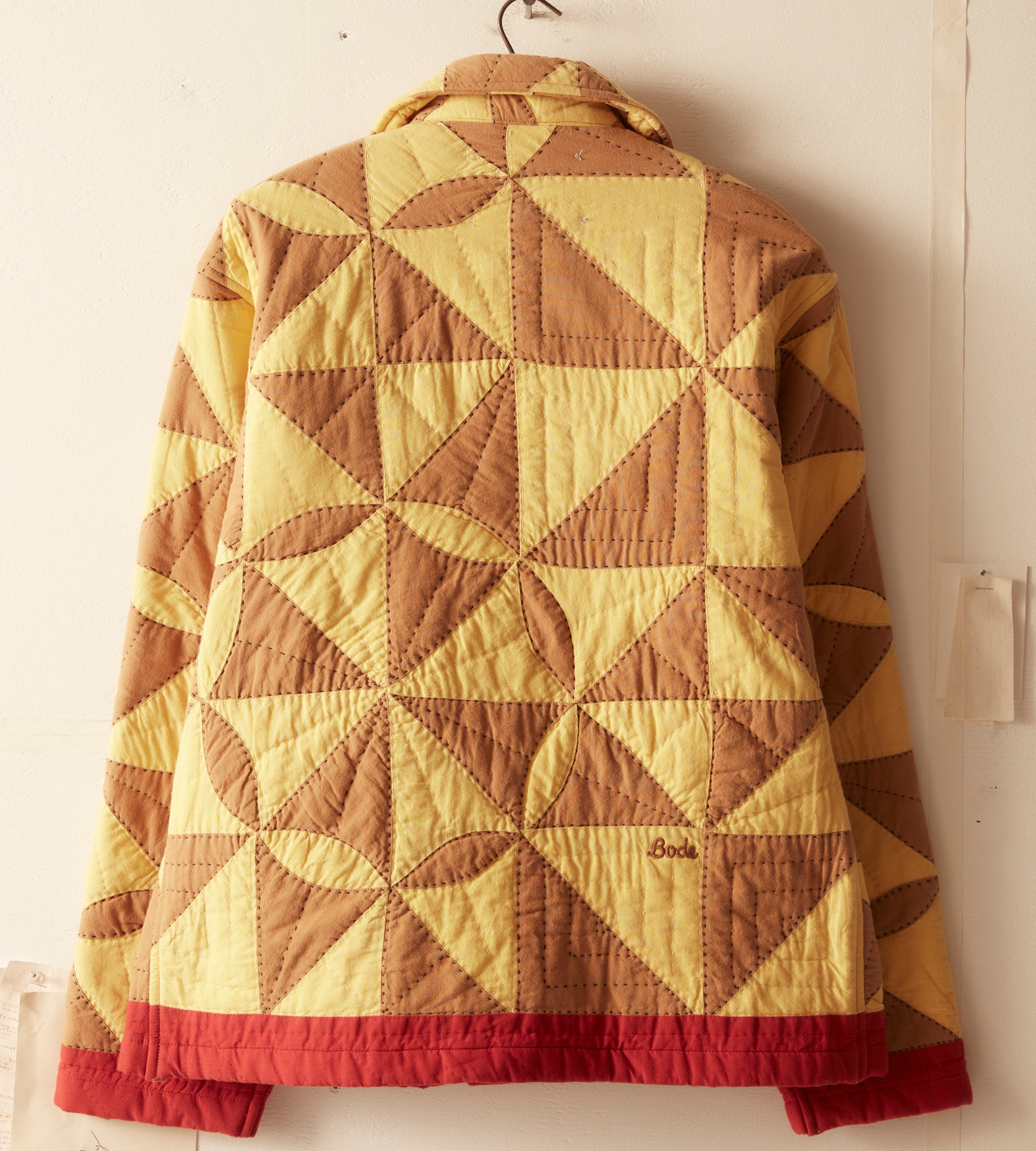 This quilt jacket is inspired by an antique patchwork quilt, circa 1910s-1930s. The original textile was a distressed quilt, made from scraps of three colors of cotton fabric. The quilt was gifted to Emily by a longtime friend and mentor in New England.