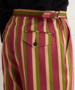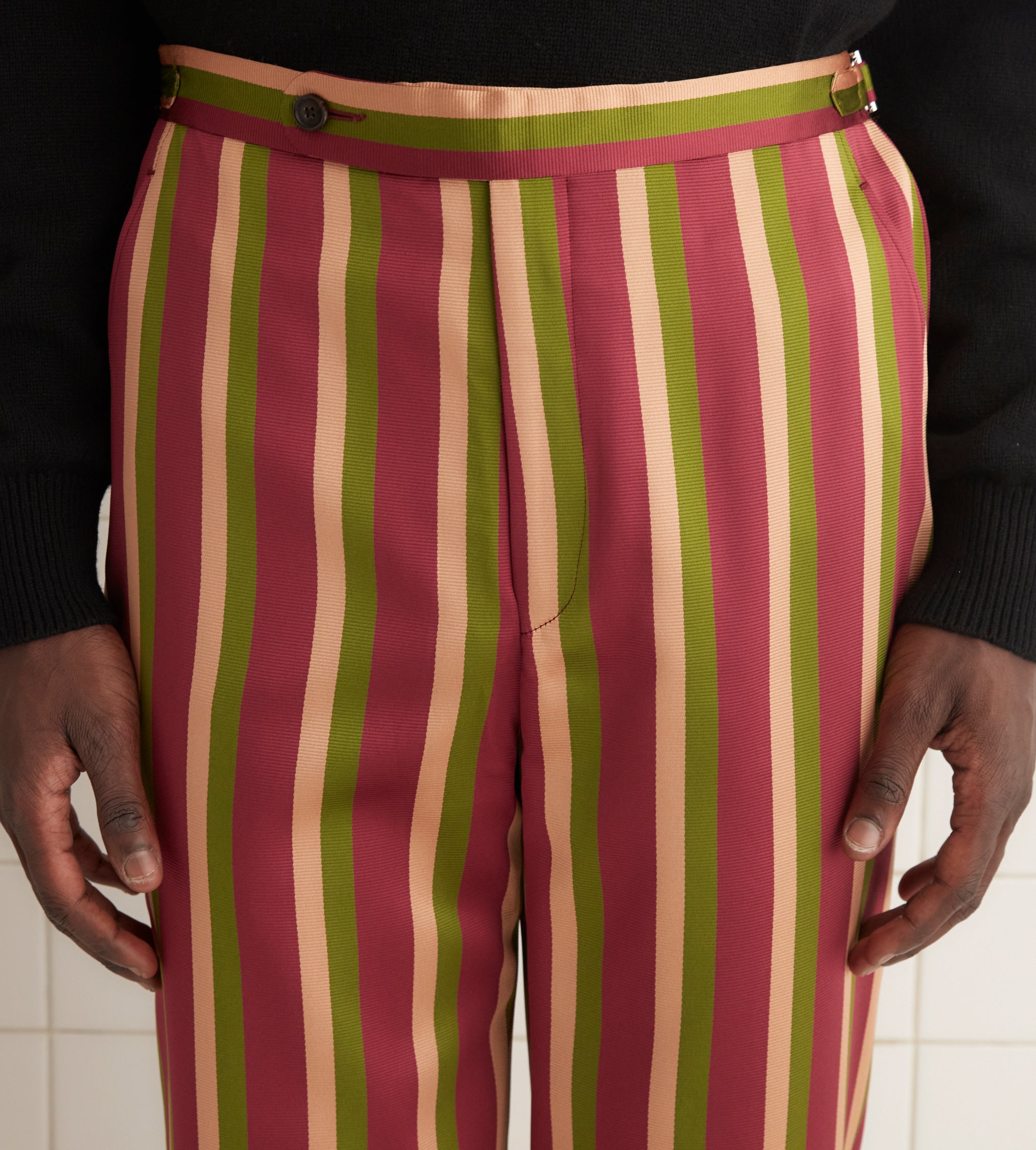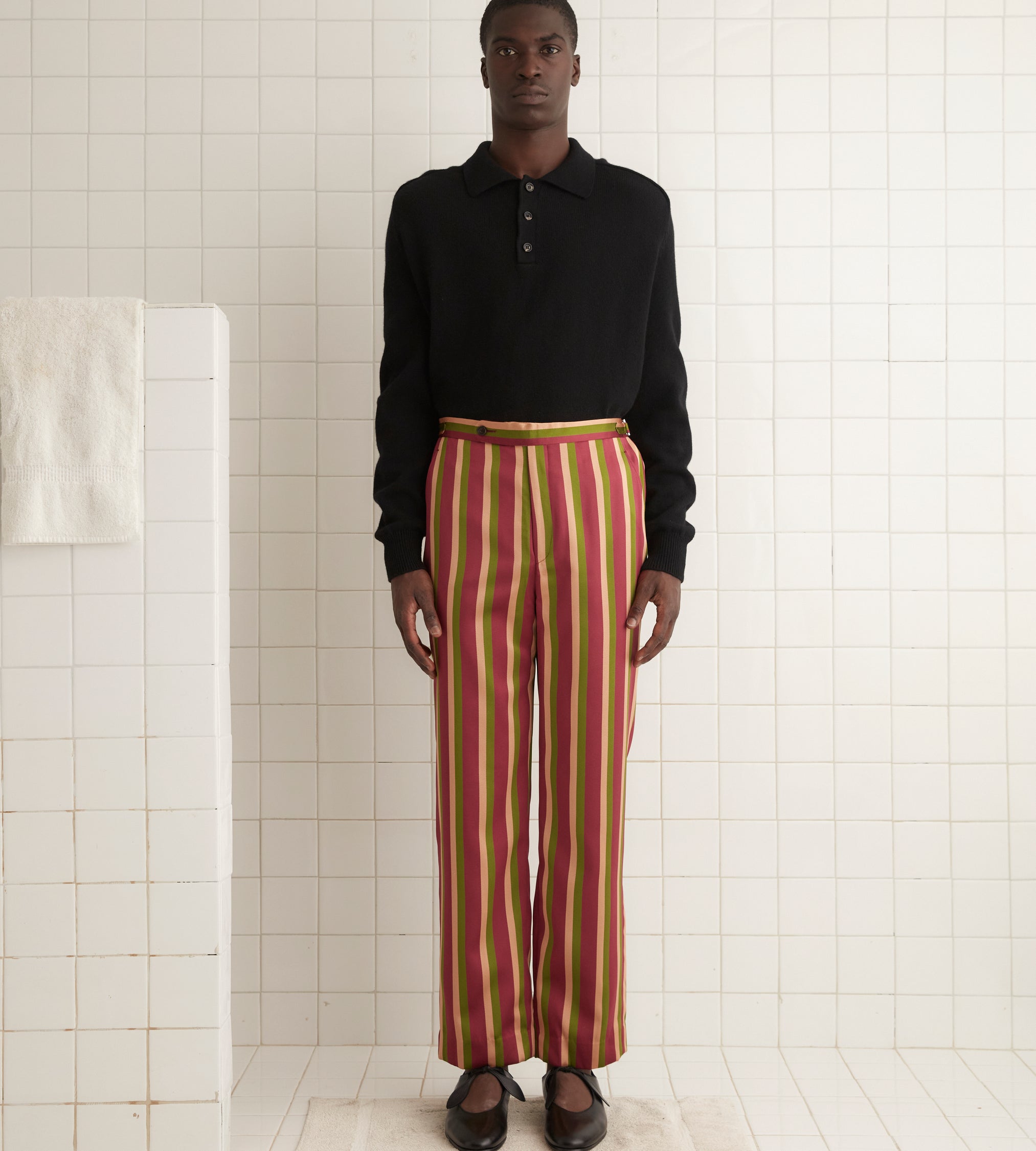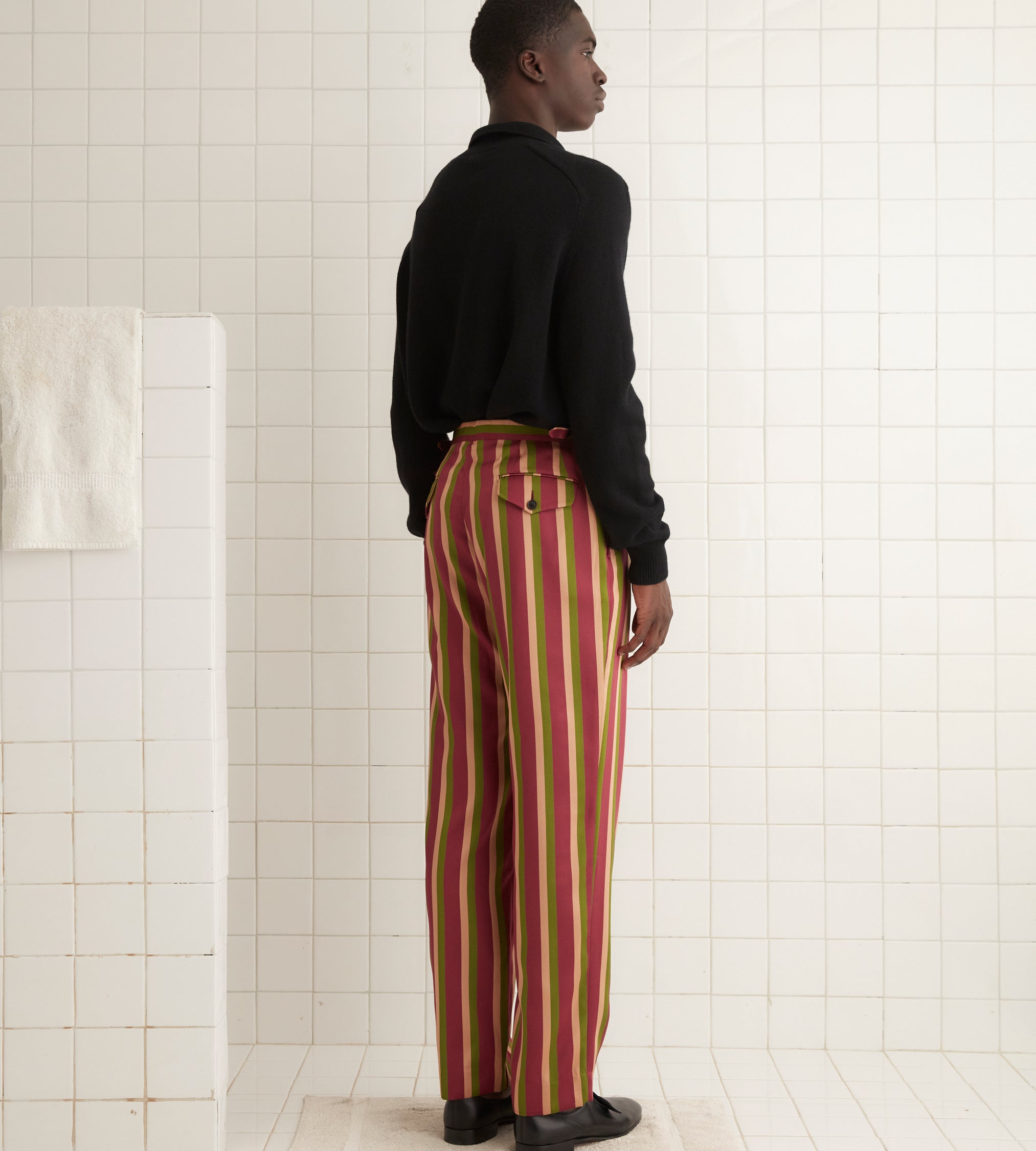 These trousers are inspired by Kutnu fabric. Kutnu is historically woven in Gaziantep in Southern Turkey. Rendered in satin with silk warp and cotton weft thread, this striped trouser is known for its distinctive shimmer. The silhouette is that of a traditional trouser—high rise, straight leg.