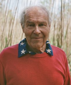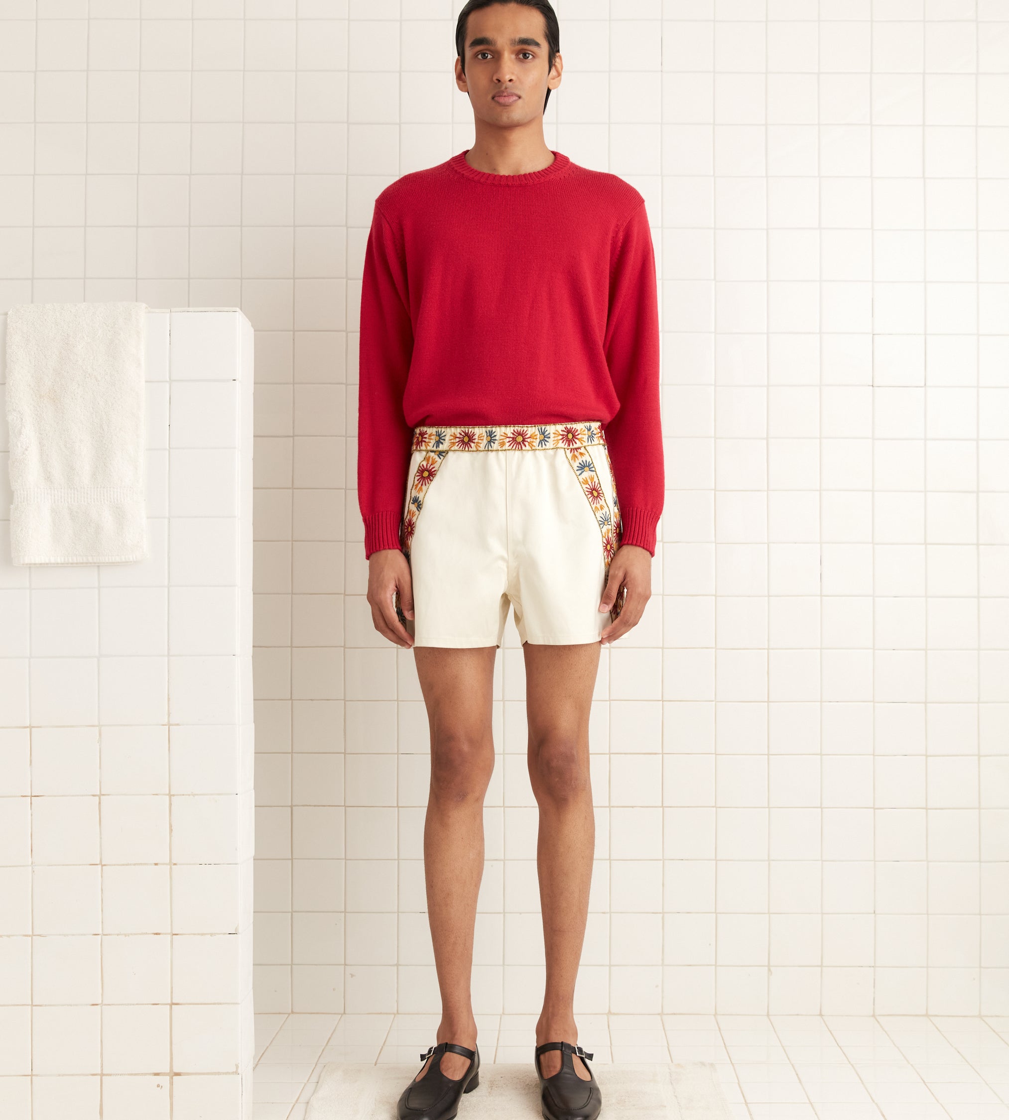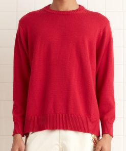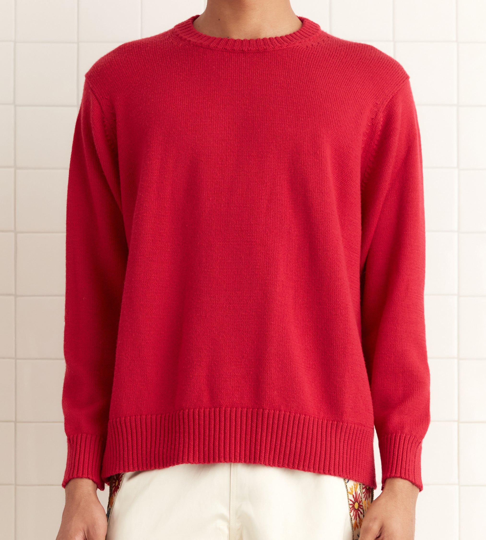 This style is a reproduction of a 1960s sweater. It features ribbed detailing around the collar, cuffs, and hem. The sweater is made from washable merino wool.