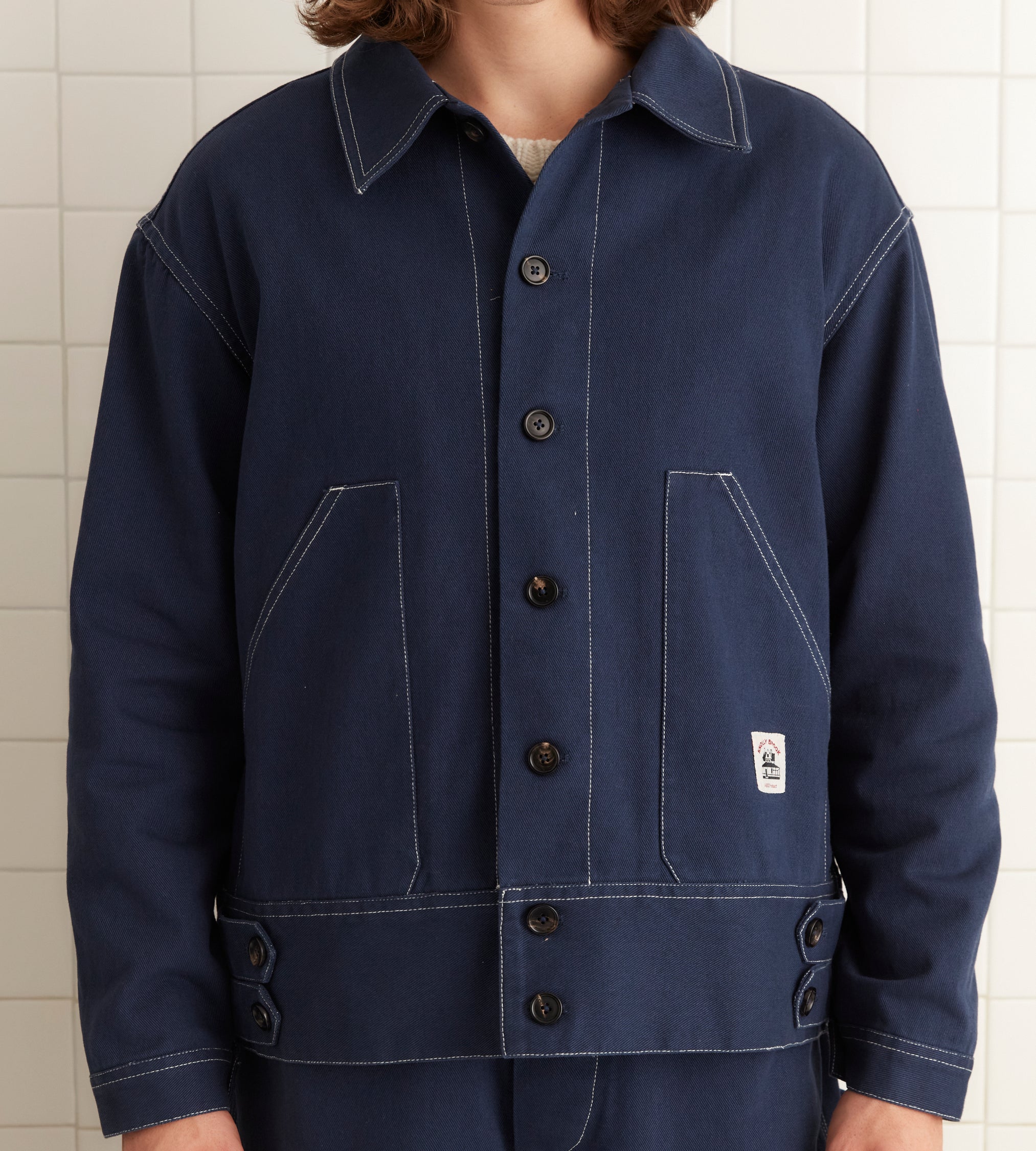 This jacket is inspired by a workwear jacket from the 1960s. We reproduced the silhouette for this style. The jacket features “Knolly Brook, a Bode Product” tags inspired by classic workwear labels.