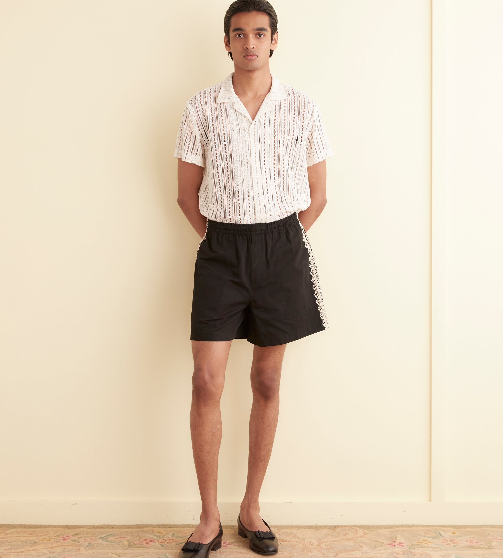 These shorts are inspired by machine lace from the 20th century, which we reproduced for this style. The lace is hand-stitched down the side seam. The shorts have a classic rugby silhouette, with a short inseam and a wide leg opening.