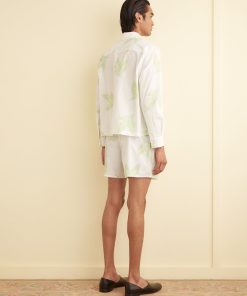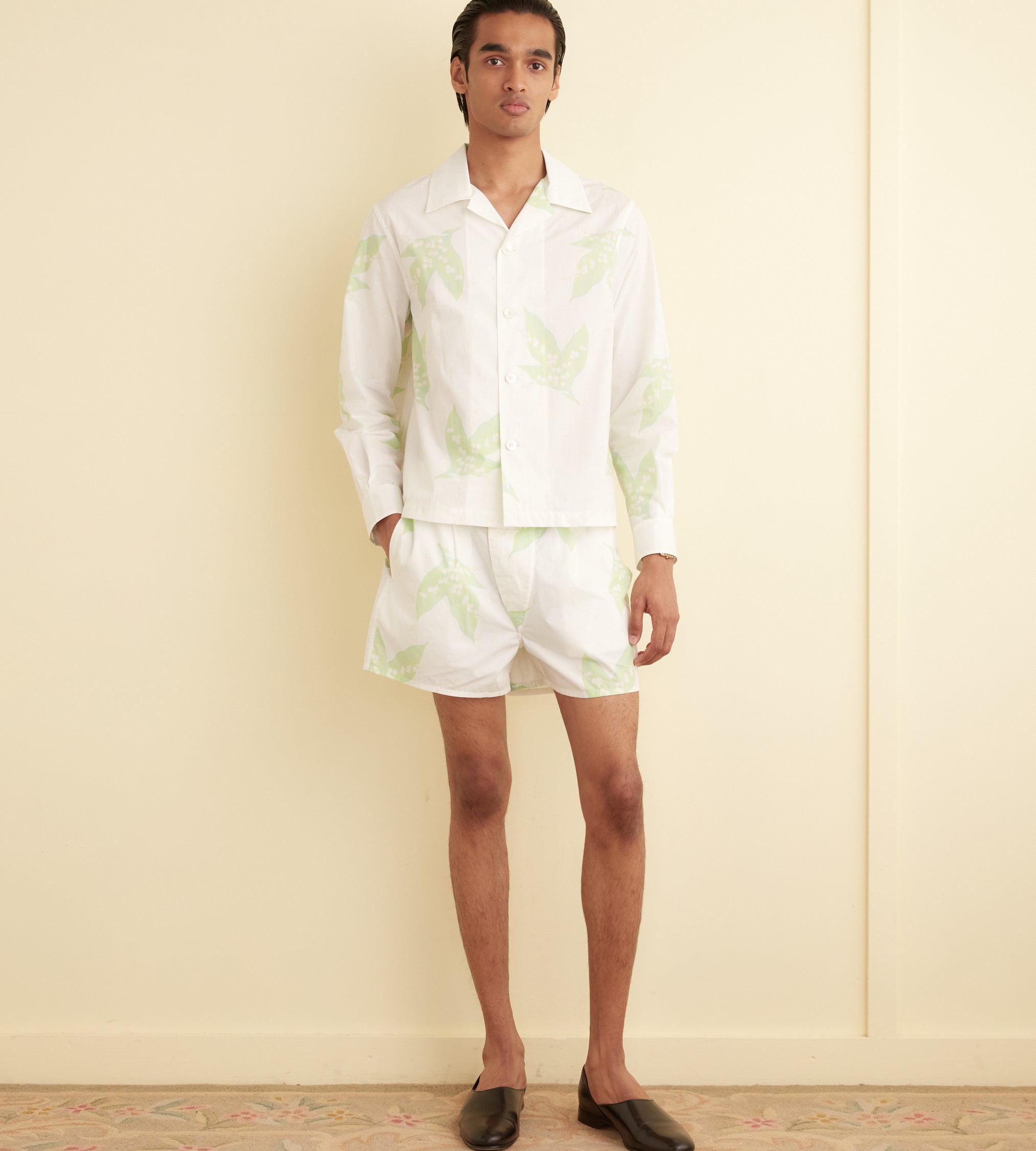 These boxers are inspired by a fabric swatch from the 1950s-1960s. The fabric features a pale green lily-of-the-valley print, replicated from the original material.
