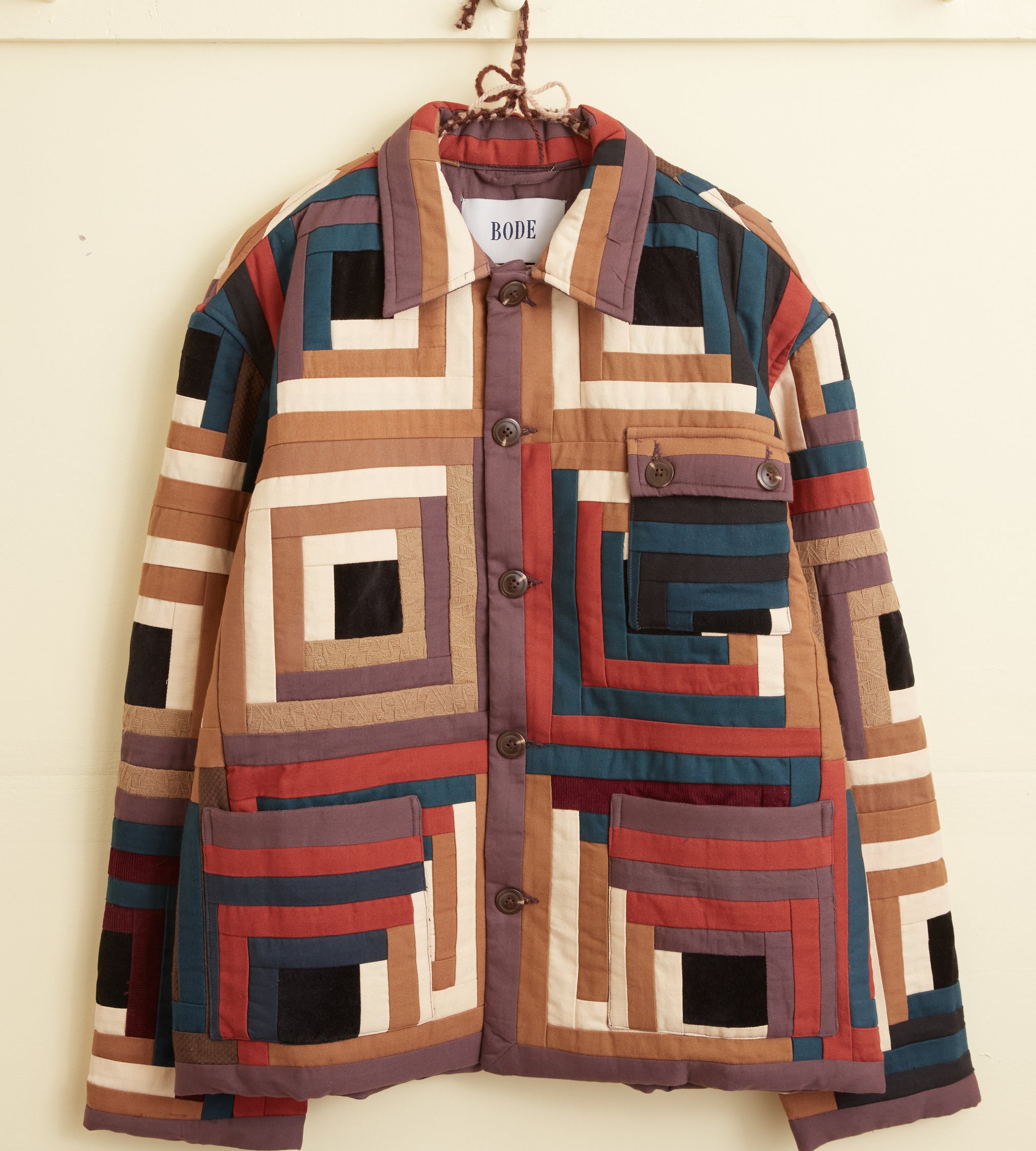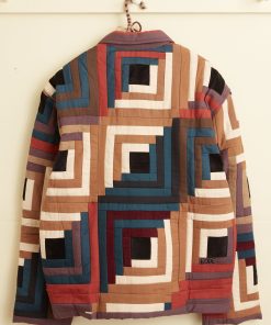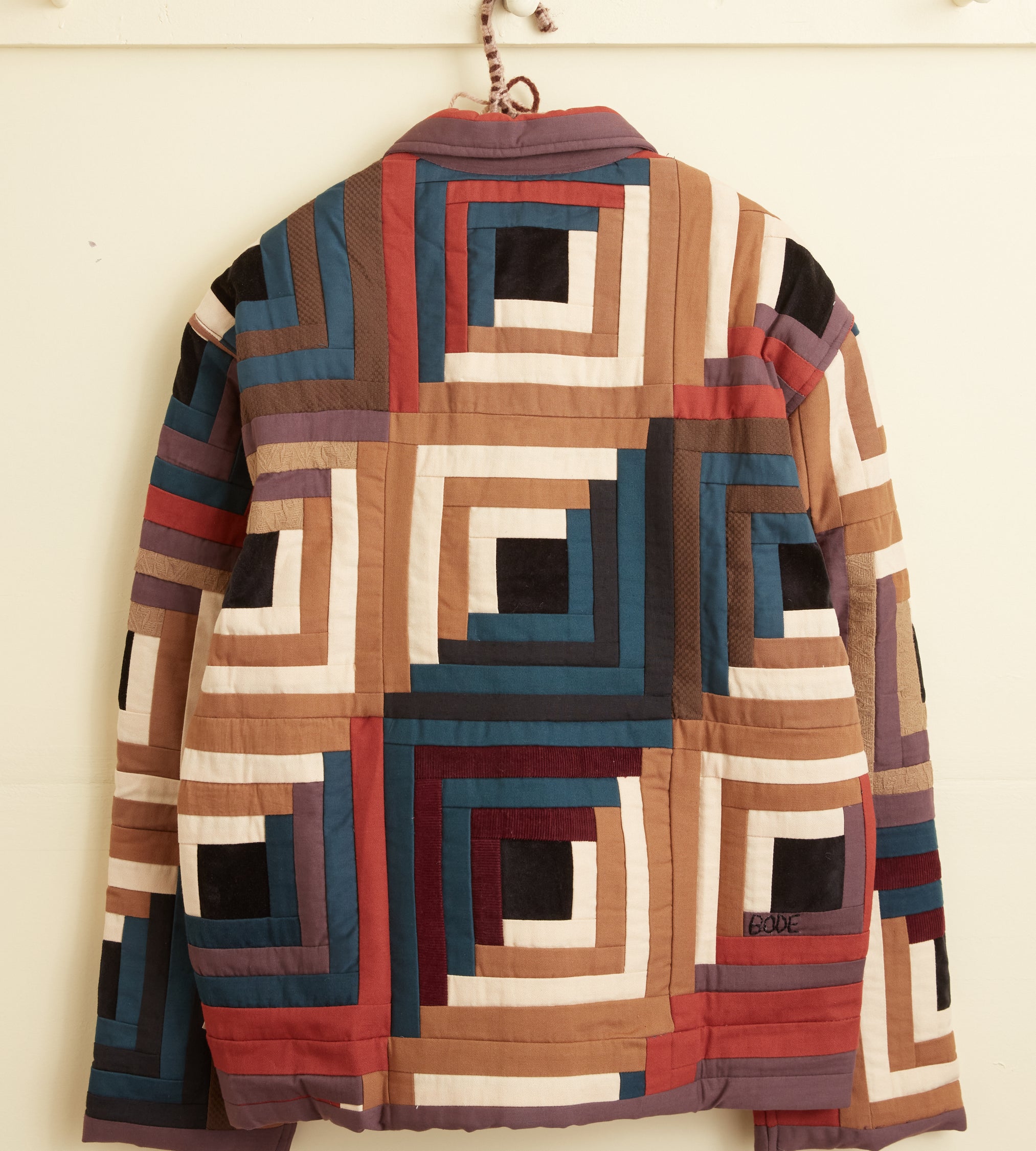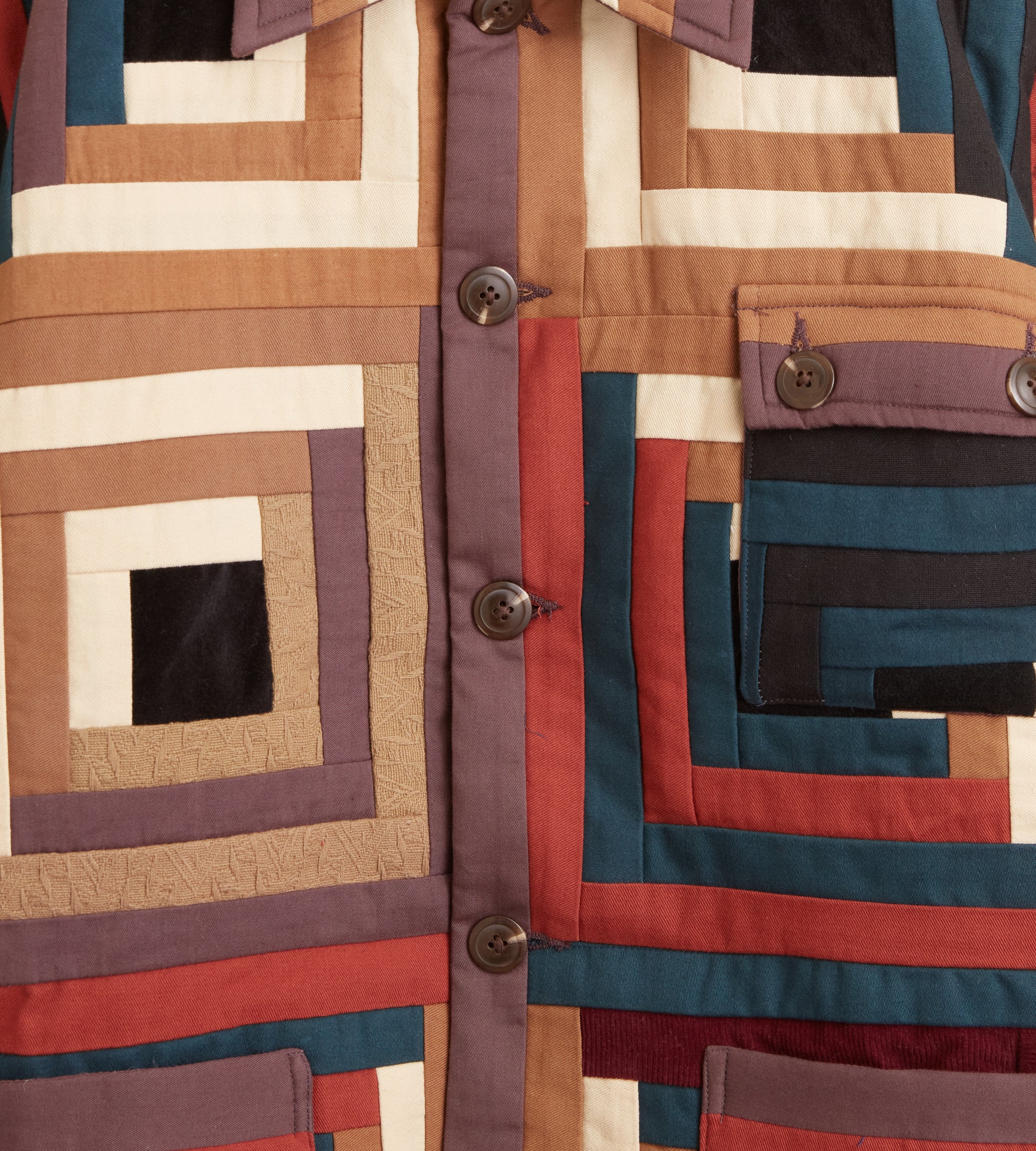 This workwear jacket is inspired by a Log Cabin quilt, circa 1890s. The Log Cabin quilt is a quintessential American quilt pattern that rose to popularity in the latter half of the 19th century.