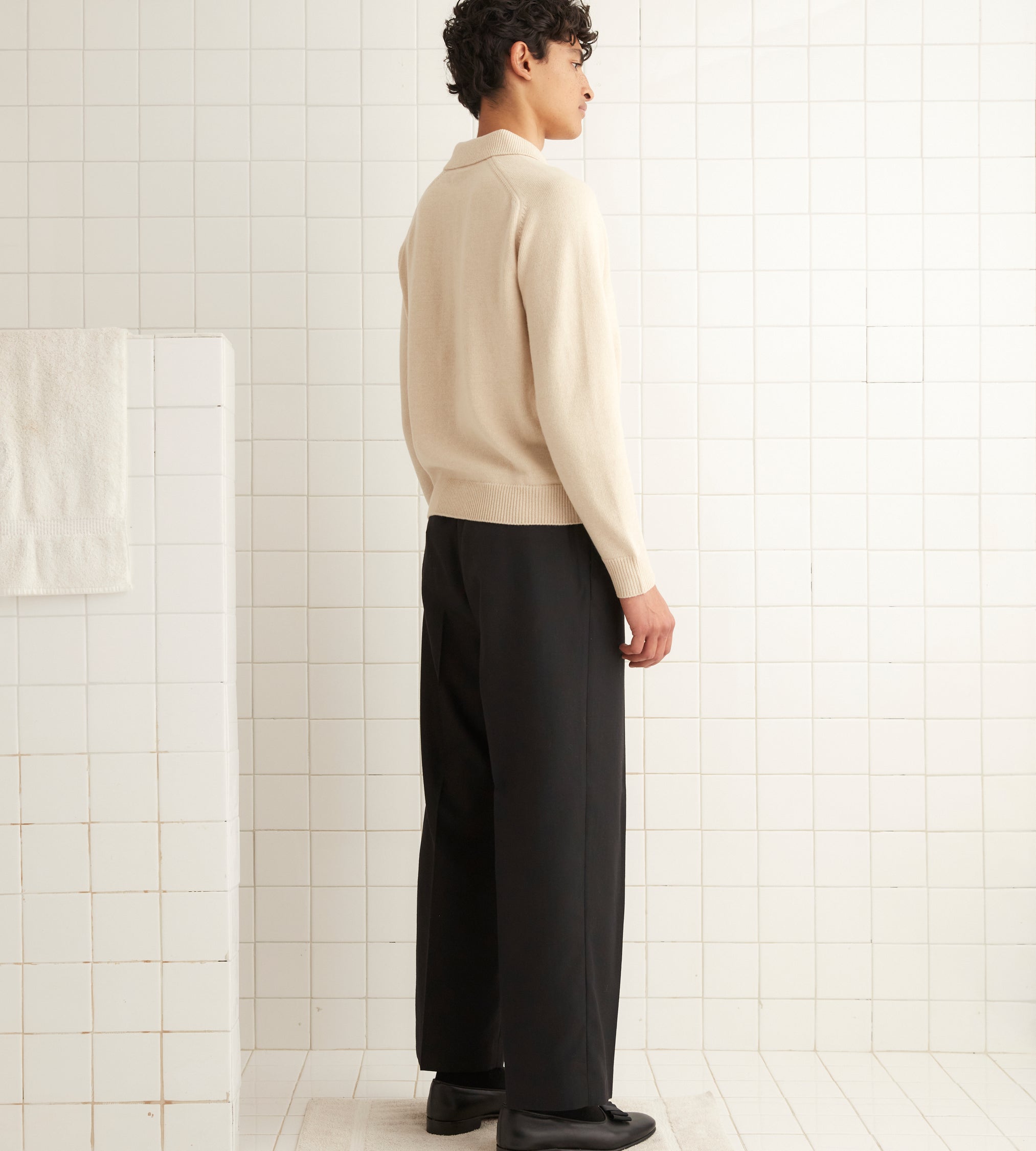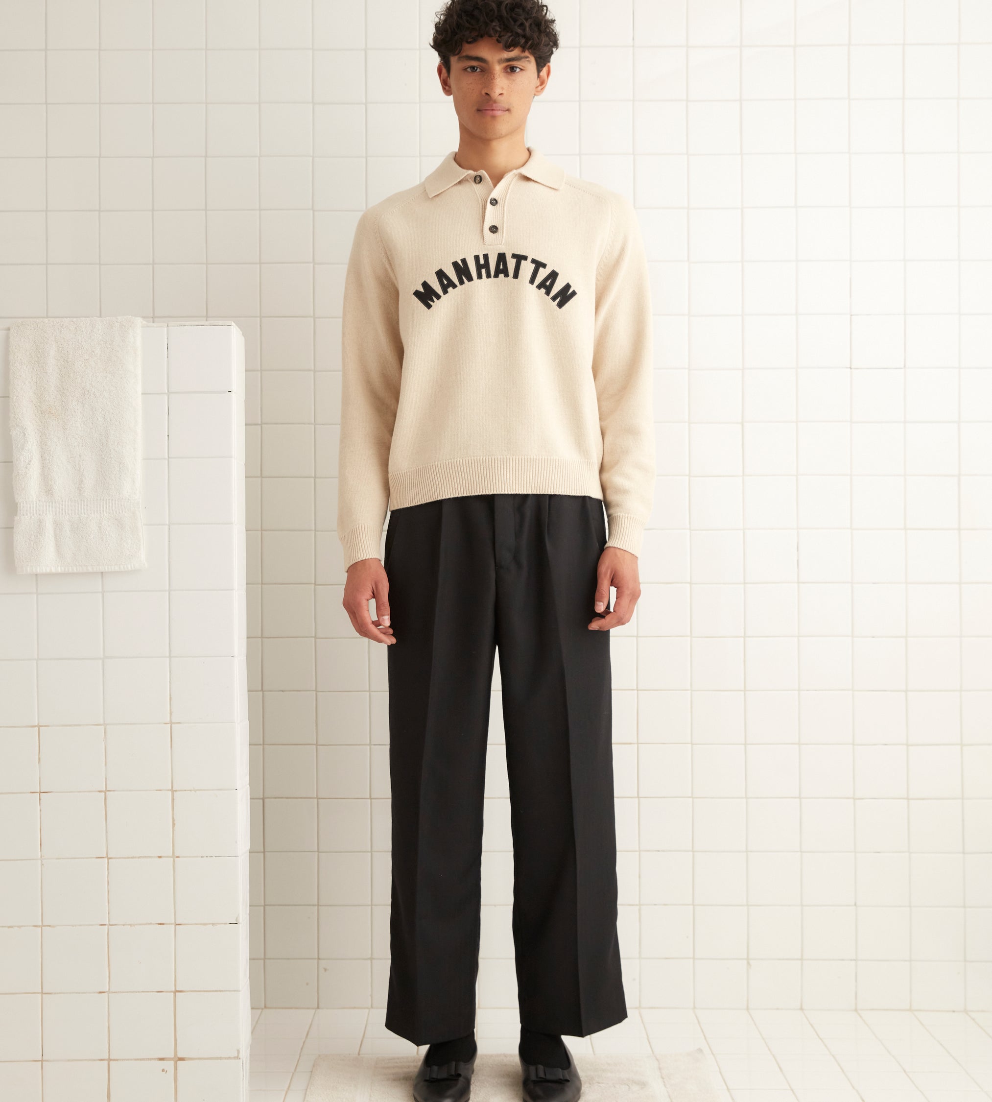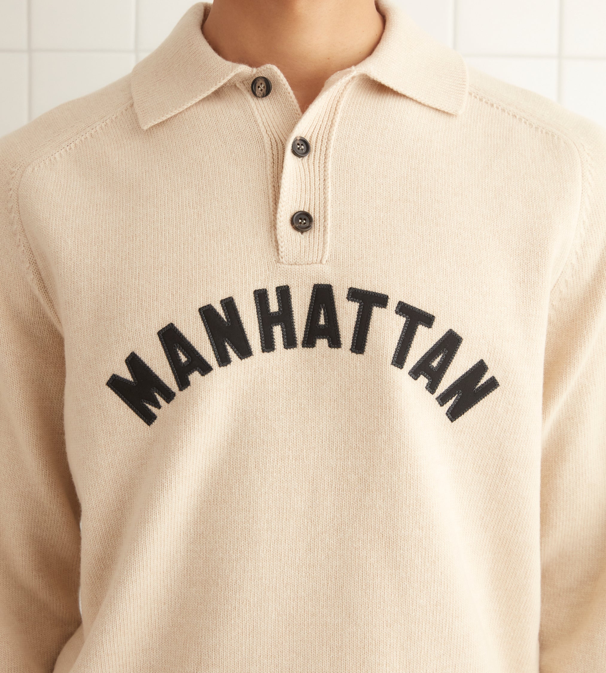 This polo sweater is inspired by a basketball uniform from the 1920s-1930s. We reproduced the color scheme and appliquéd lettering for this style.