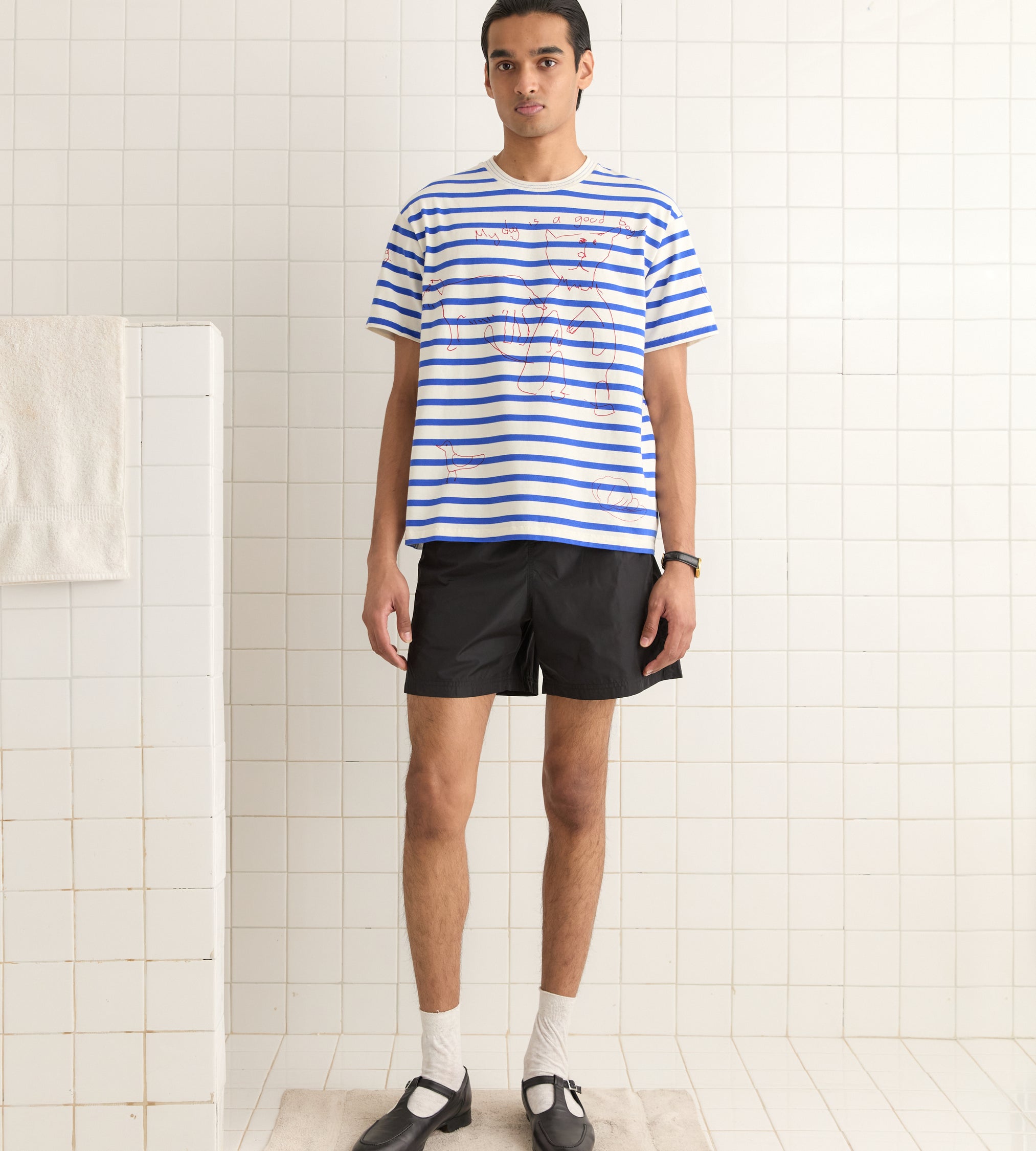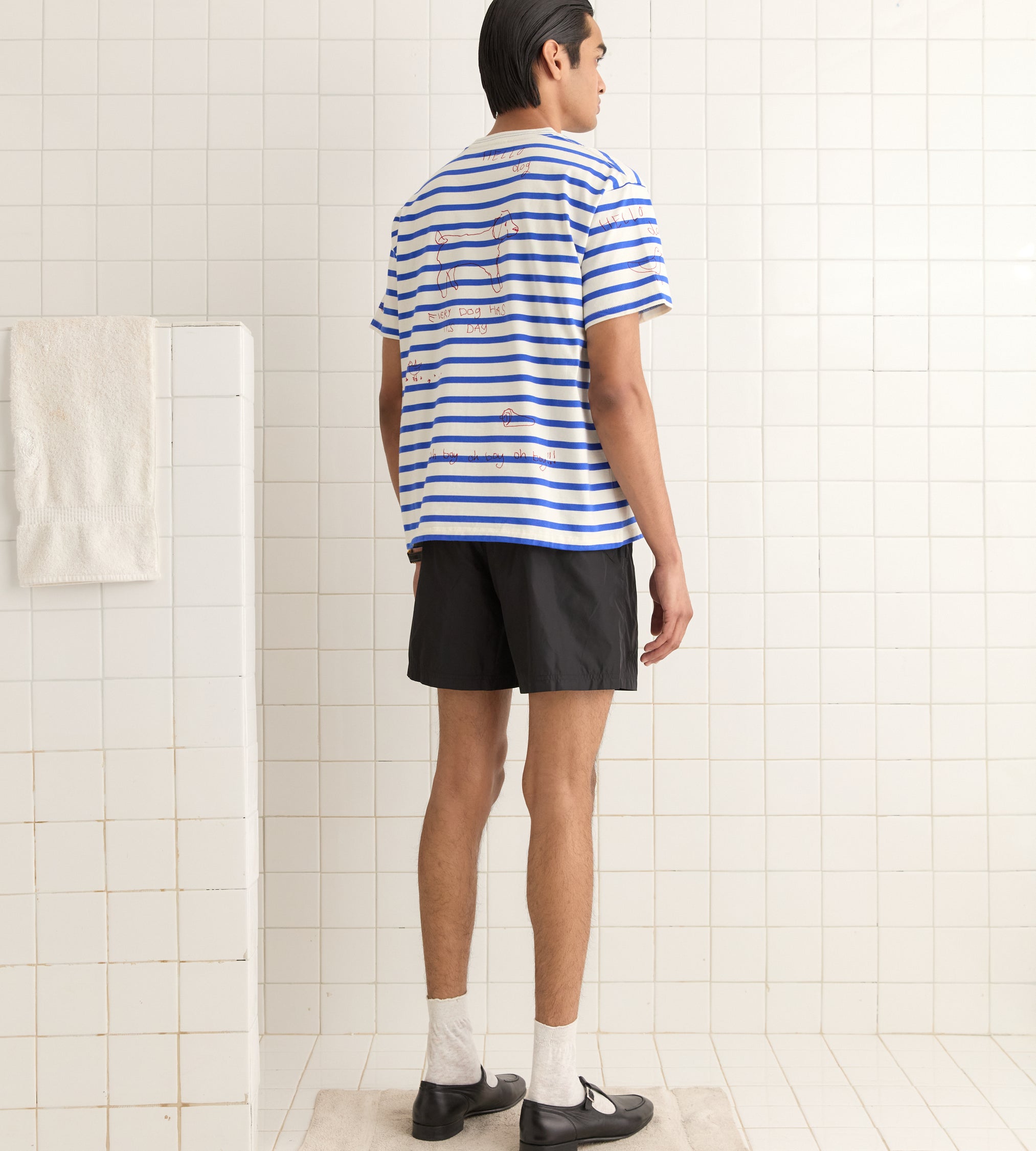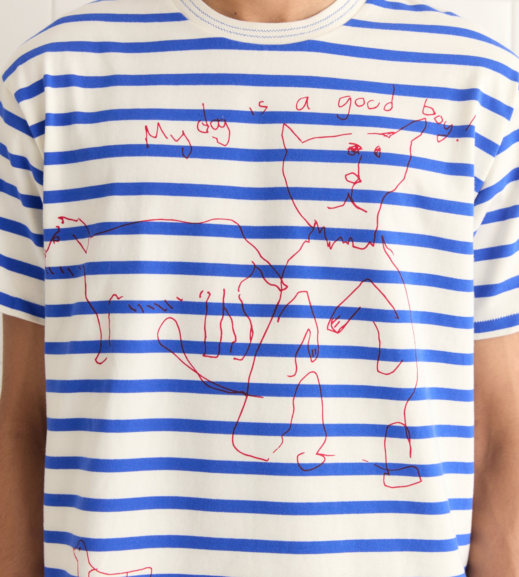 This tee is inspired by a marinière from the French Navy, dating between 1950 and 1953. The sailor who owned it had drawn illustrations all over the shirt. We reproduced the hand drawings for this style.