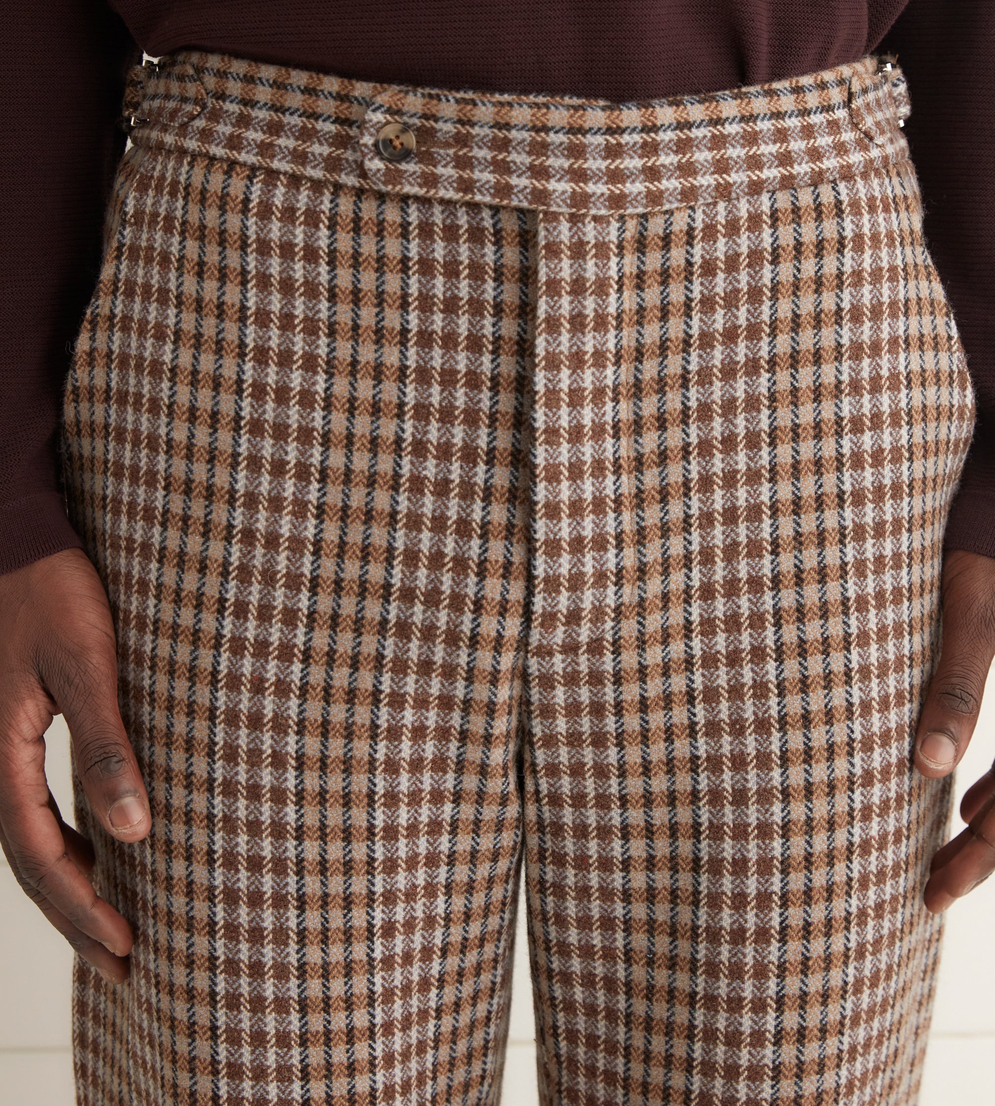 These trousers are inspired by men’s suiting from the 1950s-1960s. We reproduced the silhouette in brown and black herringbone tweed. The trousers have a mid-rise and a straight leg.