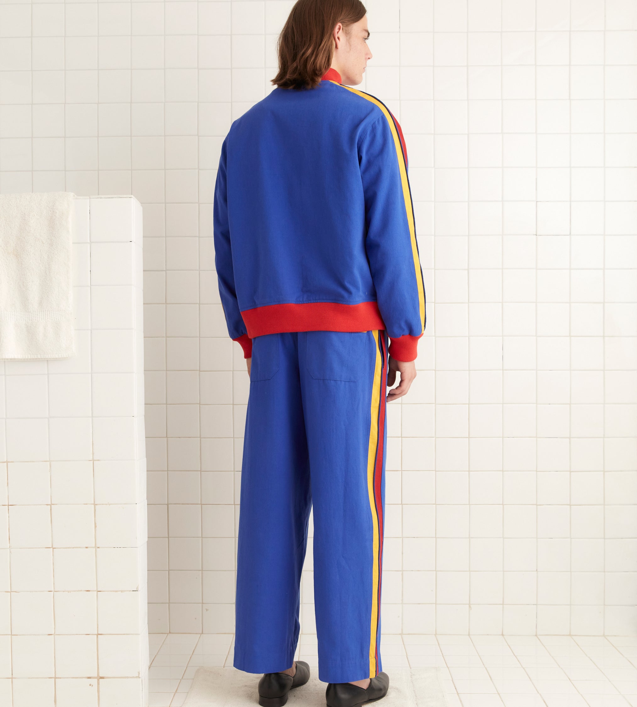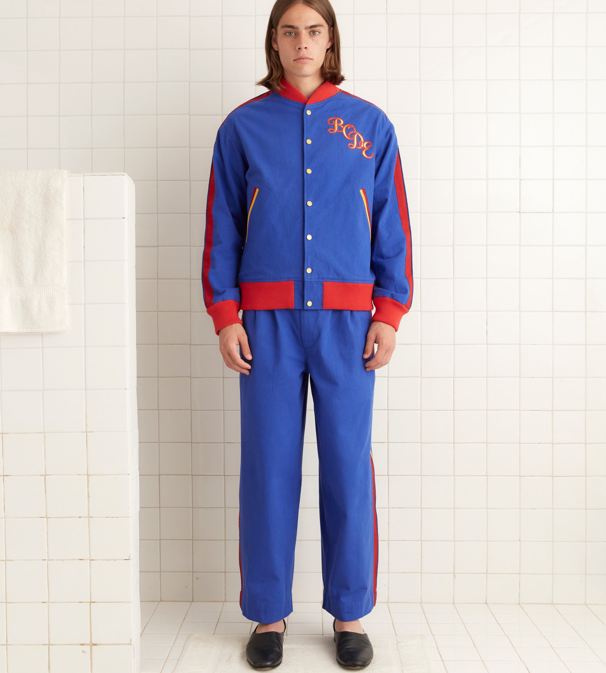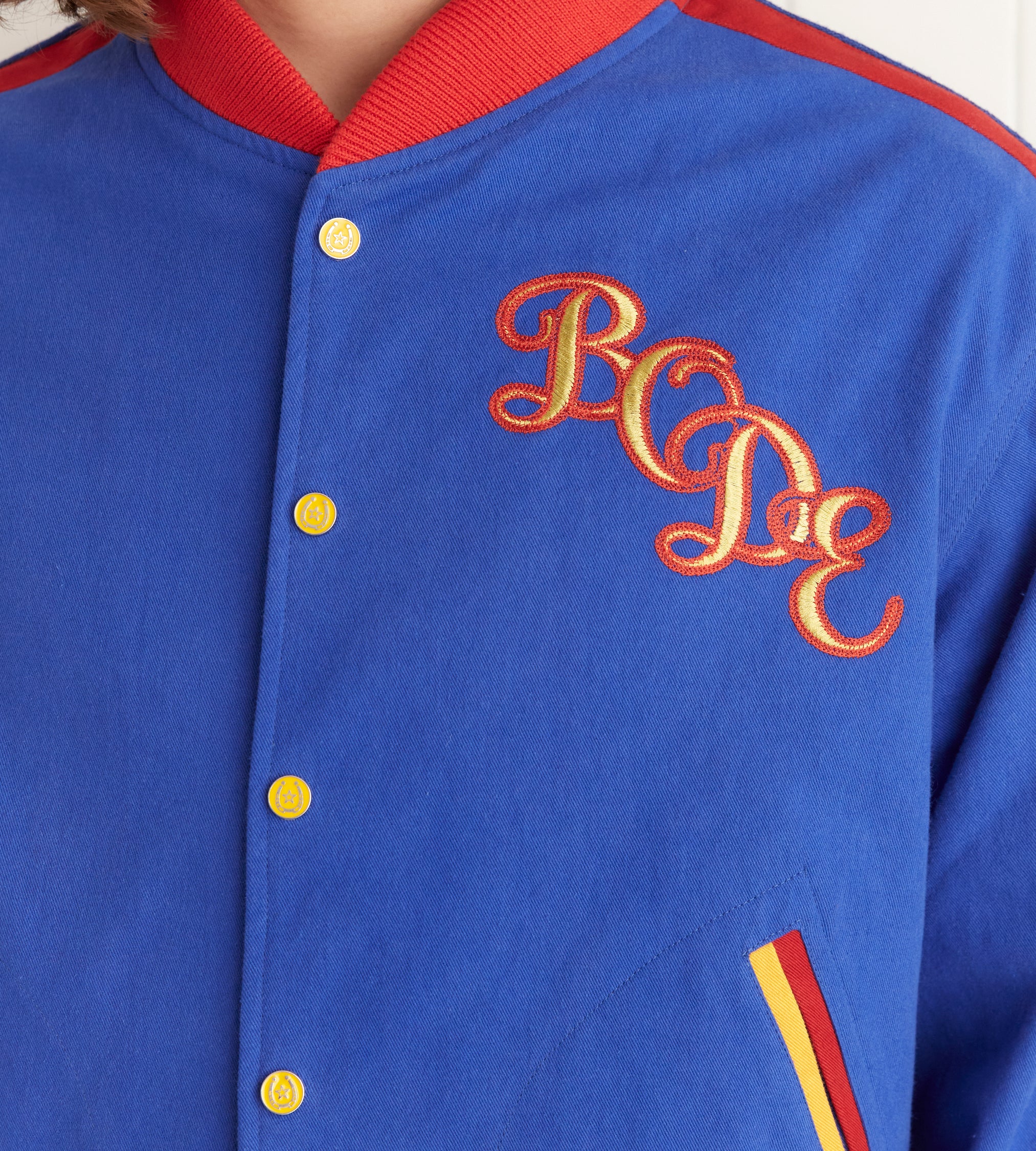 This piece is a recreation of a 1960s varsity jacket. We reproduced the silhouette, with its knit cuffs, collar, and hem, for this style. It features appliquéd red and yellow stripes down the sleeves and welt pockets, with an embroidered “Bode” on the front.
