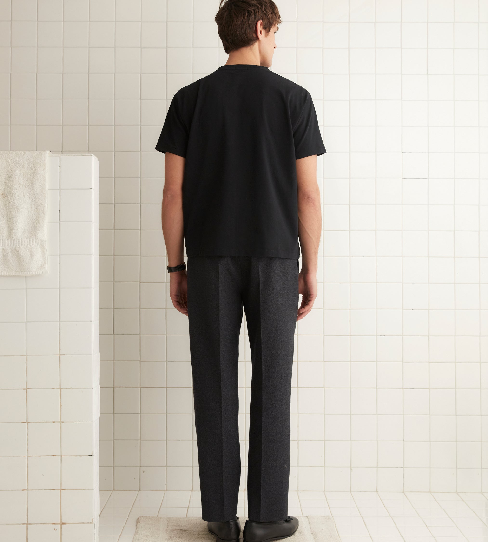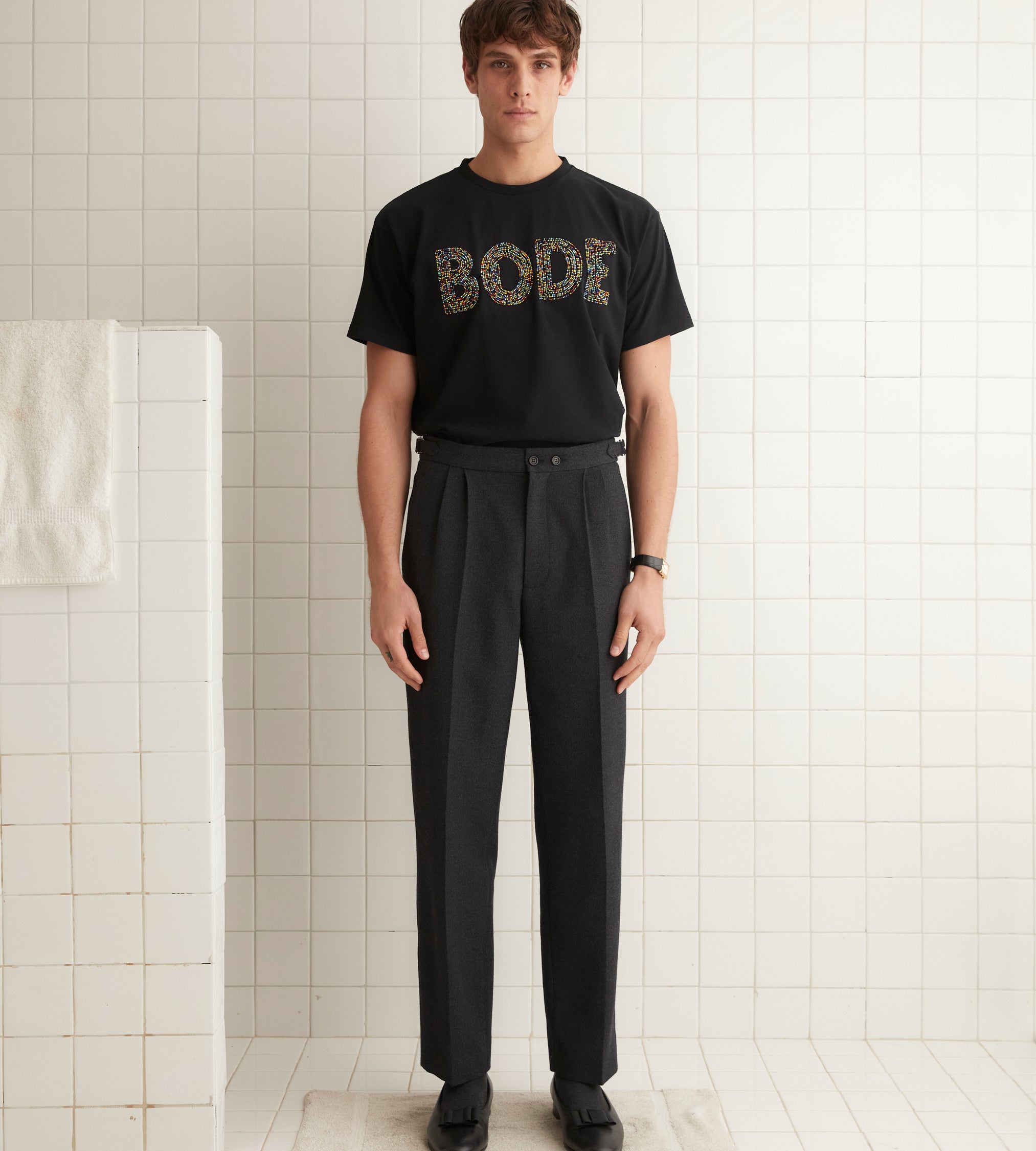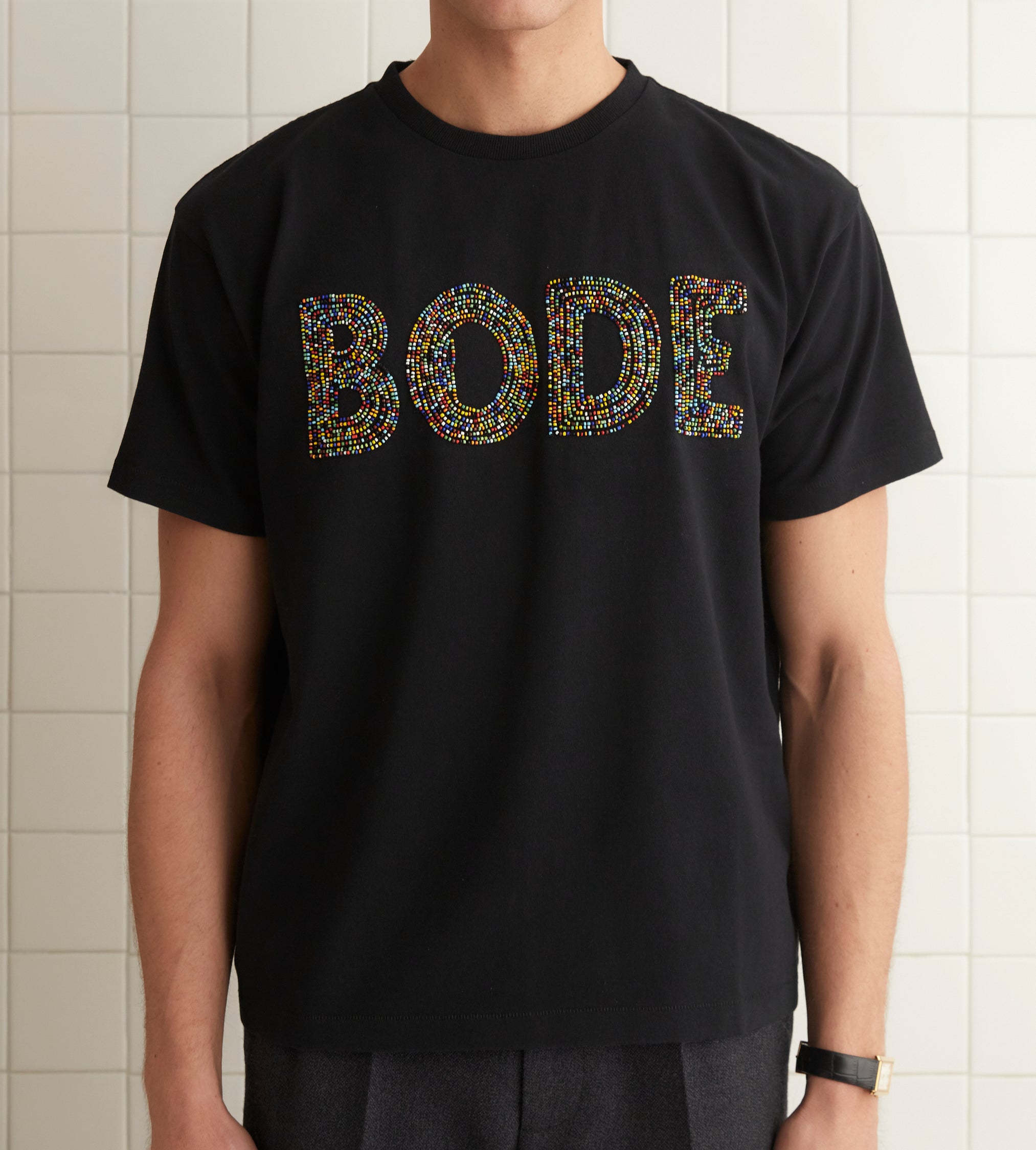This tee is inspired by children’s novelty t-shirts, circa 1960s. It features a beaded, multicolored “Bode” across the front.