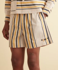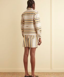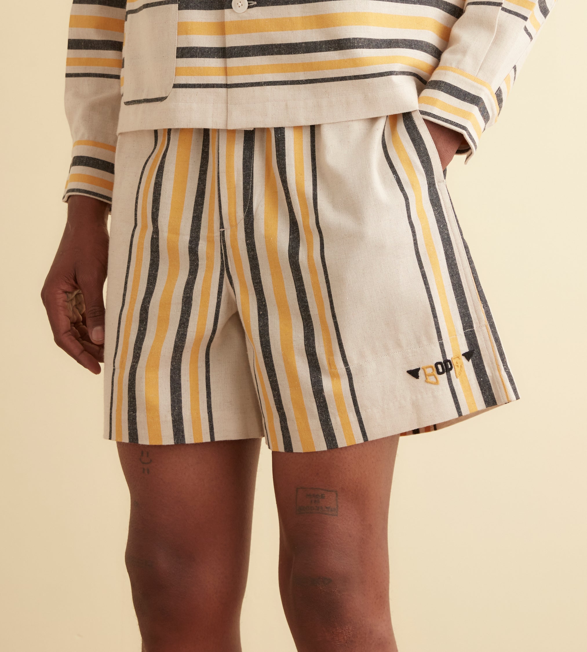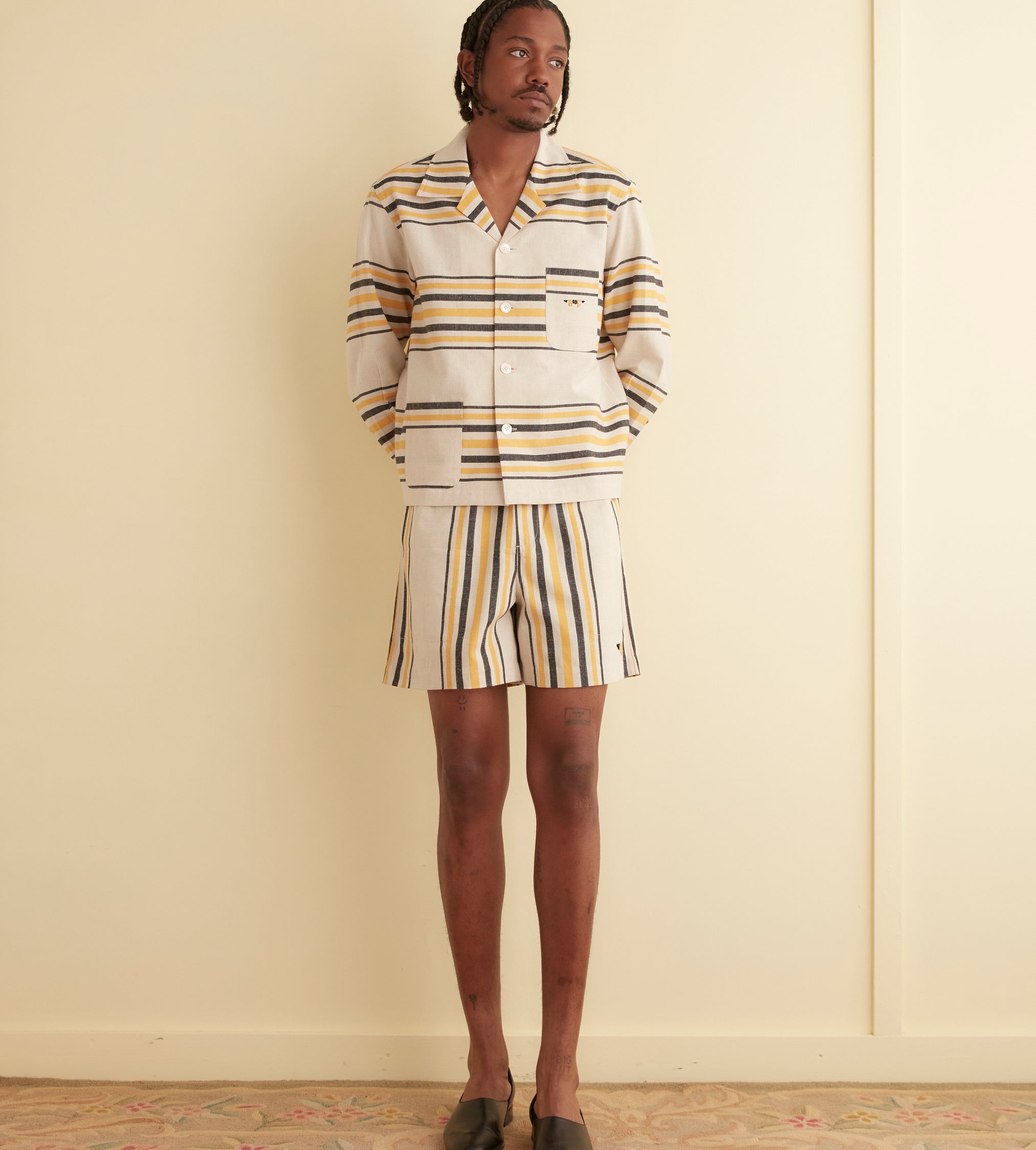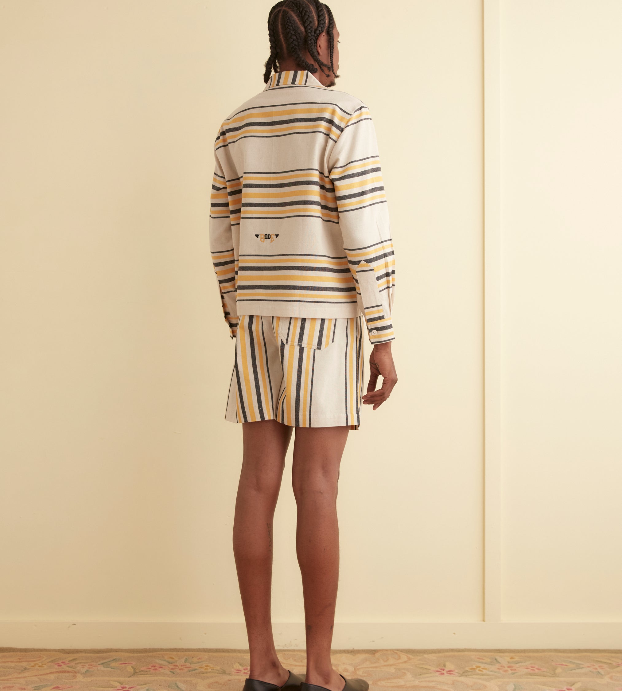 These shorts are inspired by a French kitchen towel, circa 1930s-1940s. We reproduced the fabric for this style. The shorts are cut in a traditional rugby silhouette, with a short inseam and a wide leg opening.