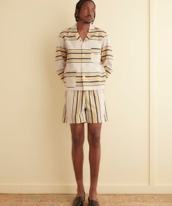 These shorts are inspired by a French kitchen towel, circa 1930s-1940s. We reproduced the fabric for this style. The shorts are cut in a traditional rugby silhouette, with a short inseam and a wide leg opening.