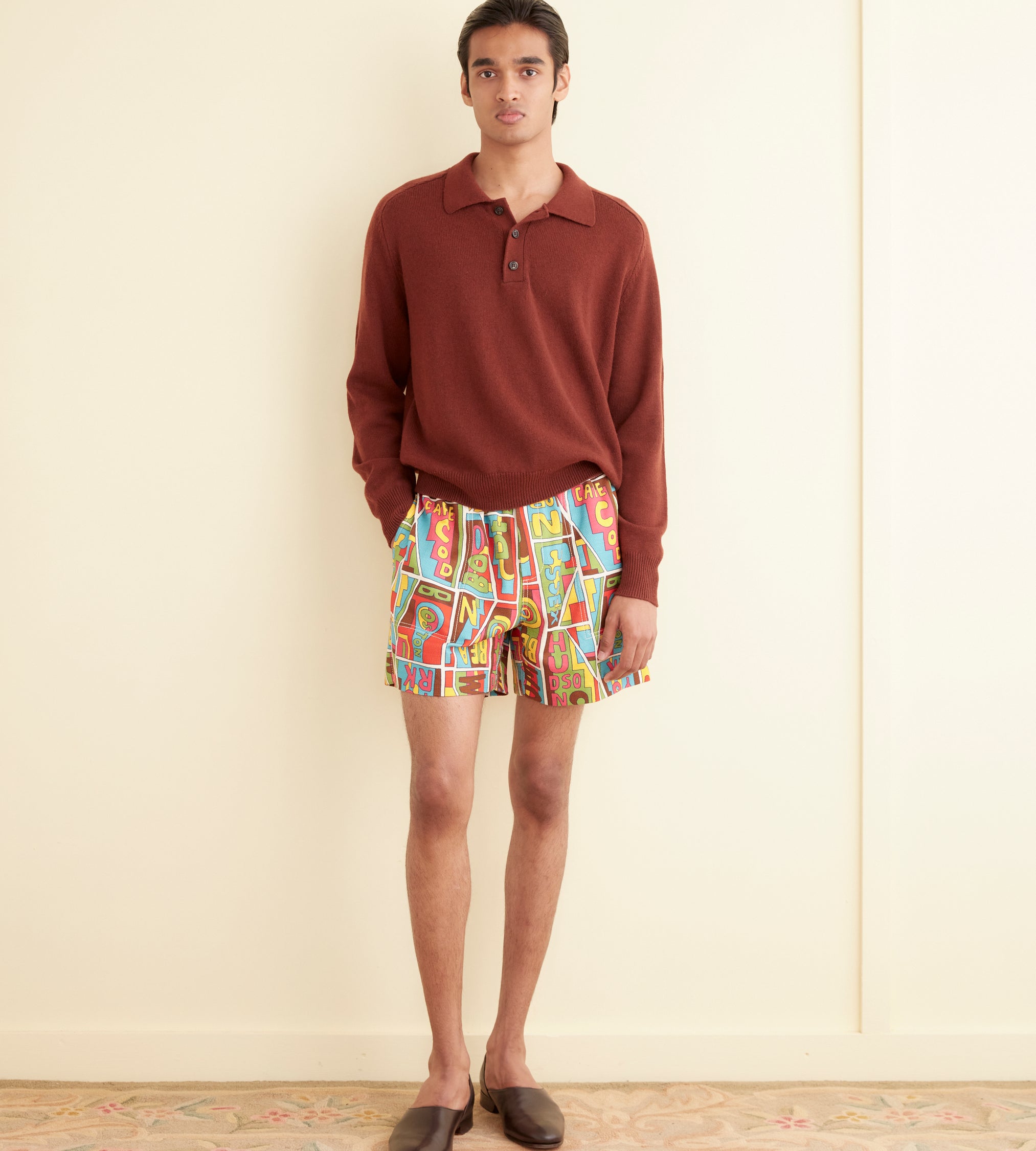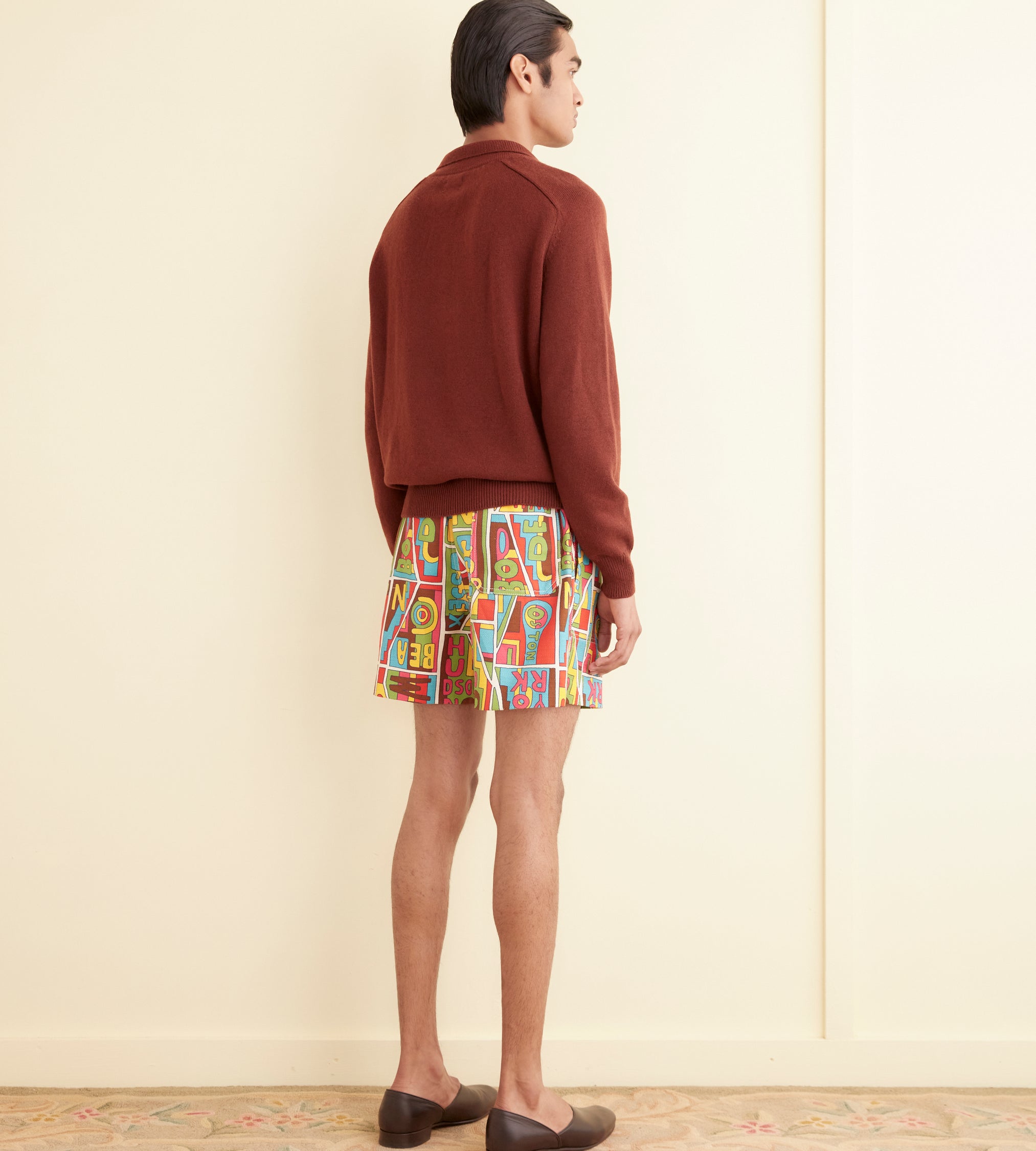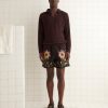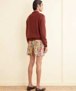 These shorts are inspired by vintage upholstery fabric from the 1960s-1970s. We reproduced the fabric for this style, incorporating “Bode” into the pattern. The shorts have a classic rugby silhouette, with a short inseam and wide leg opening.
