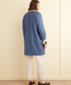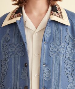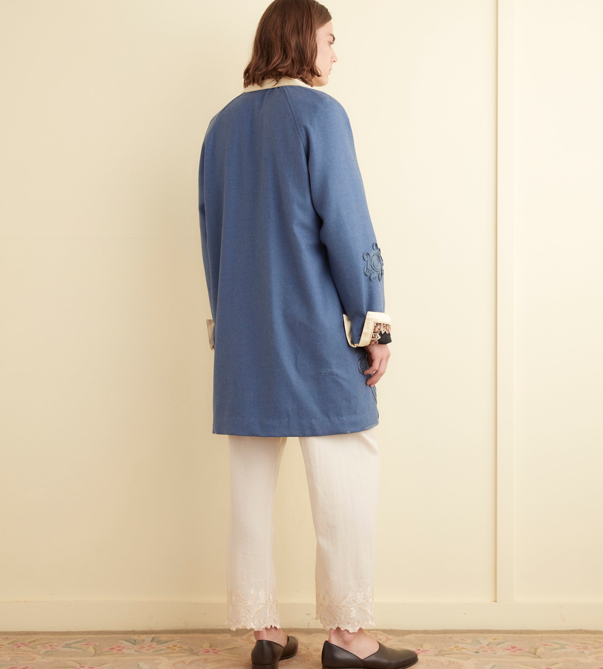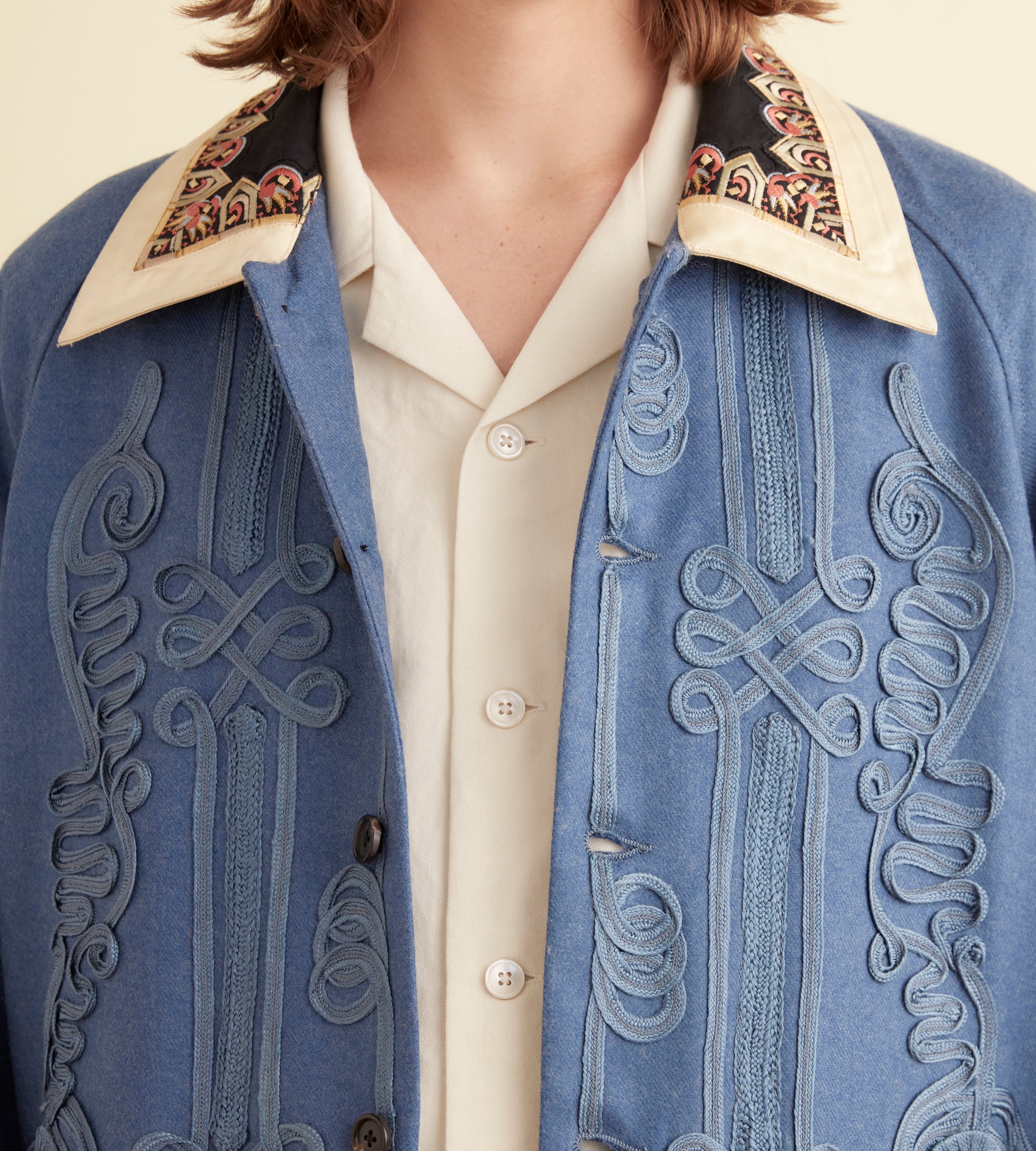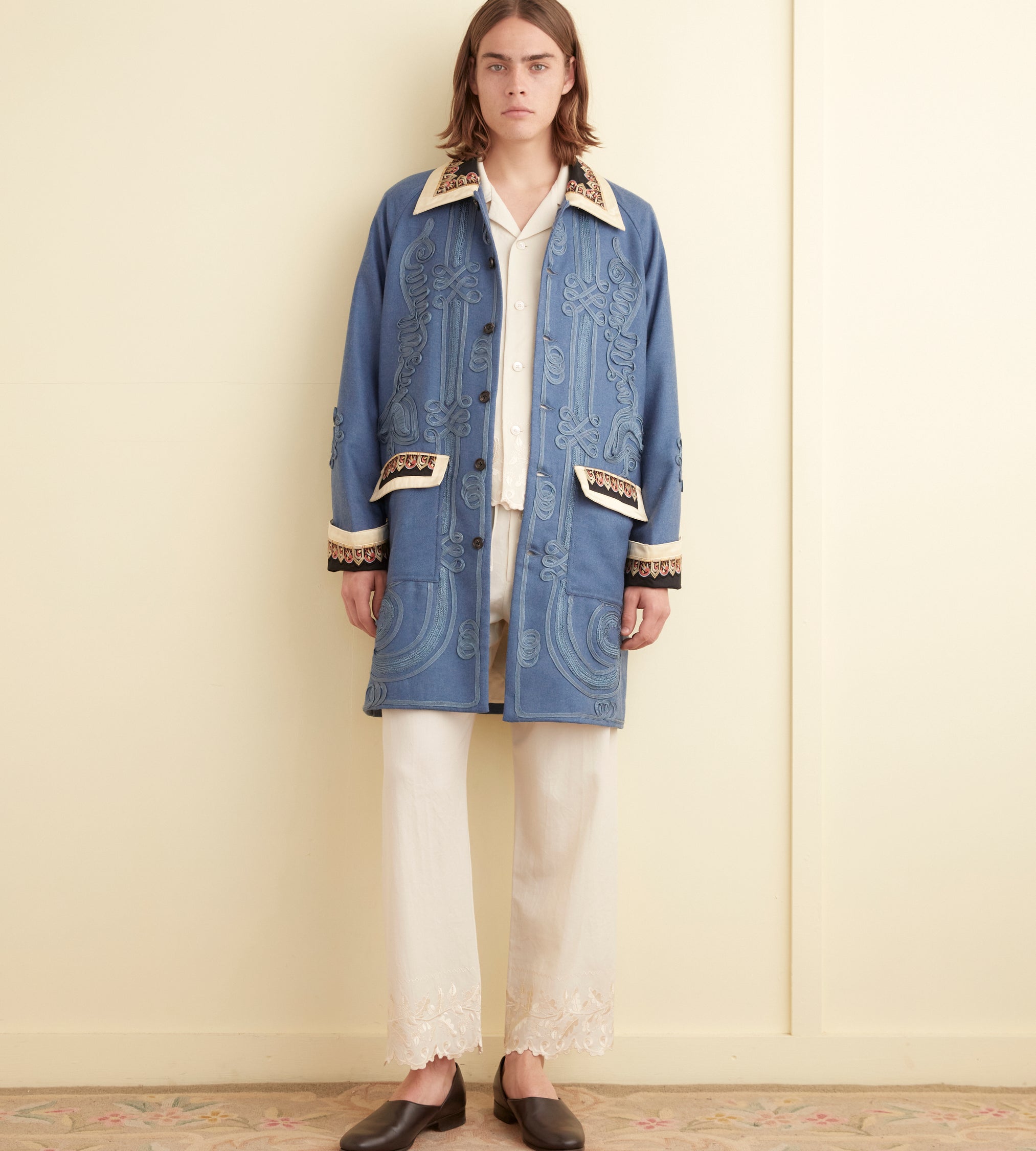 This coat is inspired by a 1920s opera coat. It is decorated with tonal blue soutache braid, a type of flat trim used to ornament clothing and military uniforms. The contrast collar and pockets are embroidered with geometric patterns, likely inspired by Eastern motifs.