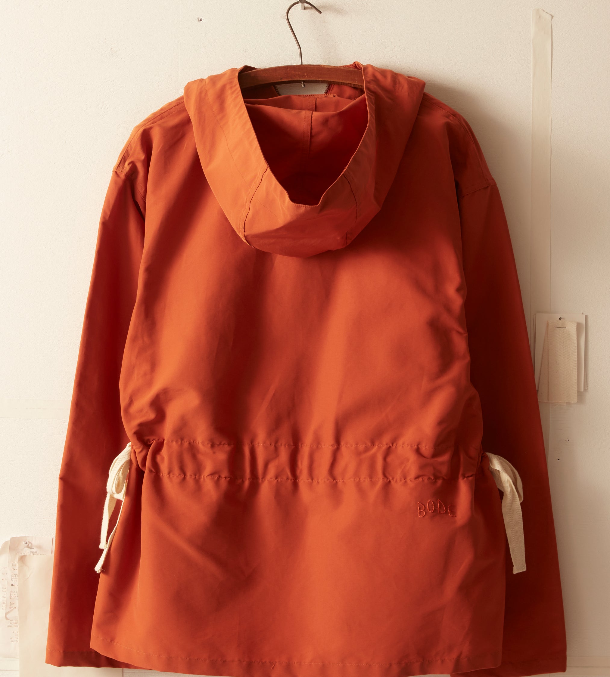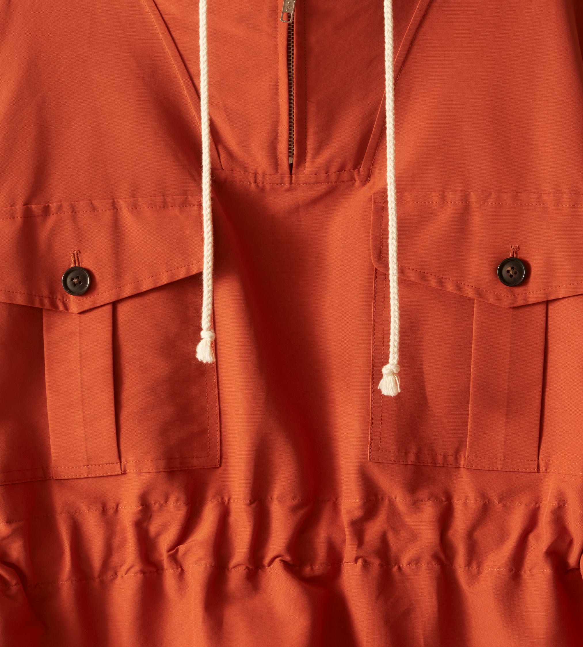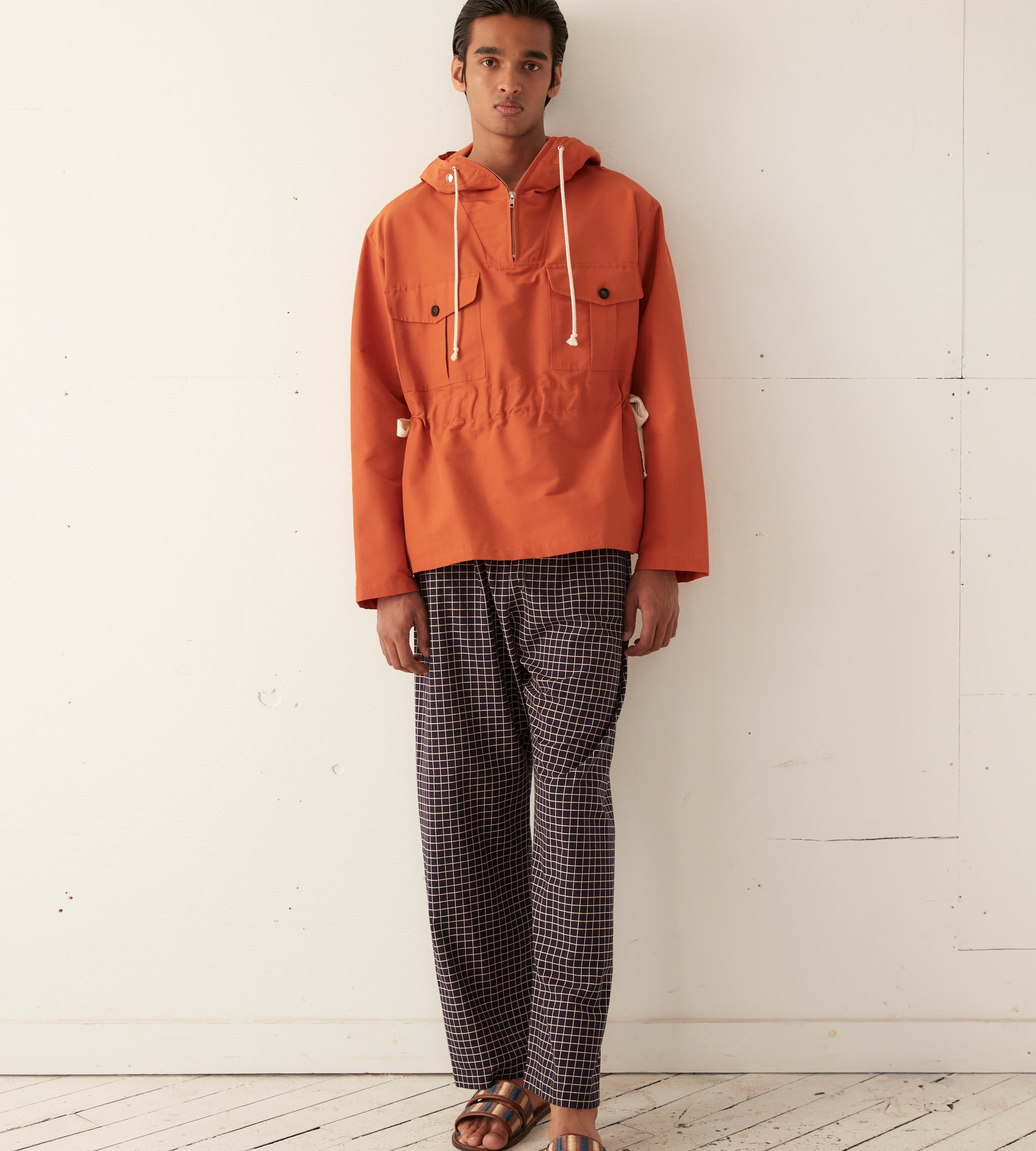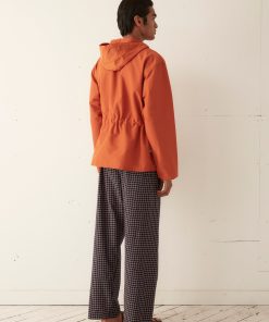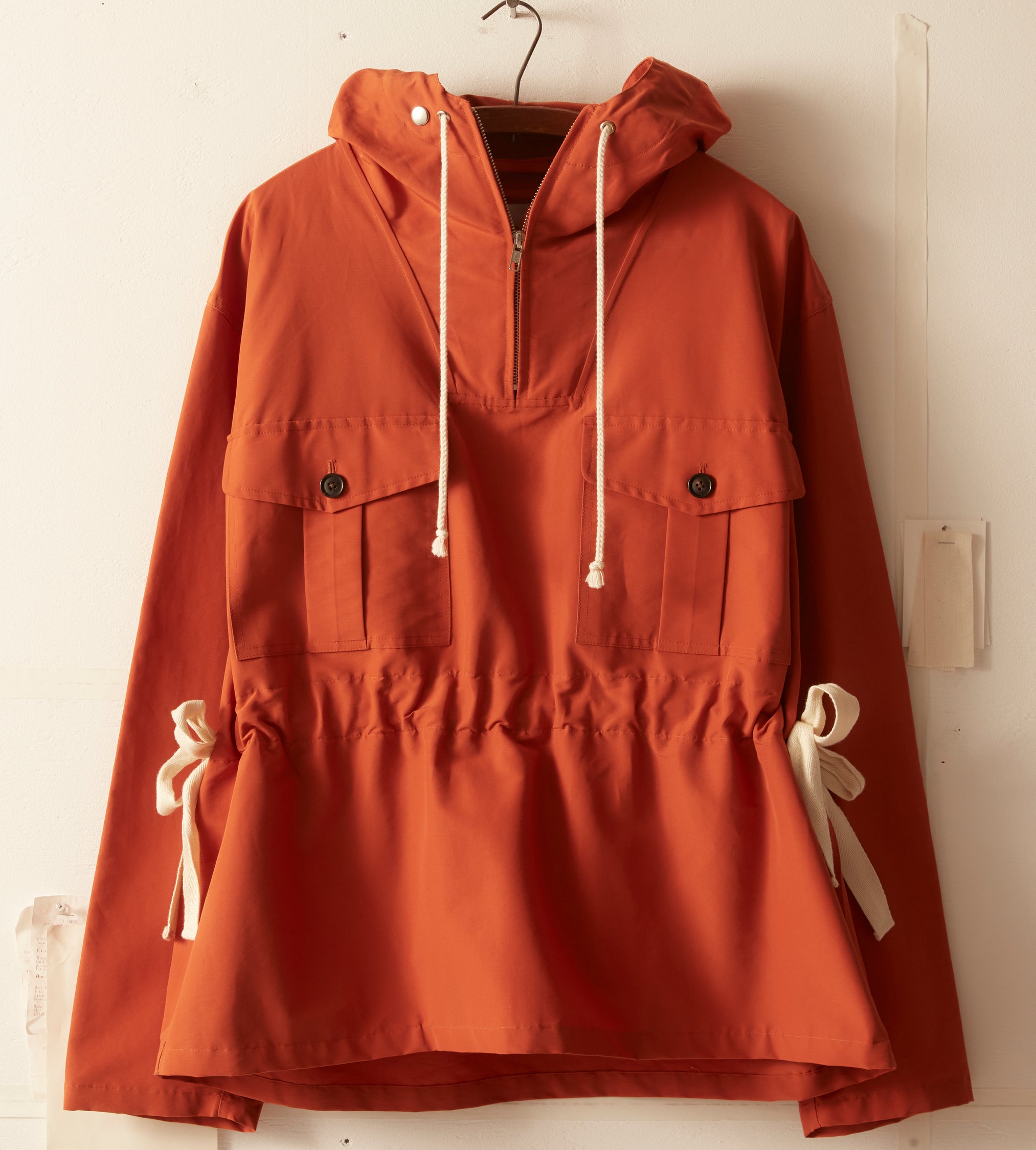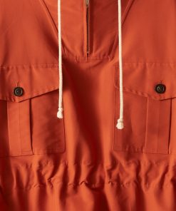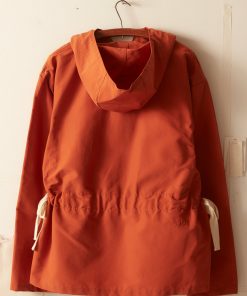 This jacket is inspired by a men’s hiking anorak, circa 1960s. This style is a reproduction of a pullover anorak—a favorite of alpinists, hikers, and outdoorsmen. The tightly woven nylon fabric provides protection from wind and light rain. The boxy shape can be adjusted with the twill side pulls.
