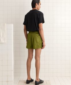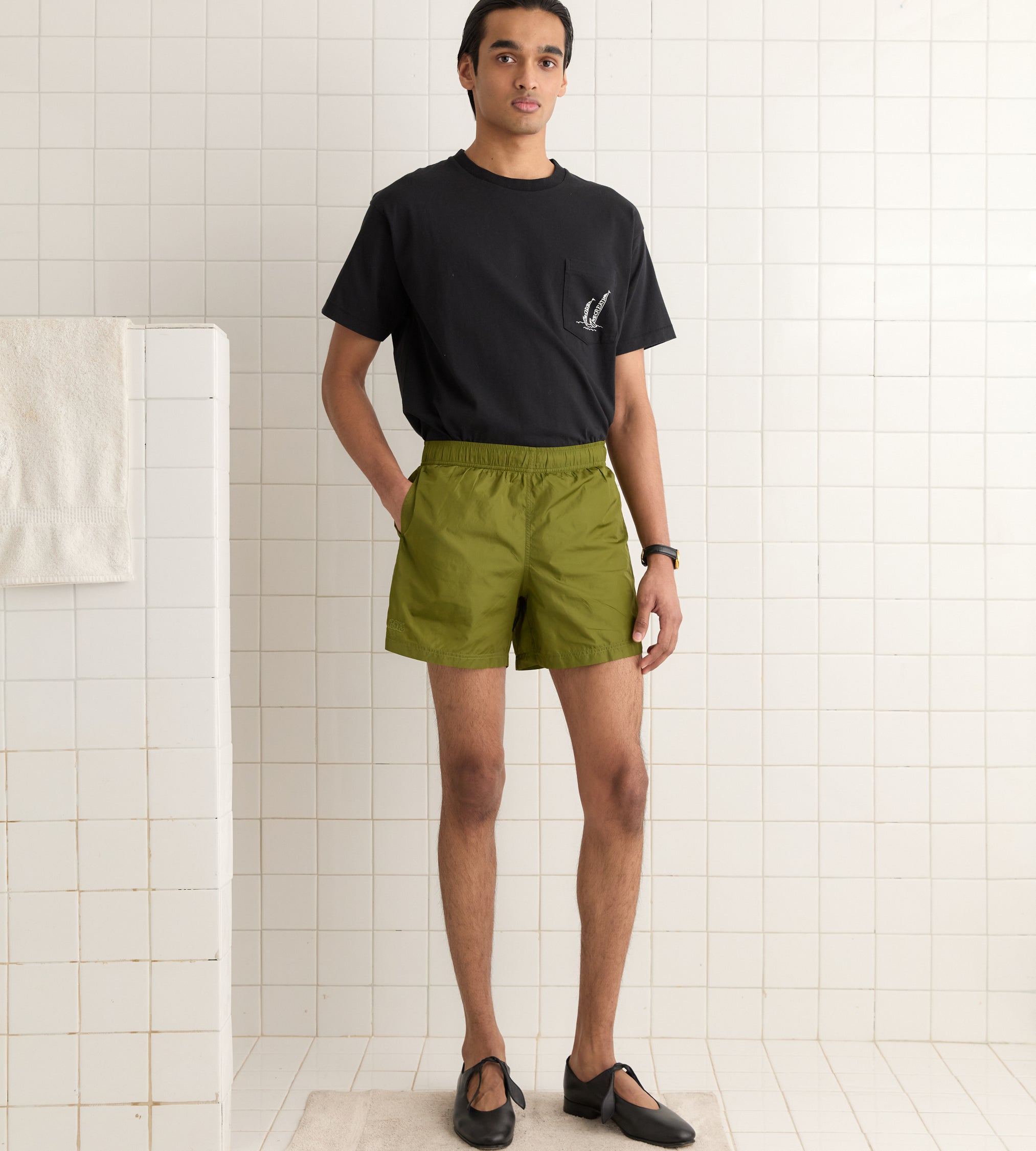 These track shorts are inspired by running shorts from the 1970s. We reproduced the silhouette in lightweight nylon with a “Bode” embroidery near the front hem.