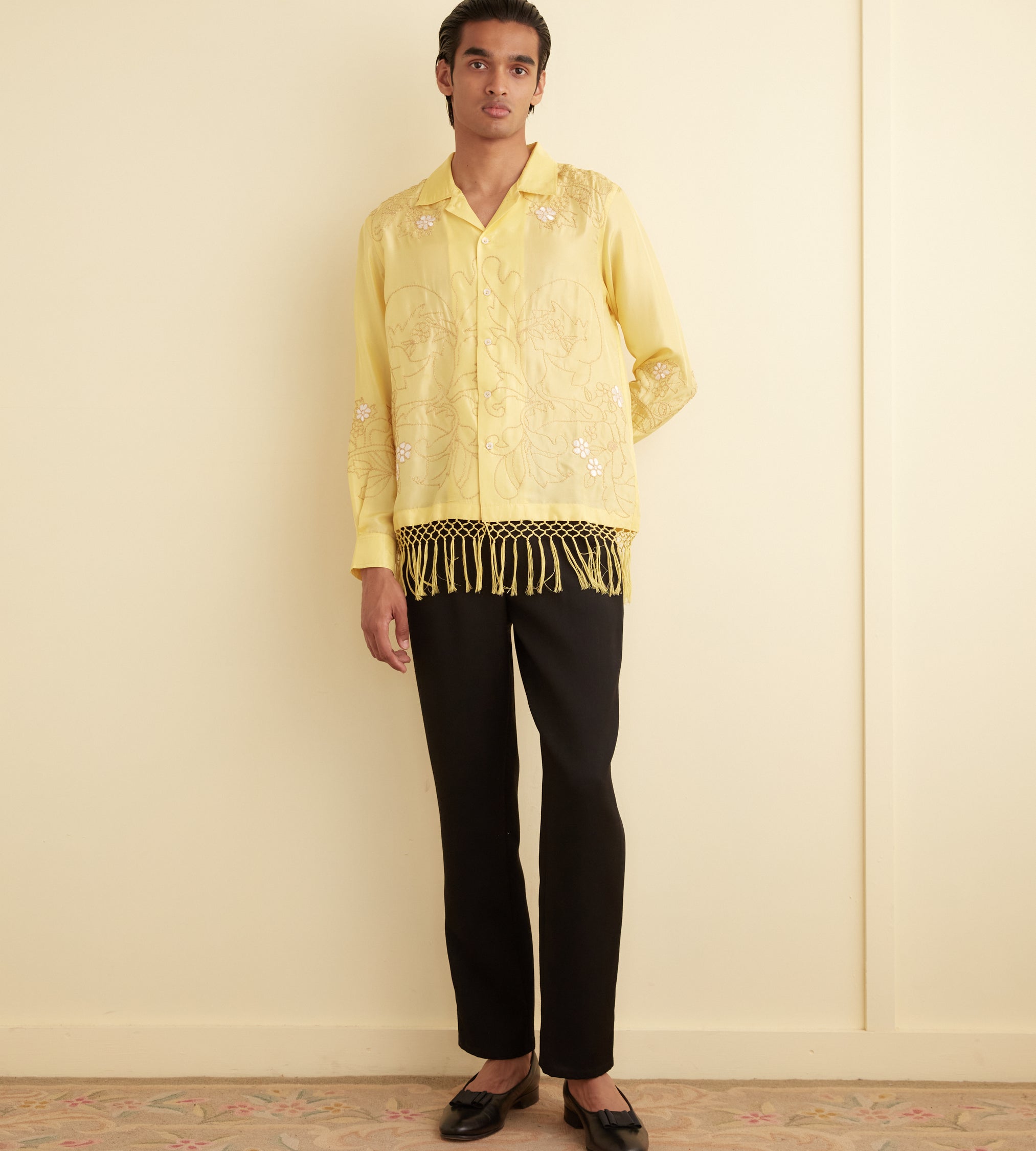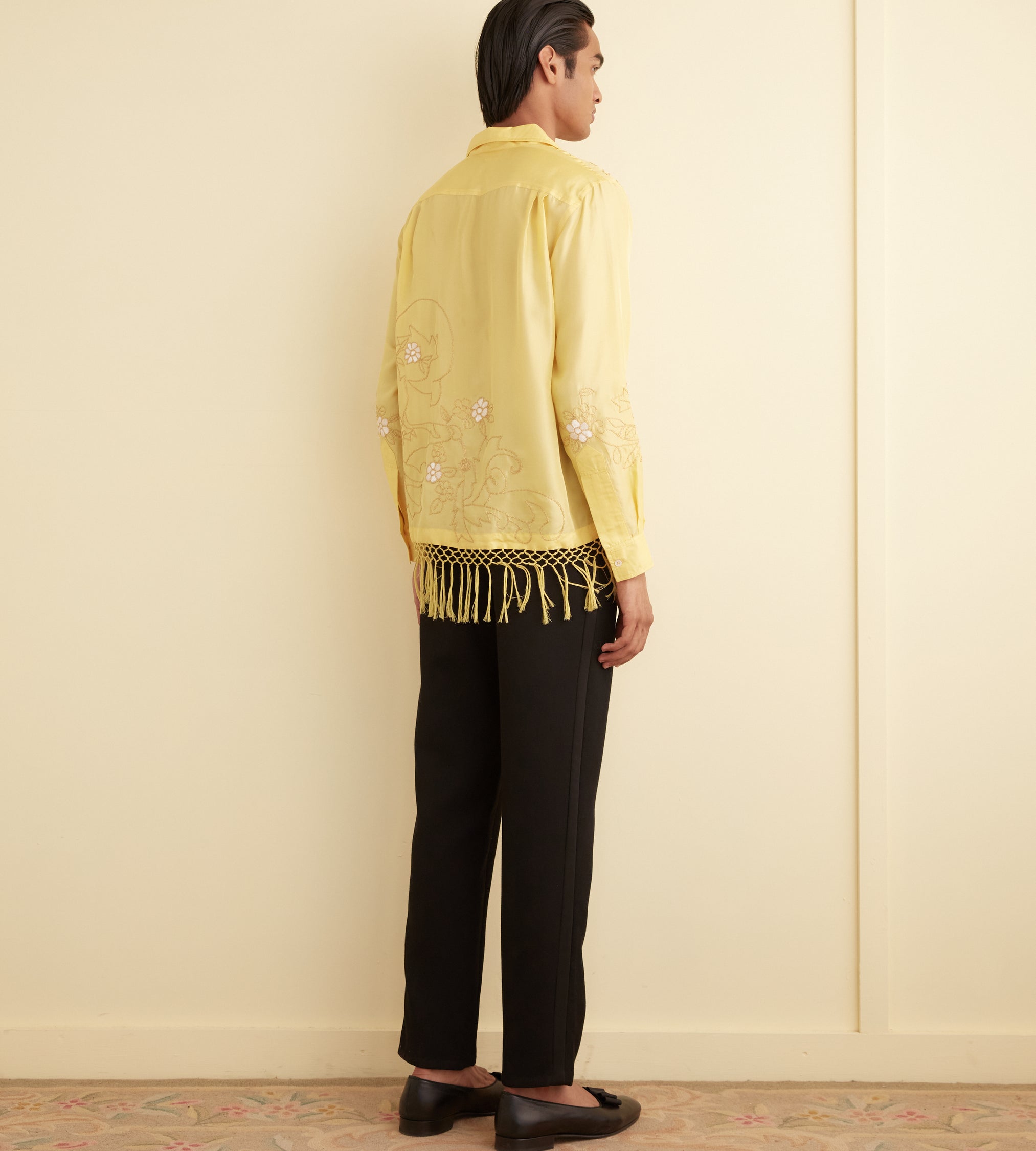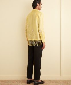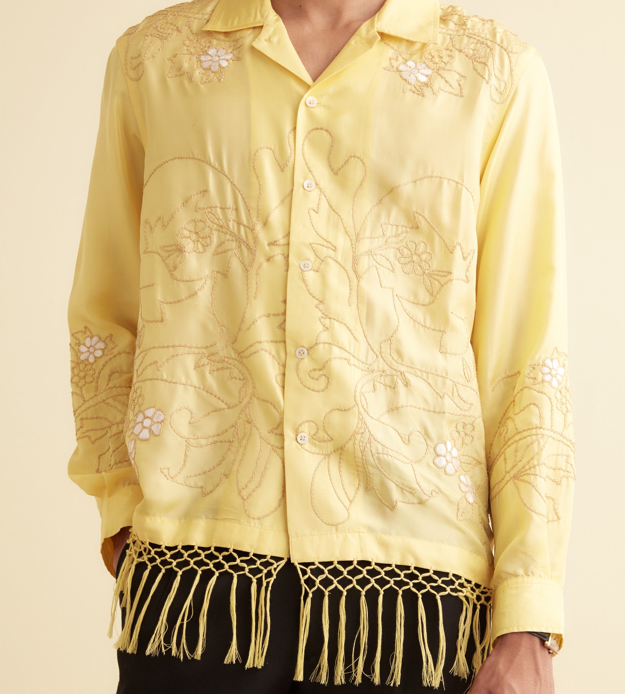 This shirt is embroidered with a yellow-and-white floral pattern and features long, knotted fringe about the hem.