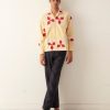 This shirt is embroidered with a yellow-and-white floral pattern and features long, knotted fringe about the hem.