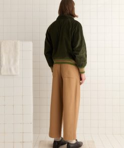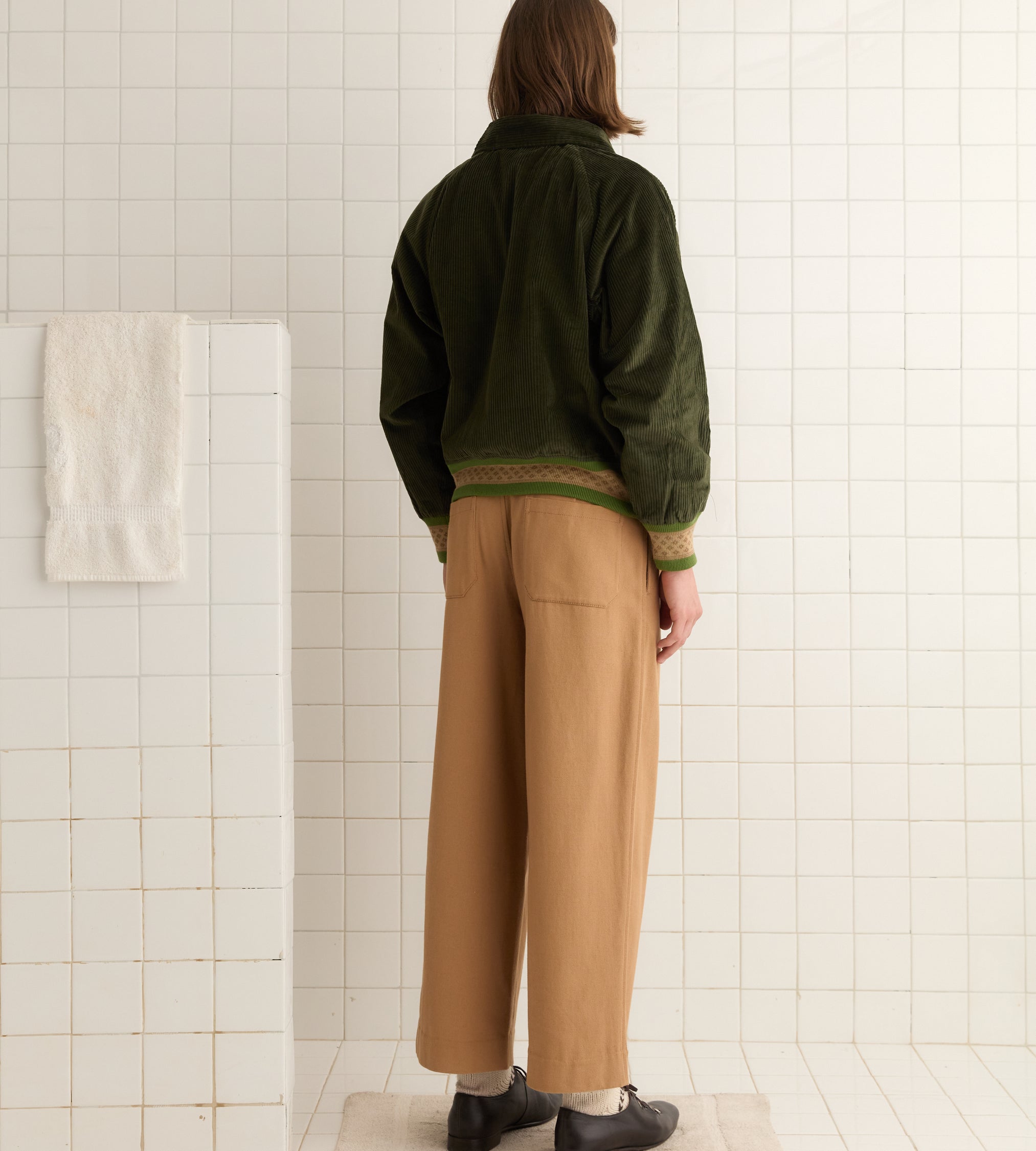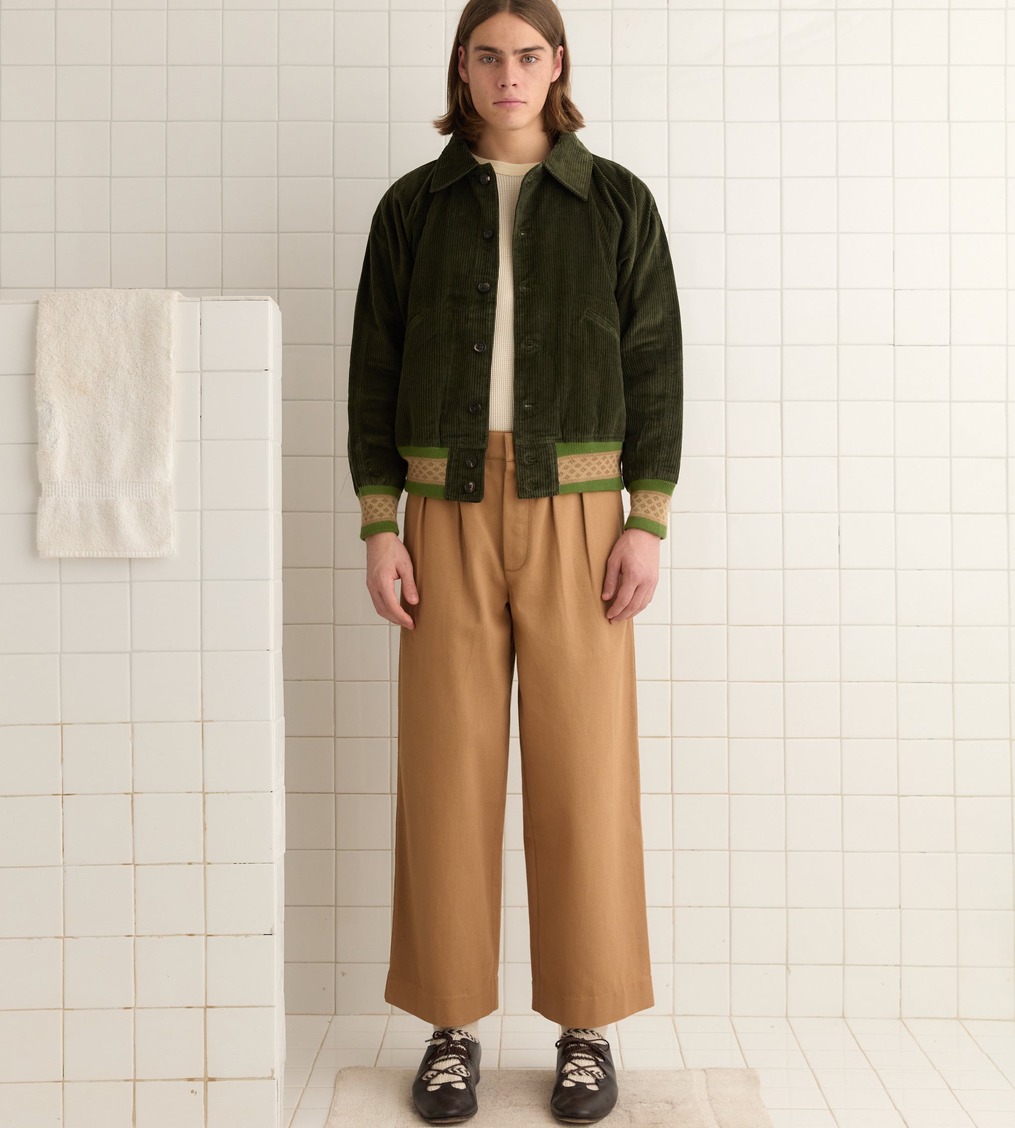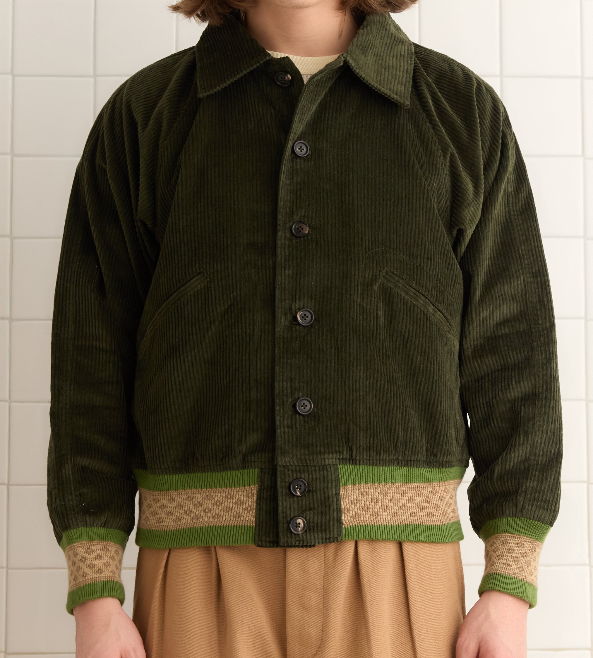 This jacket is inspired by a workwear jacket from the 1960s. We reproduced the silhouette in forest green corduroy, trimmed with patterned knit bands at the hem and cuffs.