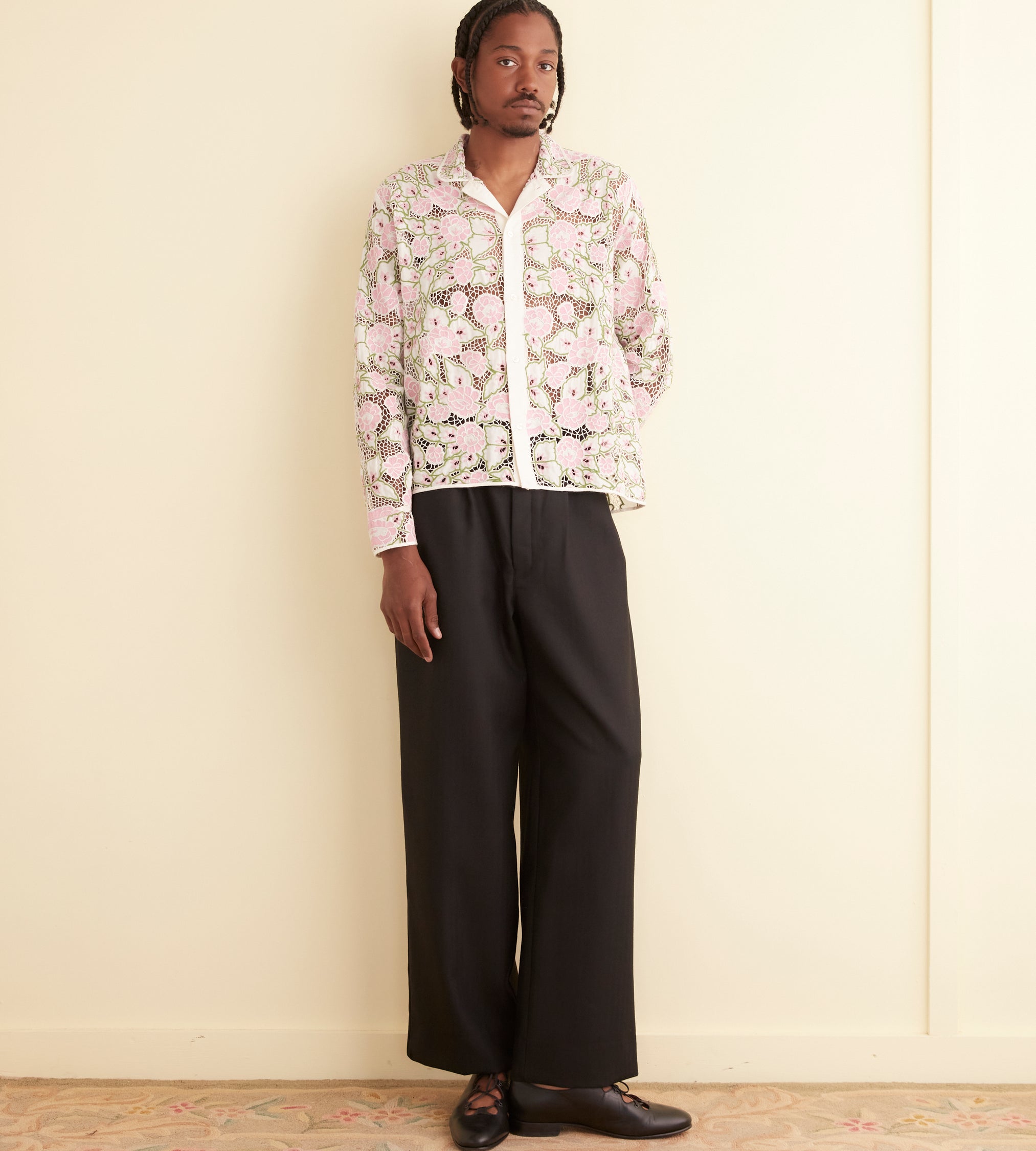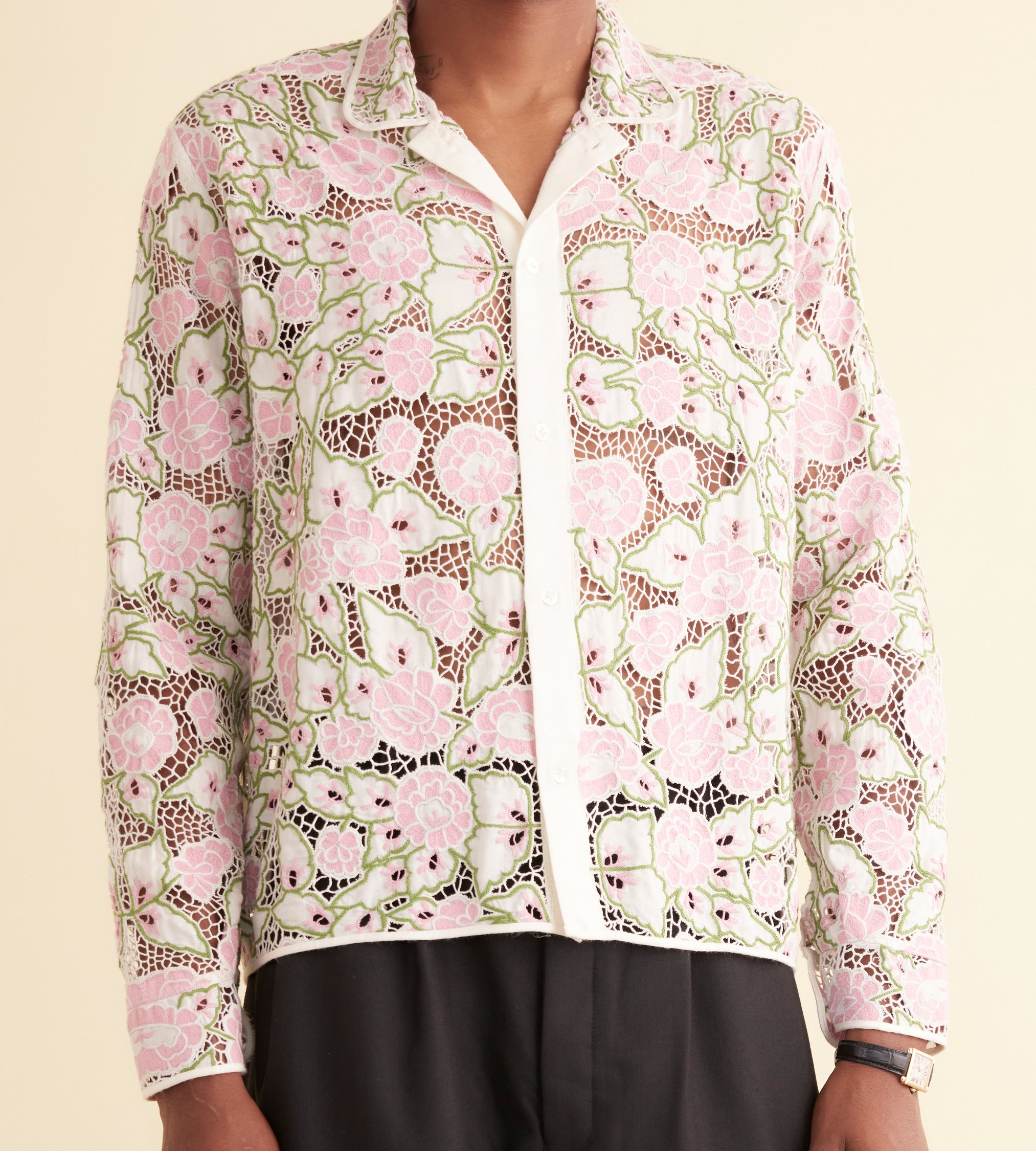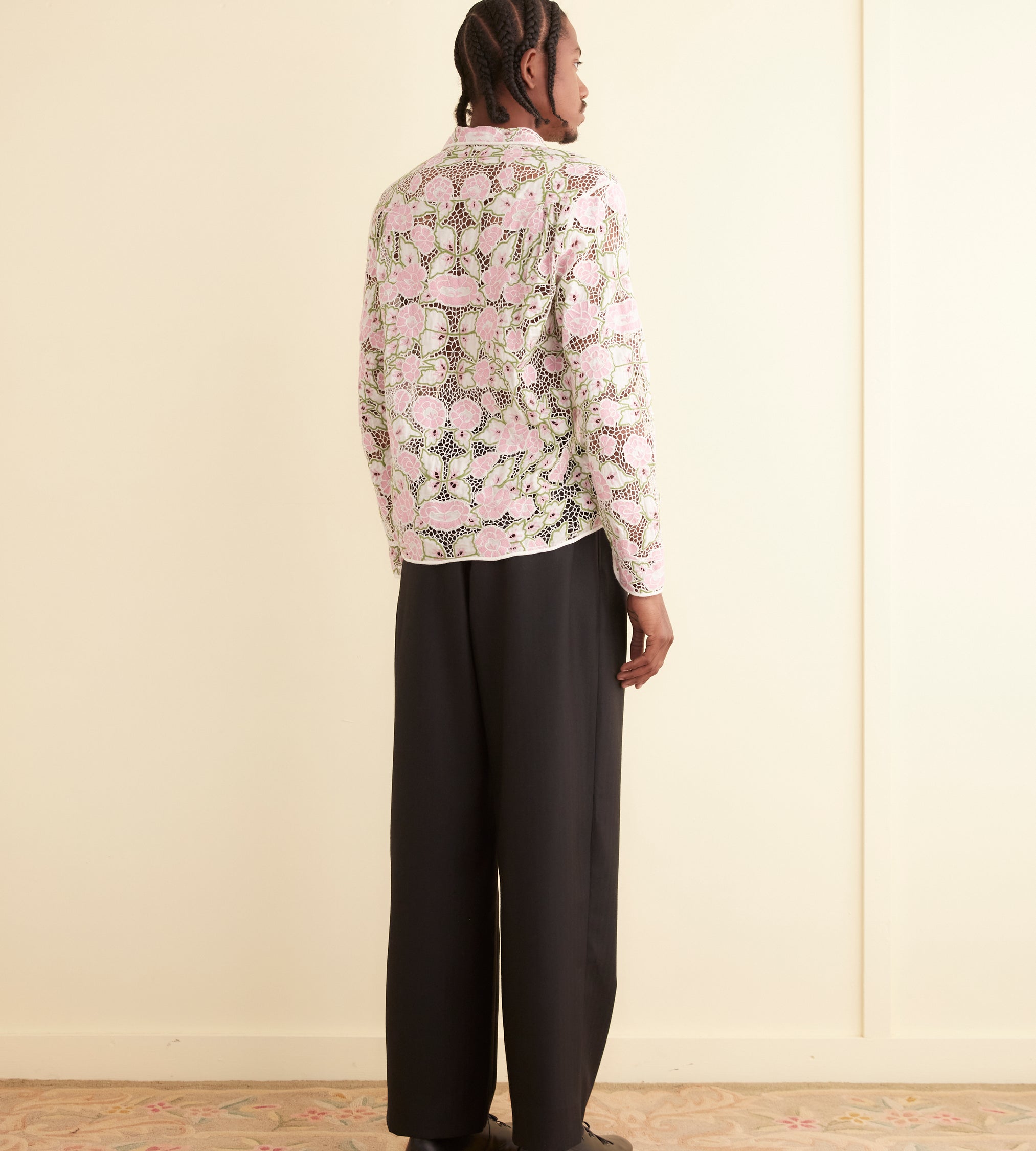 This shirt is a reproduction of a shirt Emily’s mother wore in high school in the 1970s. We reproduced the original fabric, cutwork lace embroidered in pink and green, for this style. Cutwork is a needlework technique in which portions of the fabric are cut away and the open spaces are reinforced with fine needlework.