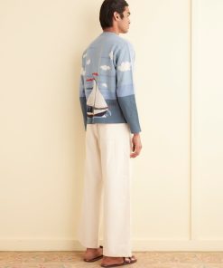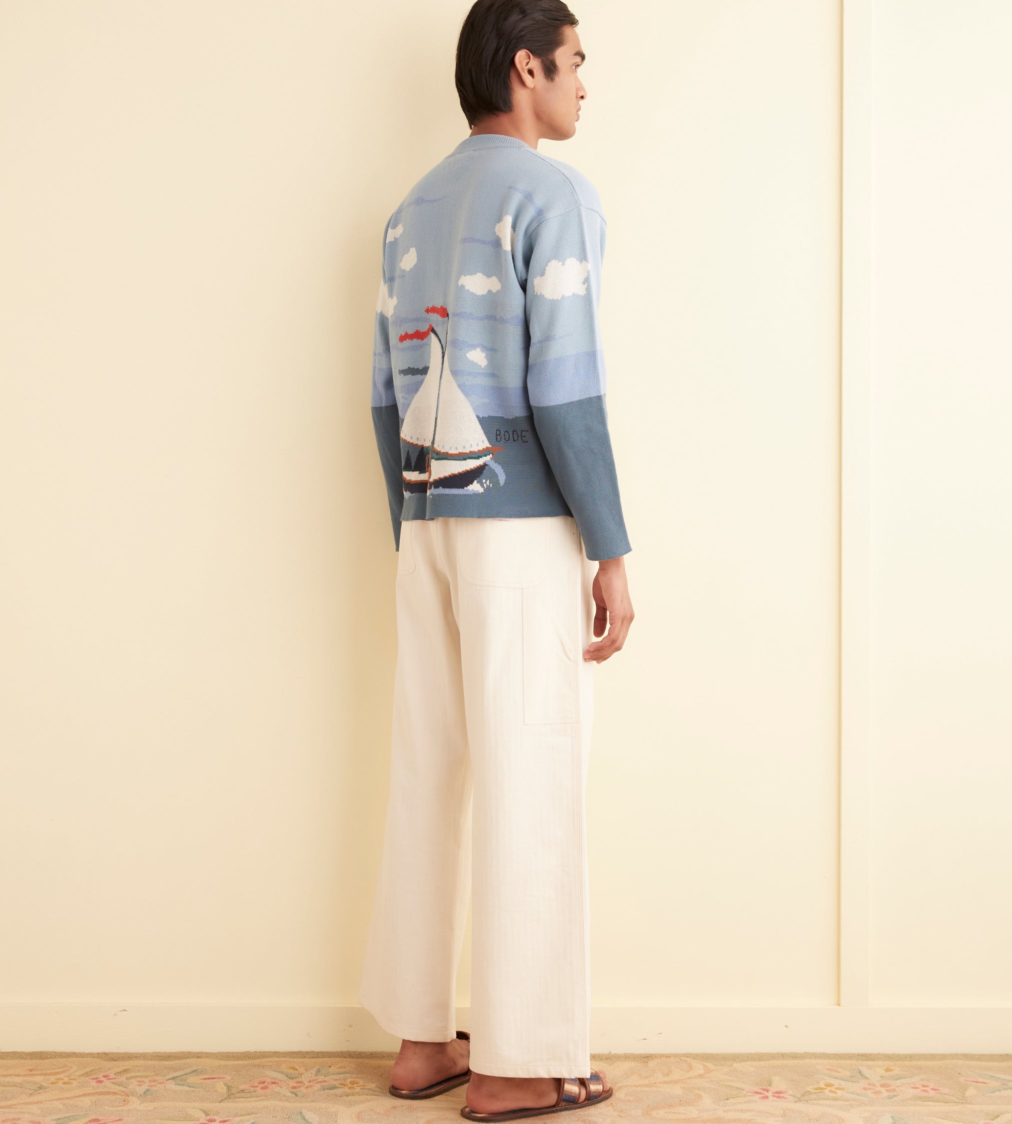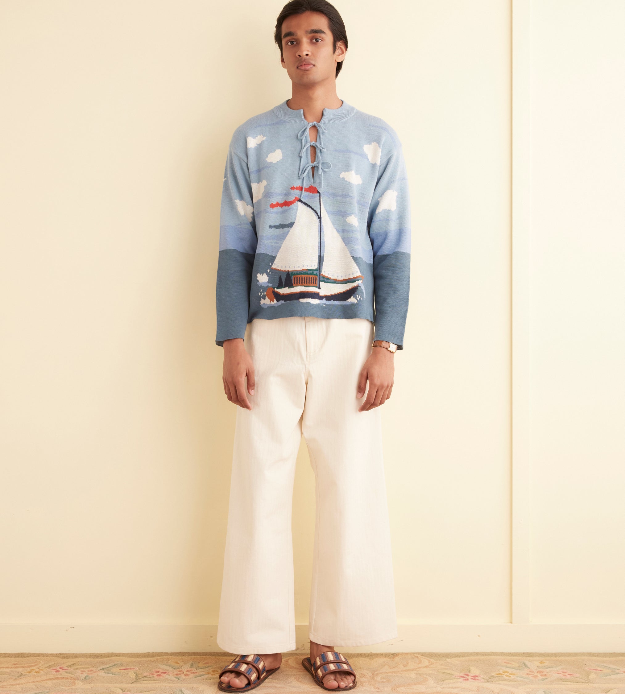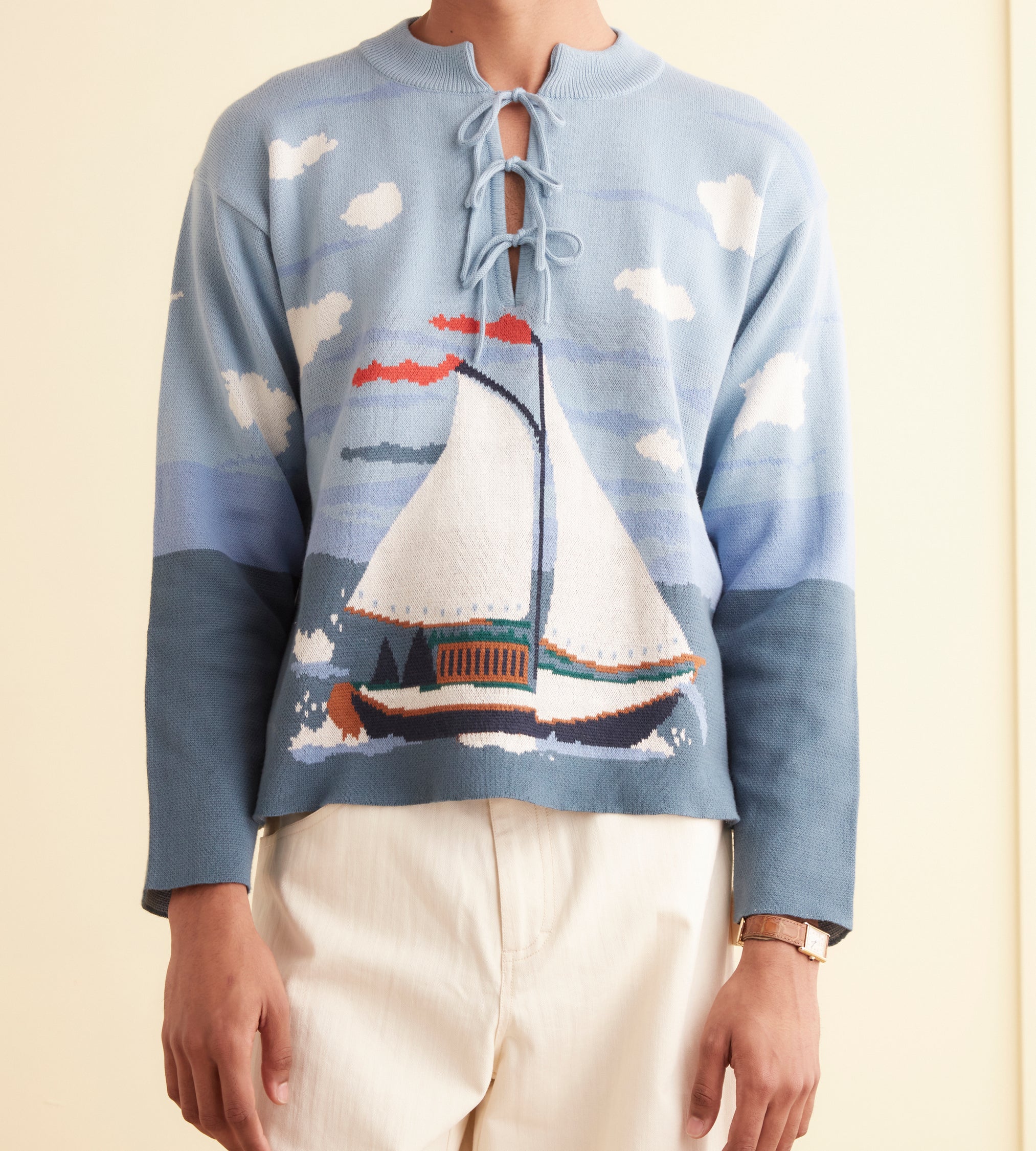 This sweater is inspired by a novelty sweater from the 1970s. The original piece likely came from a DIY kit, which were widespread throughout the 1960s and 1970s, especially for crocheting and knitting patterns. We replicated its sailboat motif on this jacquard sweater with a lace-up neckline.
