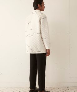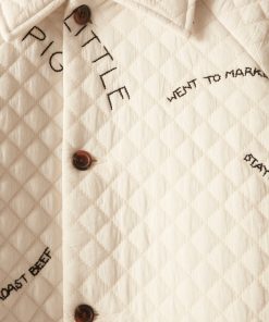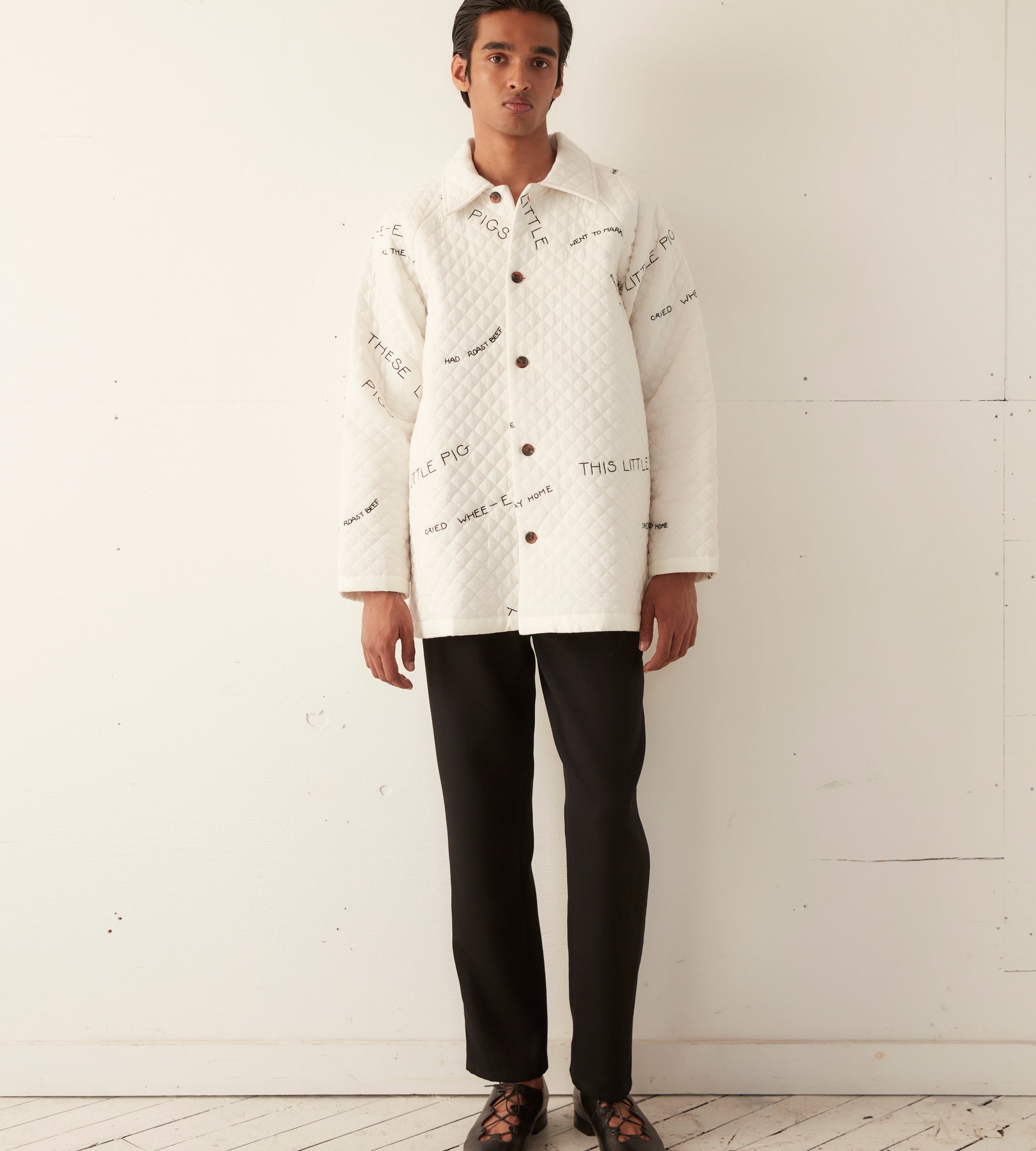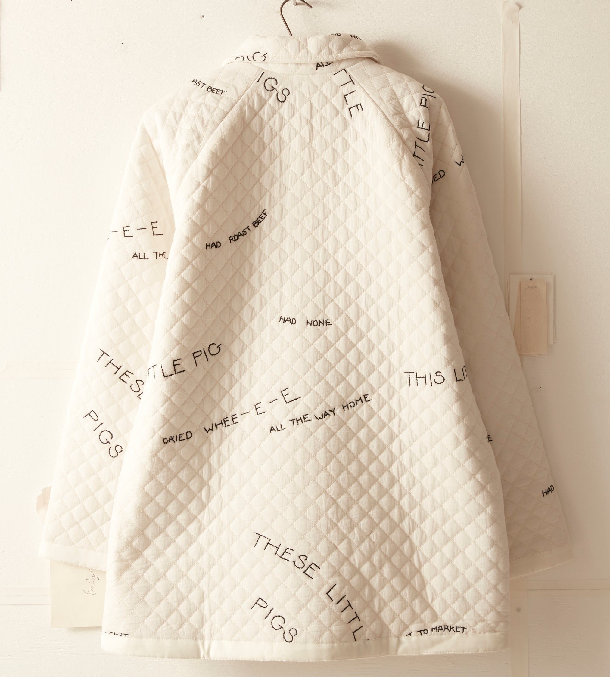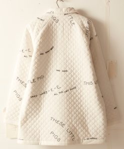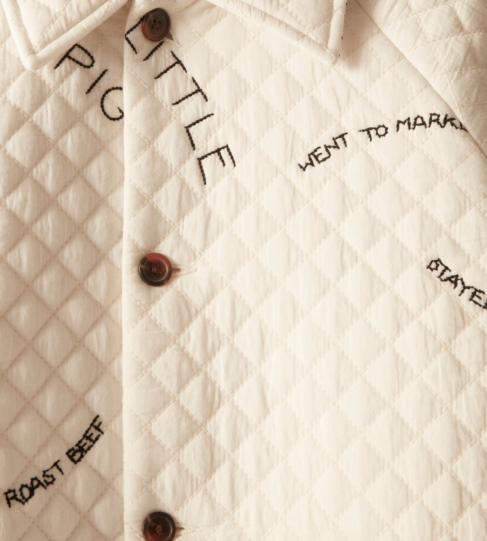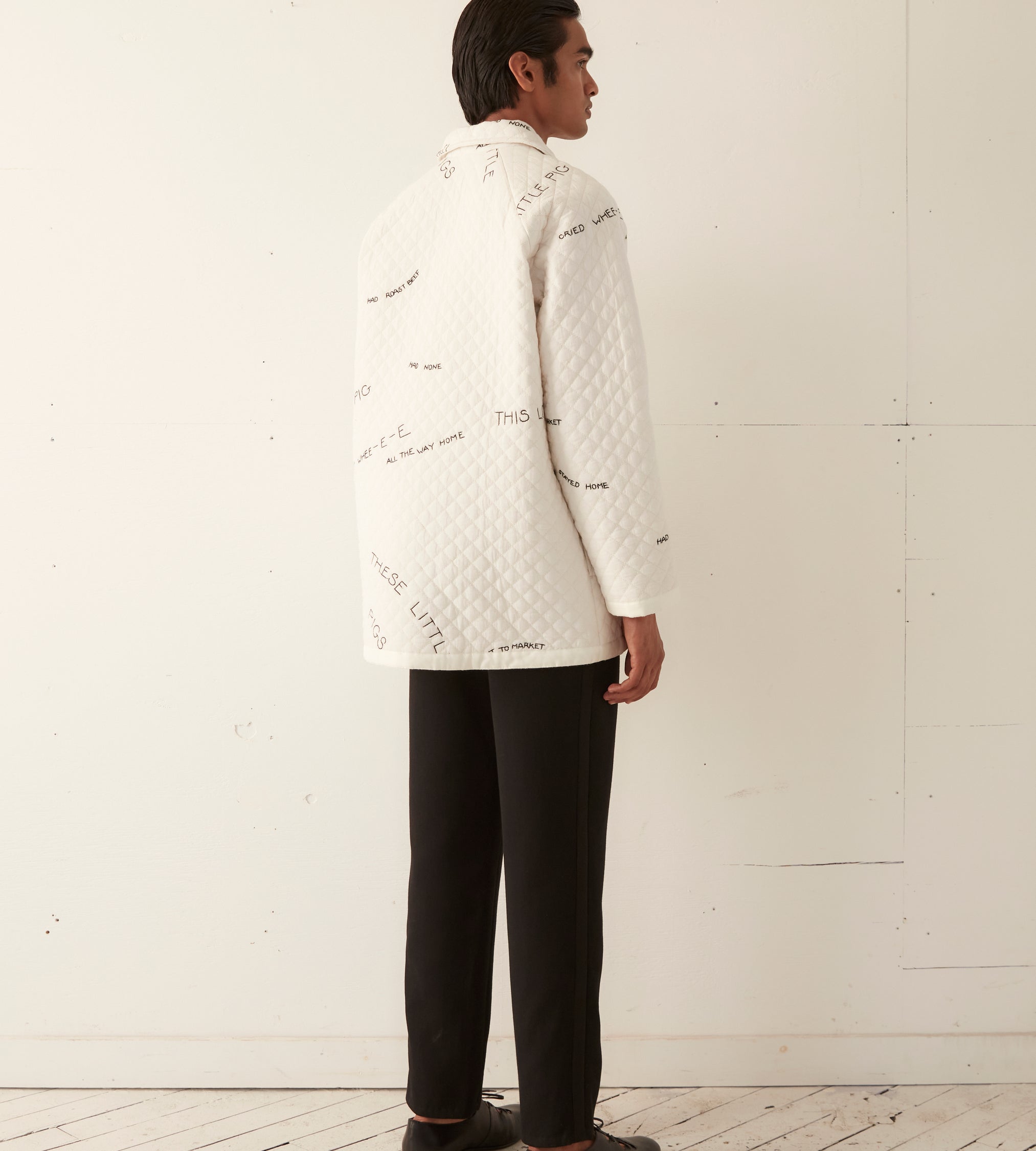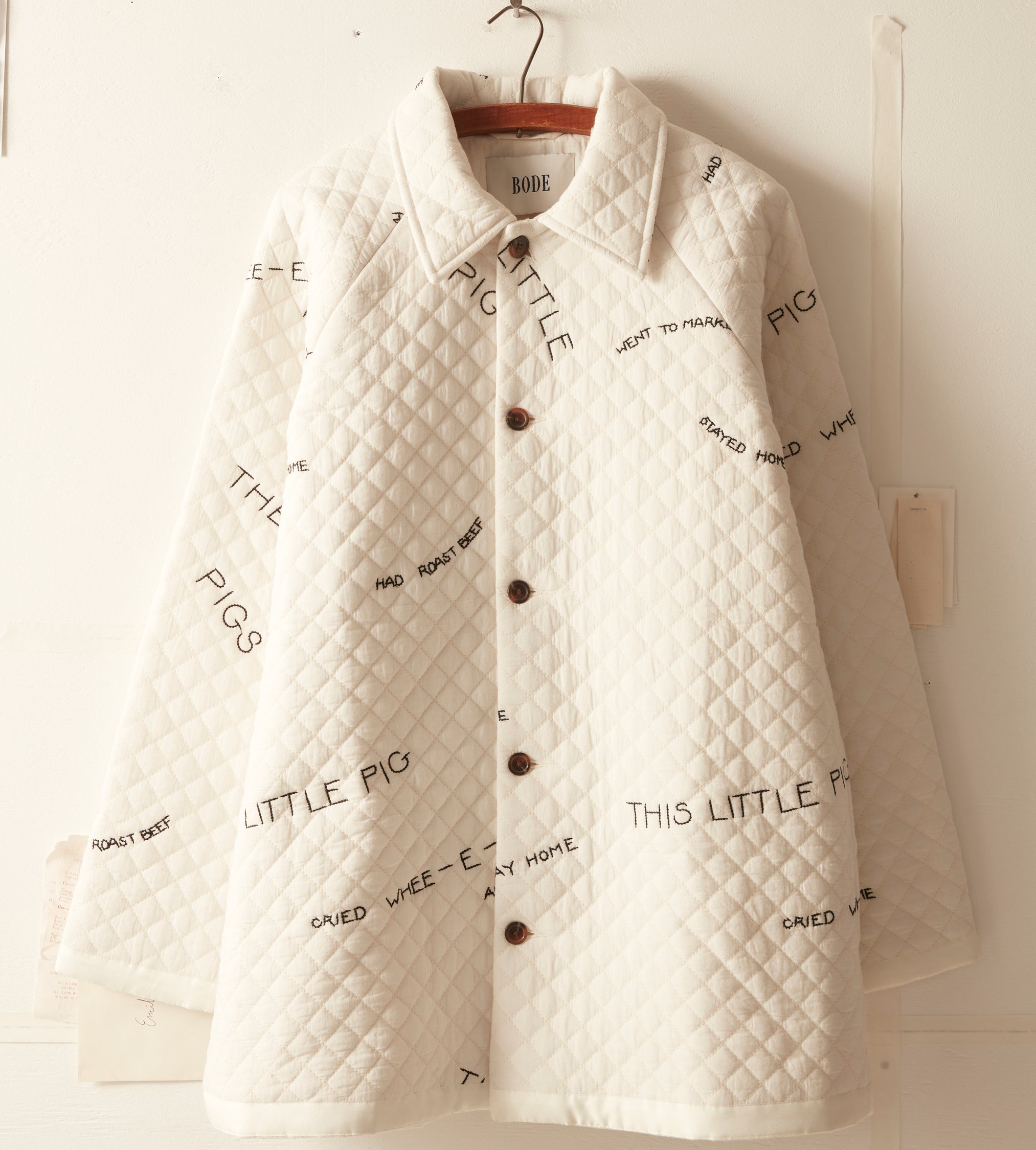 This jacket is inspired by a midcentury baby quilt, embroidered with lines from the Three Little Pigs children’s story. The original quilt has been faithfully reproduced to make this jacket, which is cut in a classic workwear silhouette.