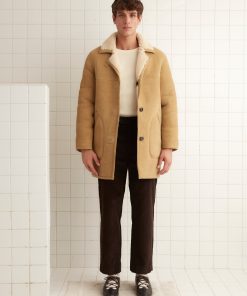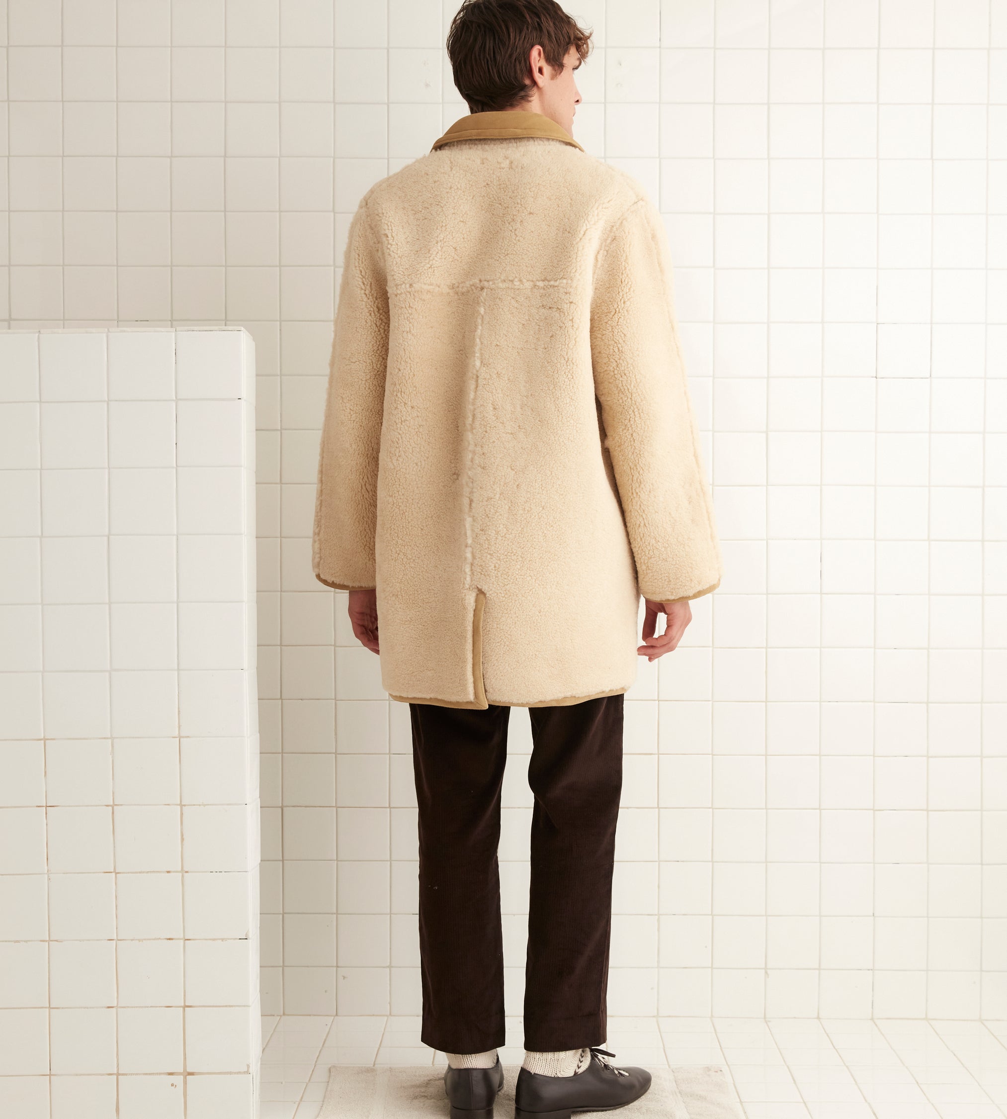 This coat is a historical reproduction of a shearling and suede ranch coat from the 1950s. It is reversible and can be worn either with the shearling or the suede facing out.