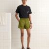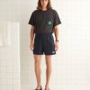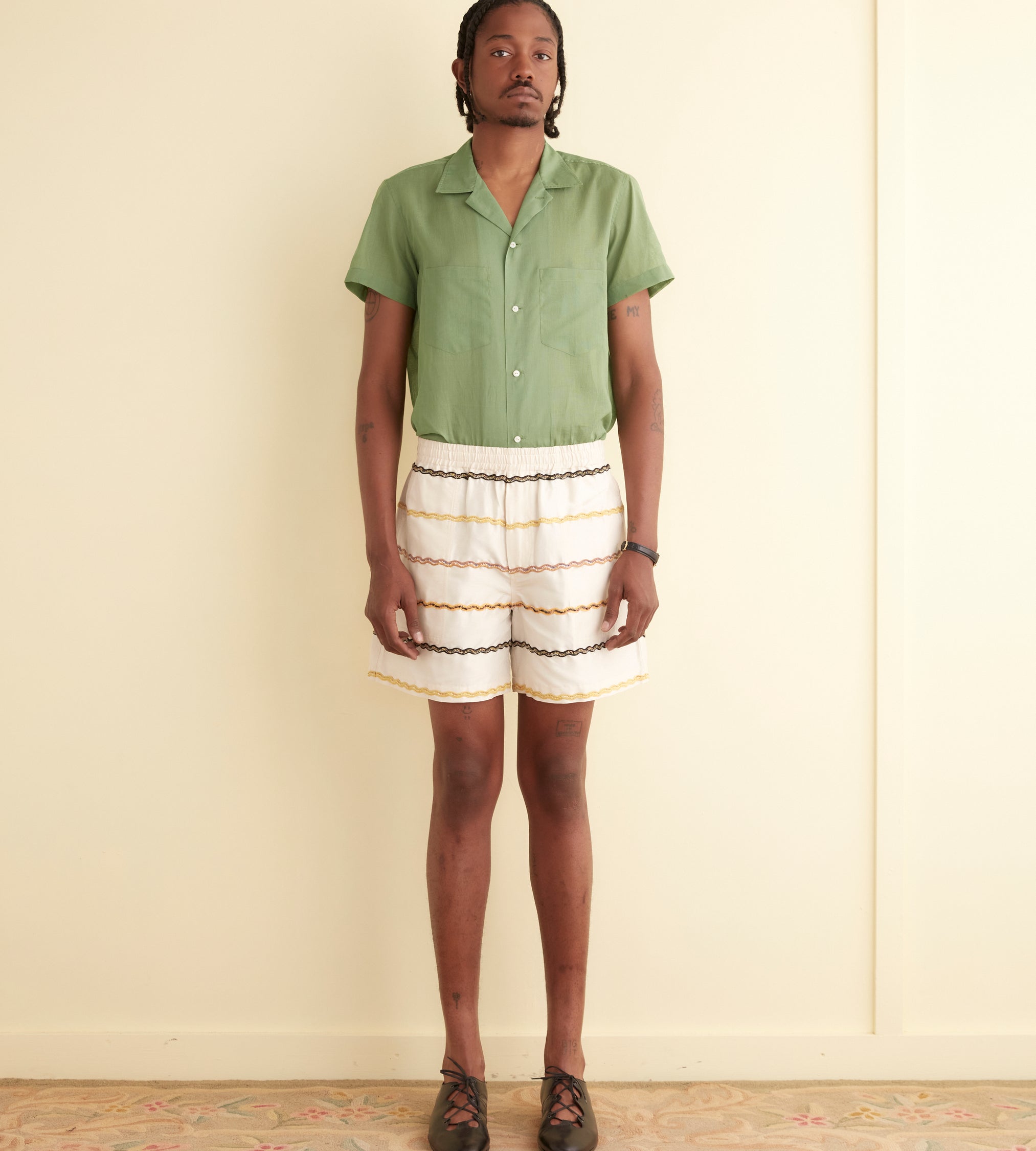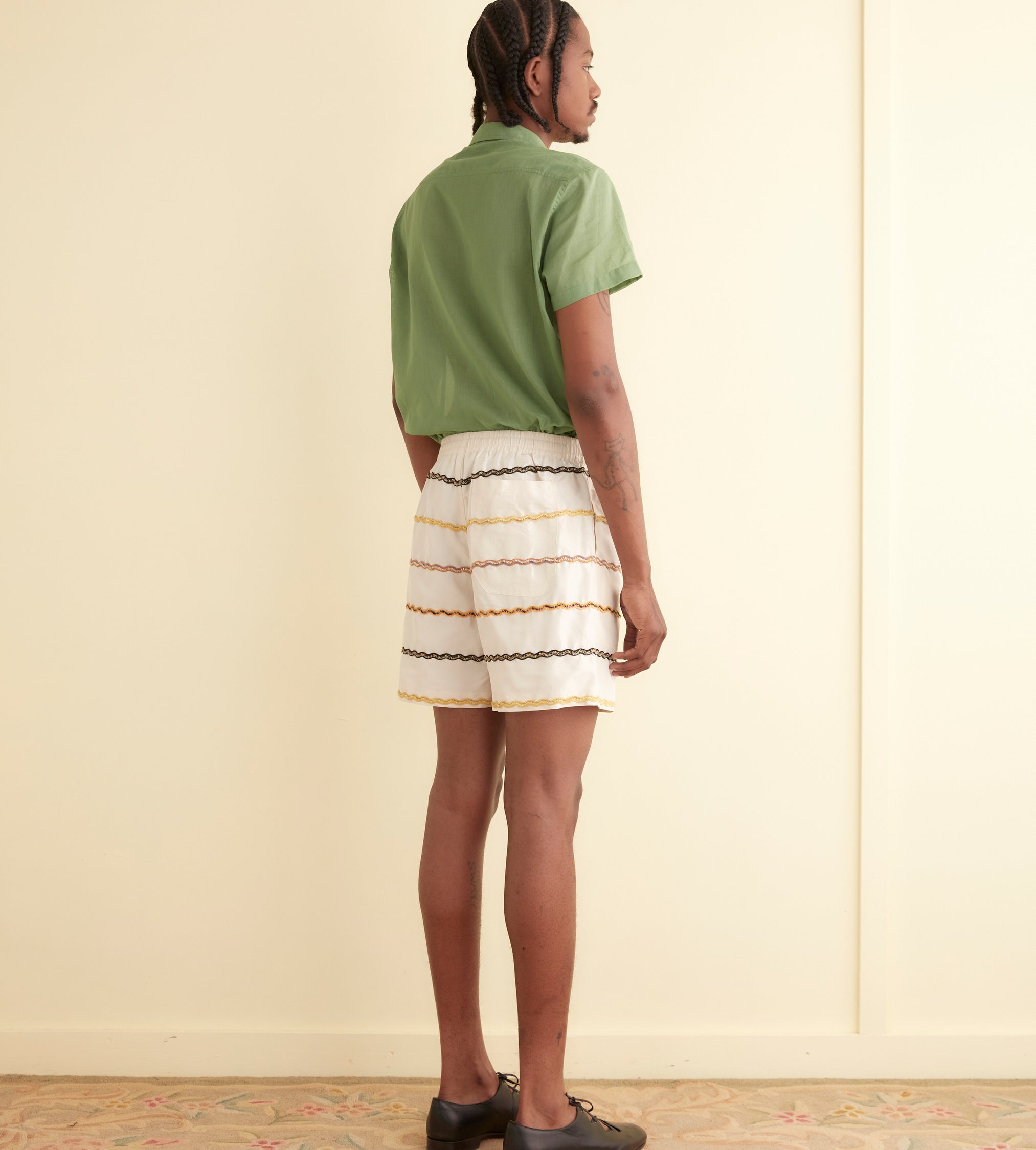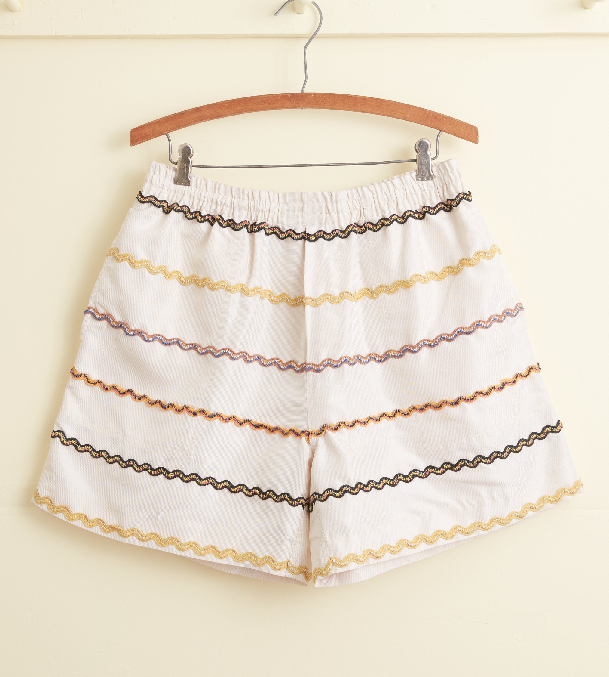 These shorts are inspired by trim from a peasant blouse, circa 1970s. We reproduced the embroidered rickrack stripes—in navy, mustard, lime, and dusty pink—for this style. The shorts are cut in a classic rugby silhouette, with a short inseam and a wide leg opening.