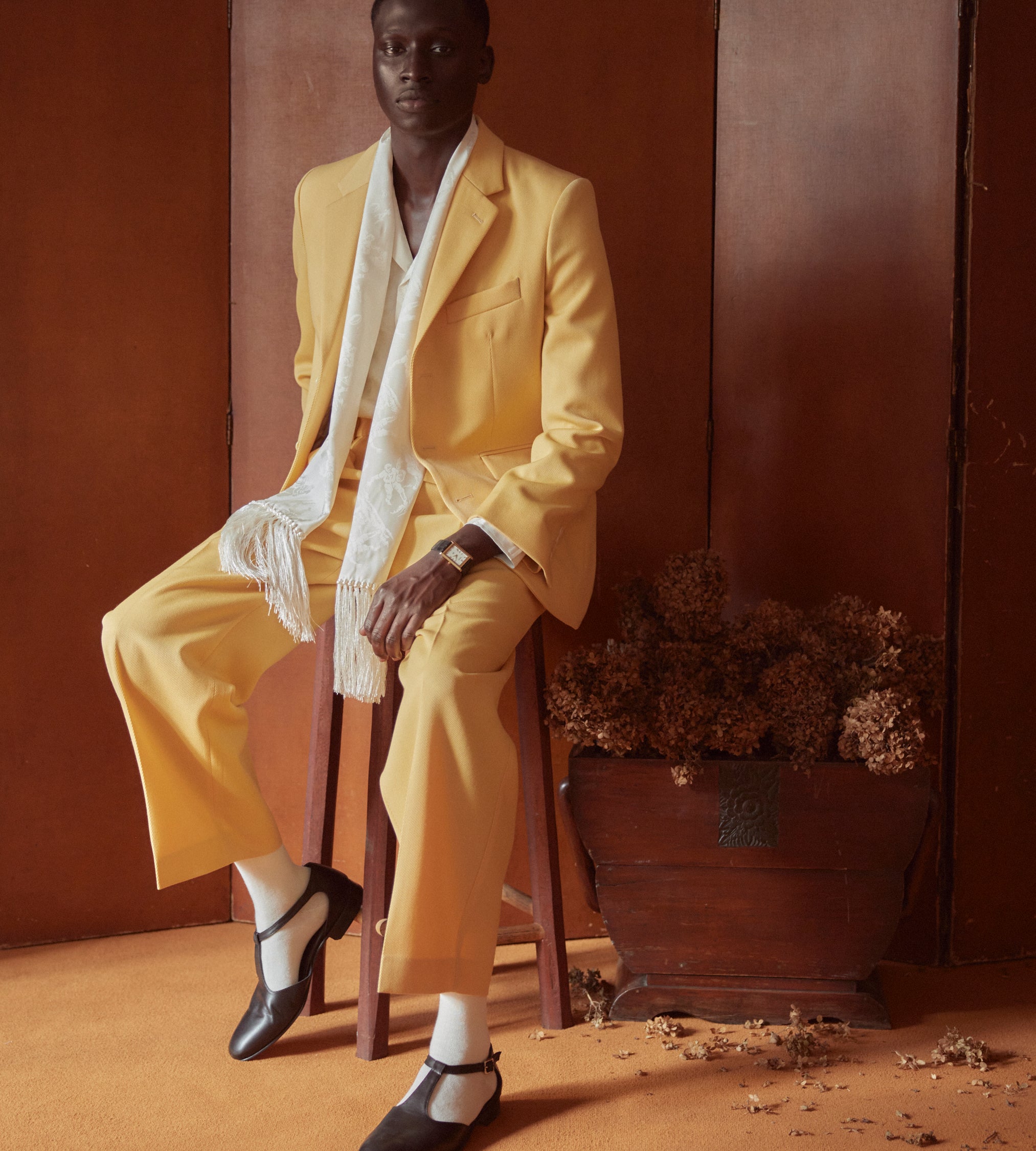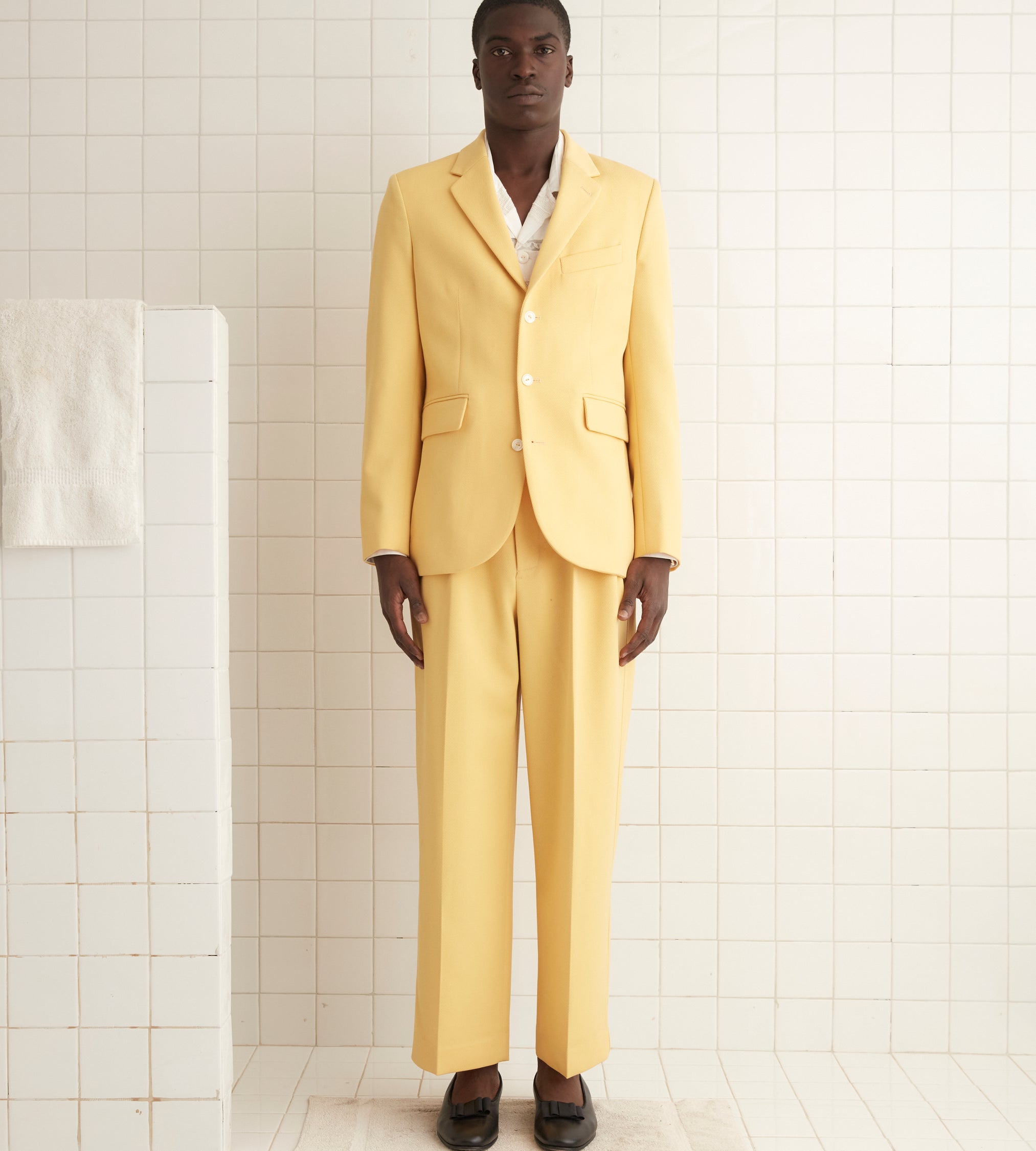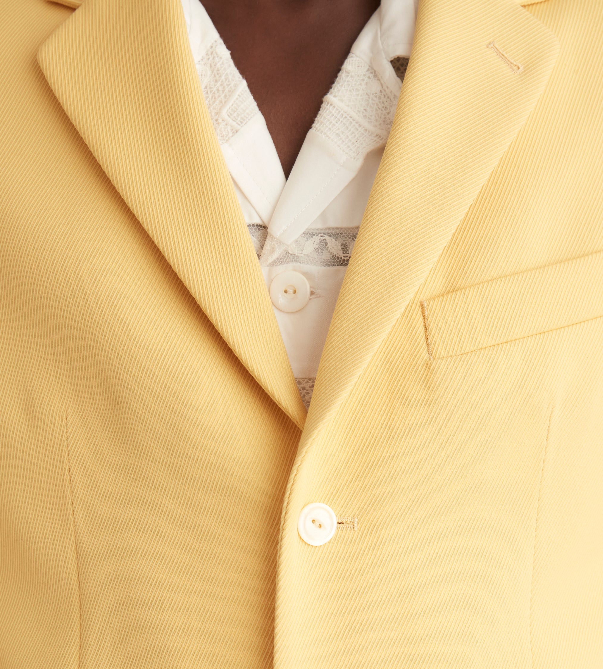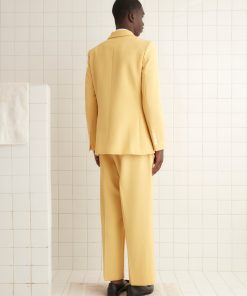 This suit jacket is inspired by a pair of riding breeches from the 1930s. We recreated the fabric —a butter yellow wool twill—for this style. The jacket is trimmed with antique pearl buttons from a now-defunct factory in Iowa, once the largest global pearl-button producer.