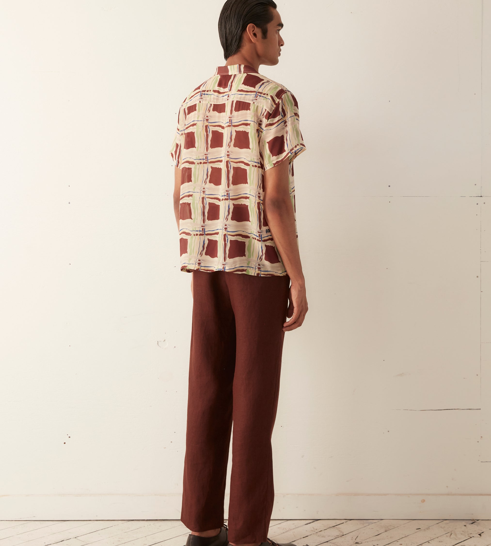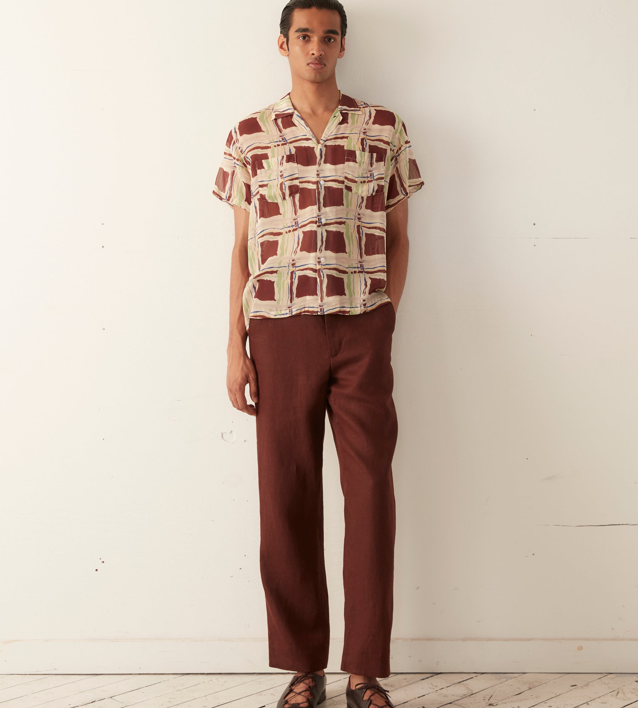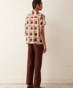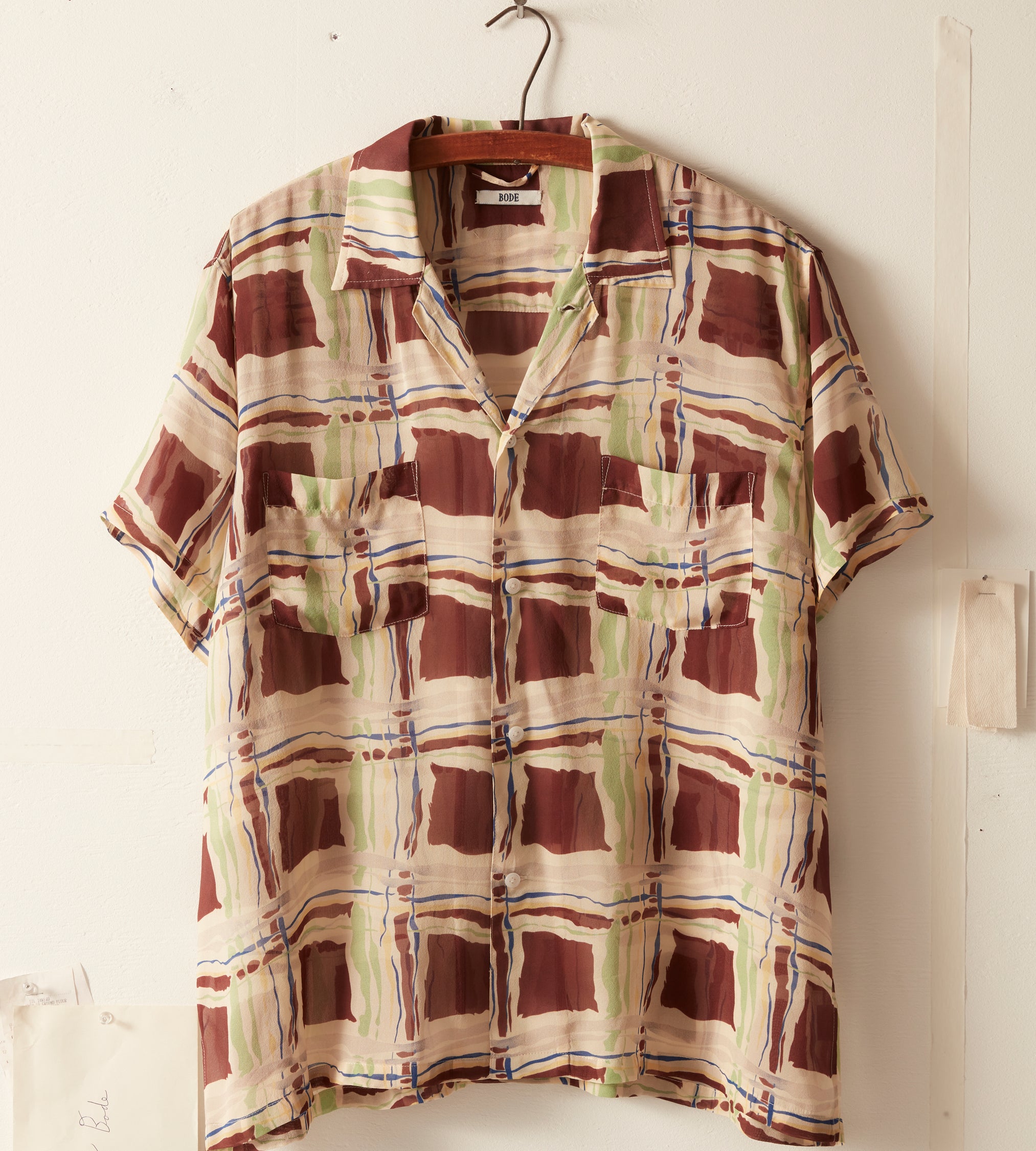 This short sleeve shirt is inspired by a 1930s women’s dress. The original multicolored pattern was printed in a watercolor style and faithfully reproduced in 100% silk georgette.