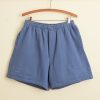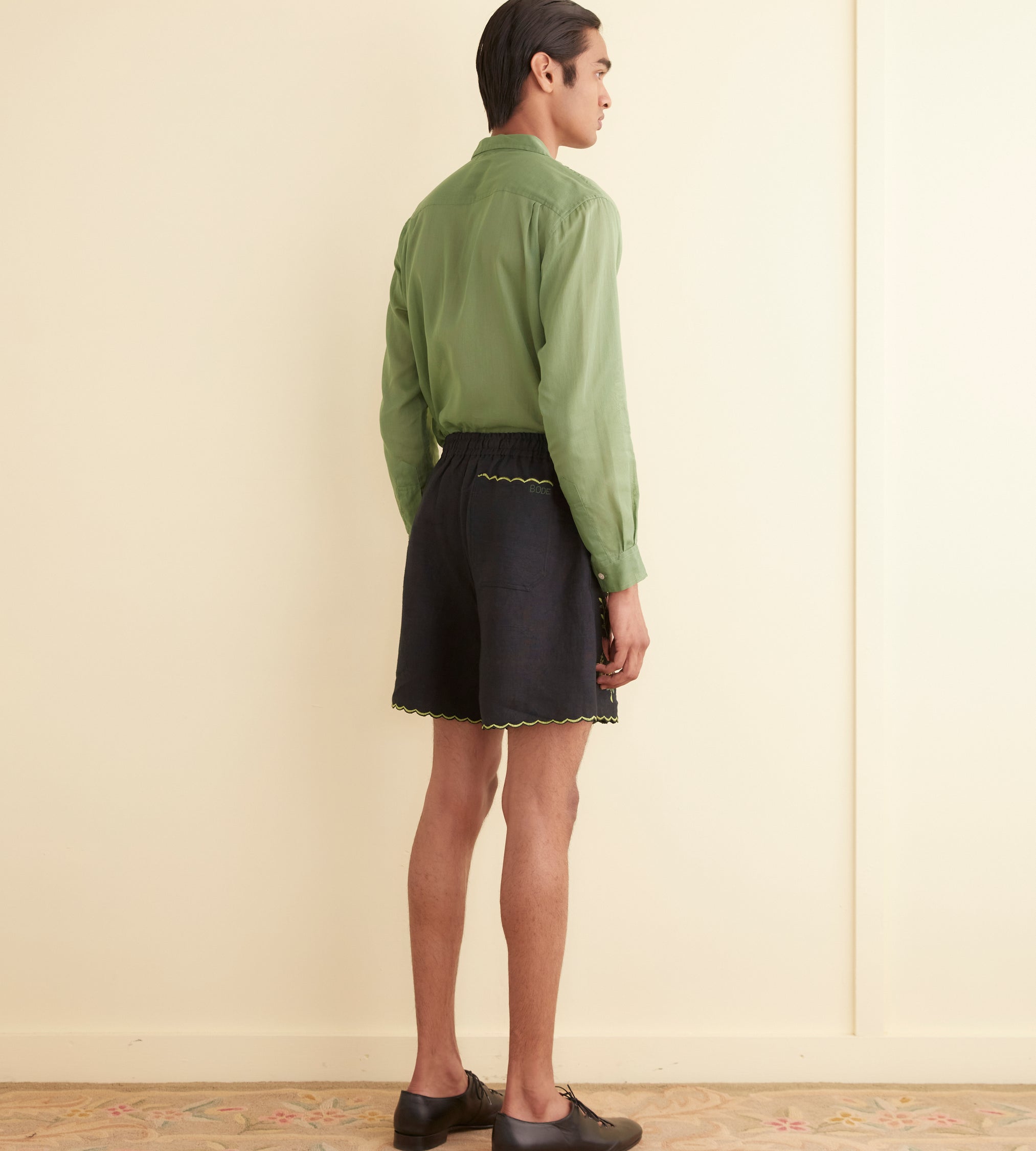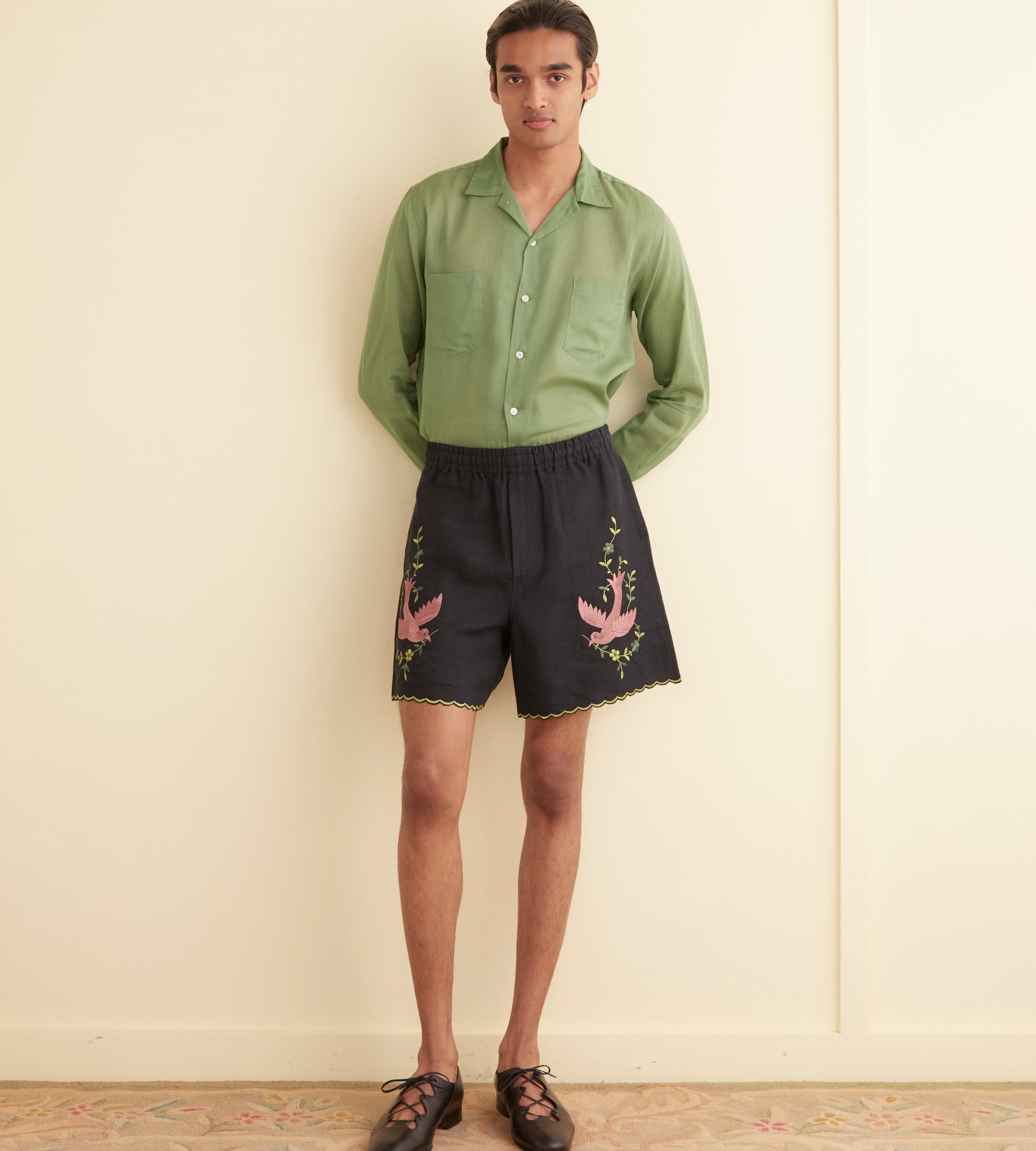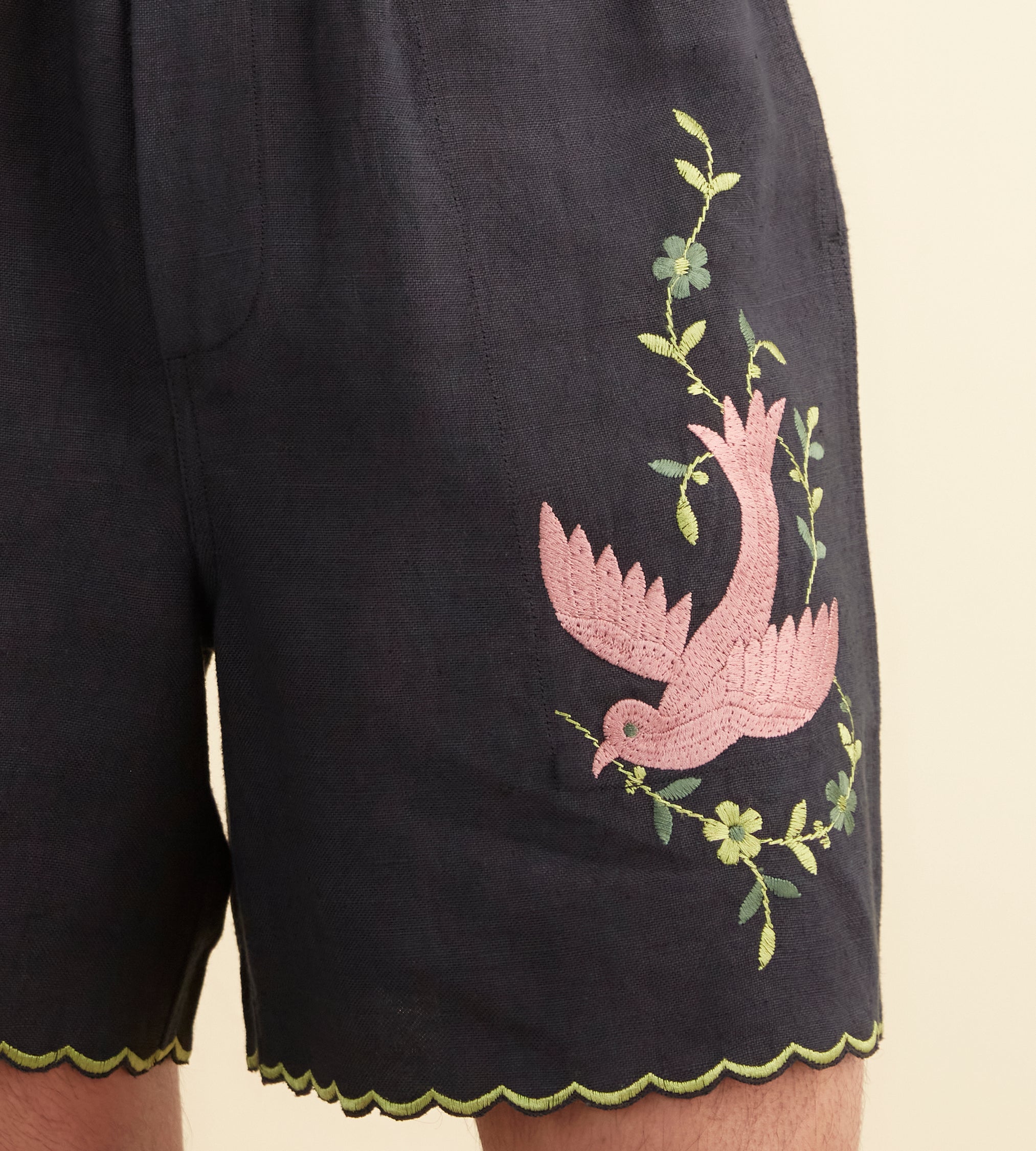 These shorts are inspired by an embroidered tea towel from the 1960s-1970s. We reproduced the pink and green embroidery—a bird-and-greenery pattern—for this style. The shorts are scalloped and embroidered along the hem and back pocket.