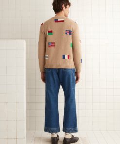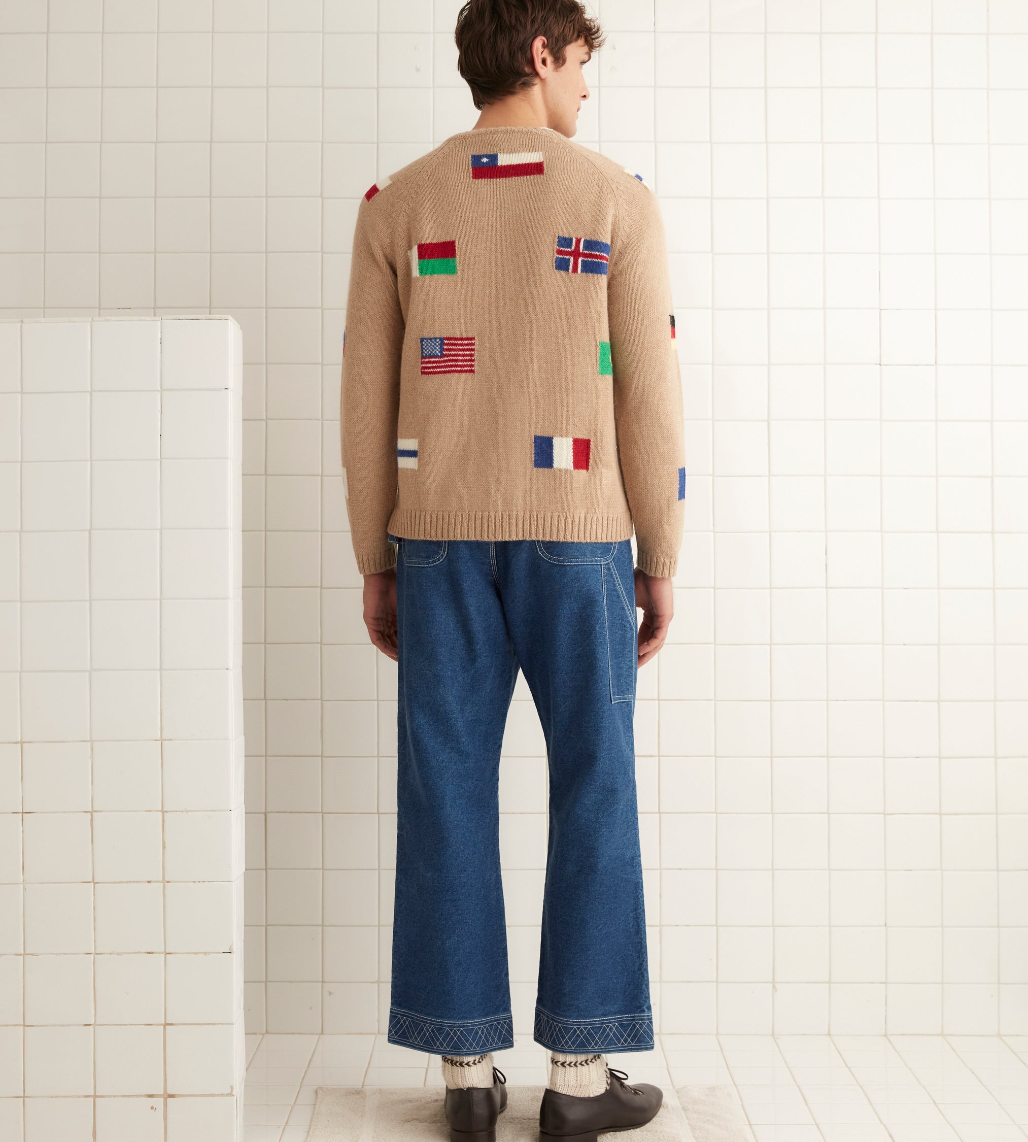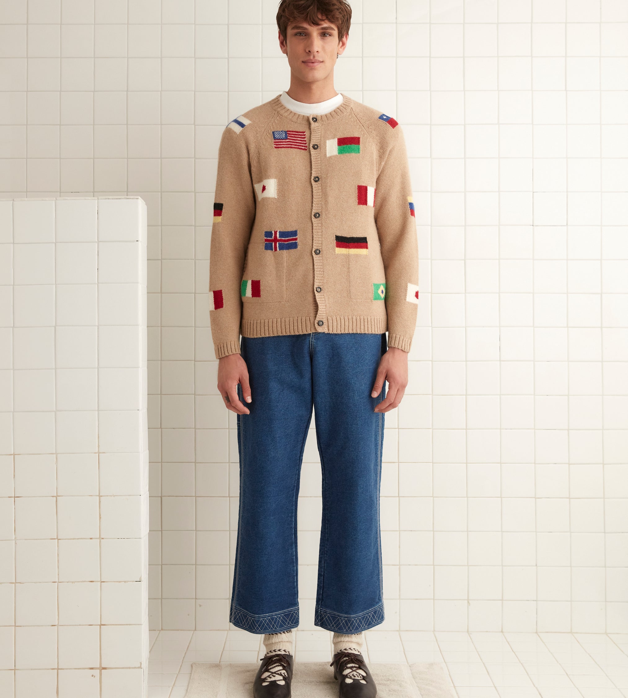 This cardigan is inspired by a novelty sweater from the 1970s, likely made from a DIY knitting kit. We reproduced the intarsia flag pattern for this style.