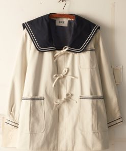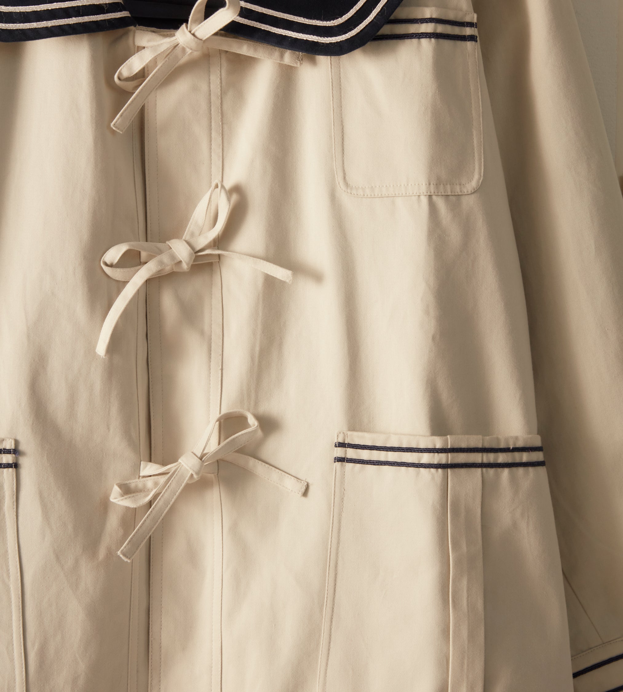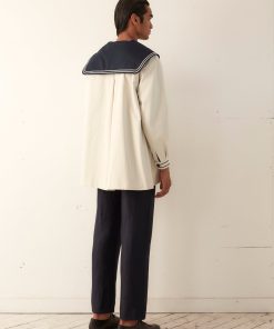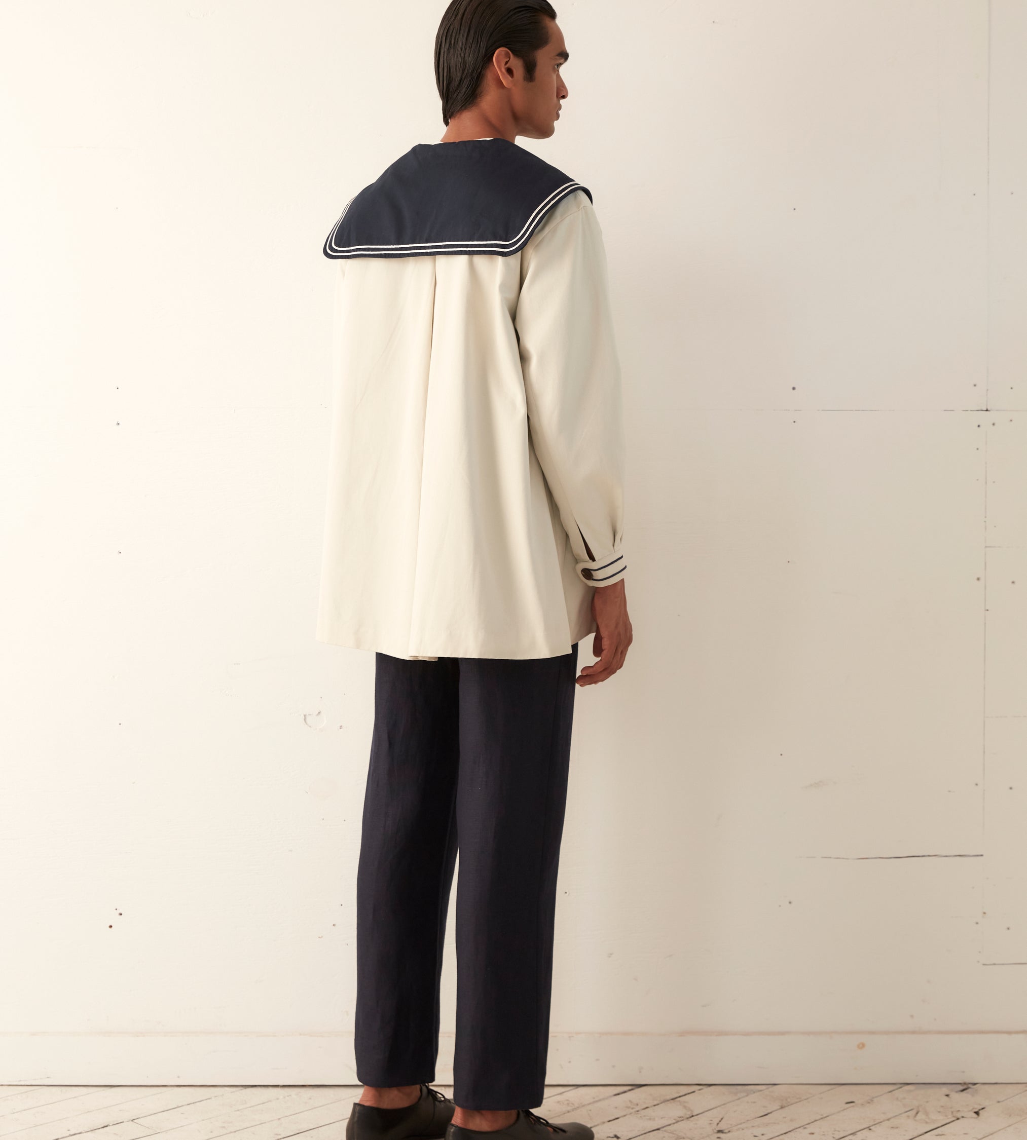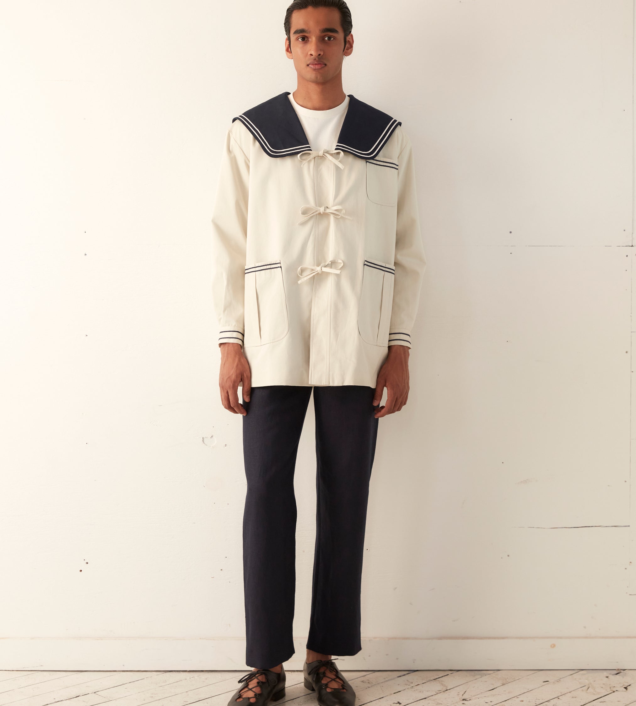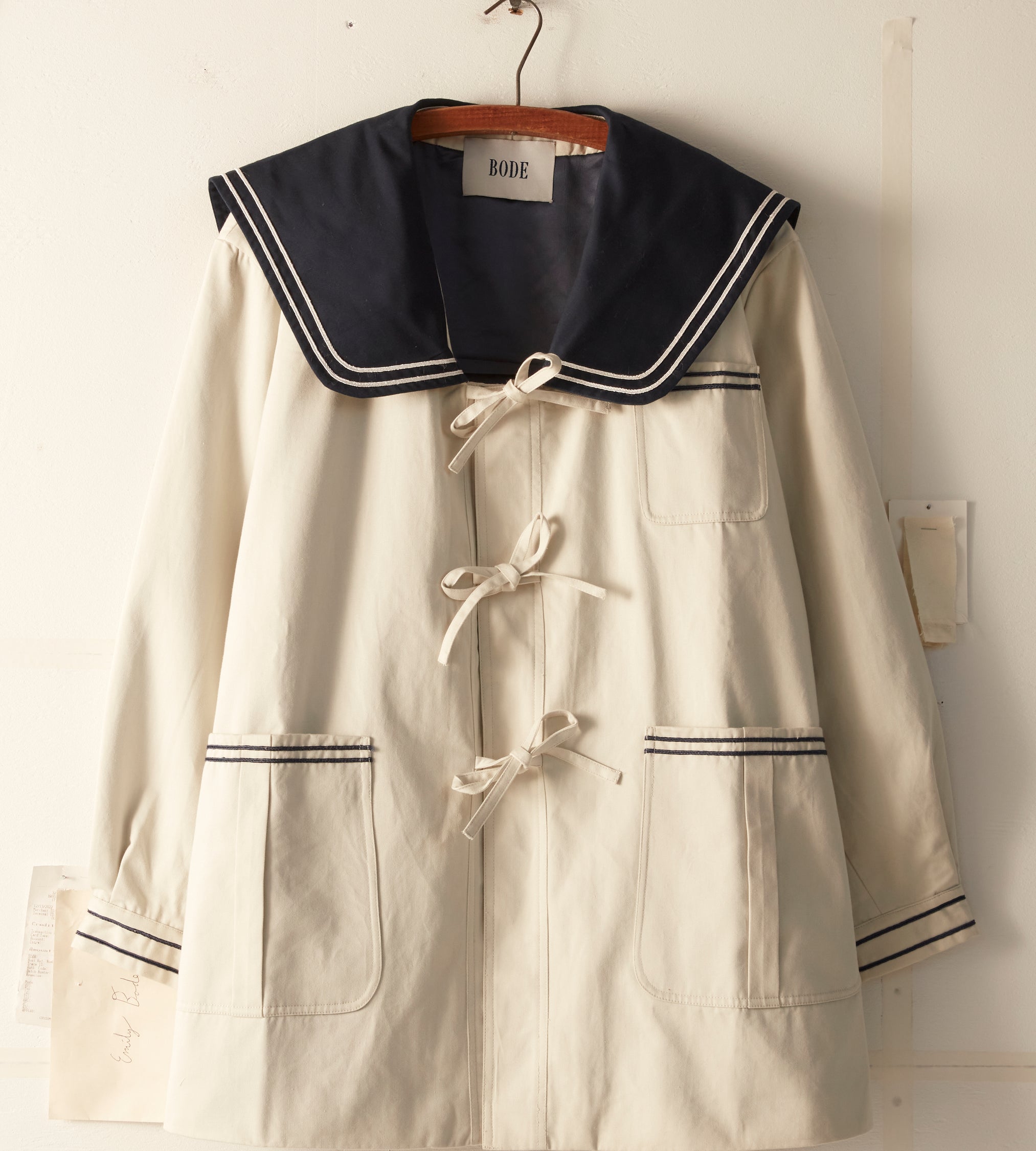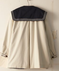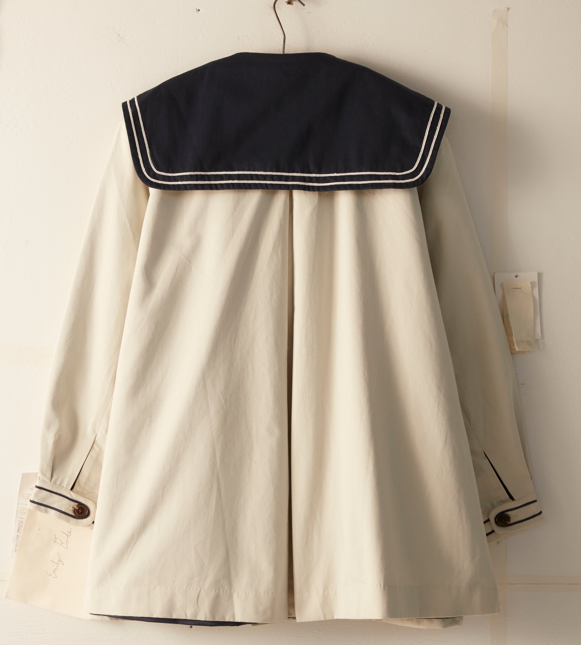 This coat is inspired by women’s outerwear, circa 1960s. This style is an exact reproduction of a nautical-themed women’s coat from an in-house label of a well-known American department store.