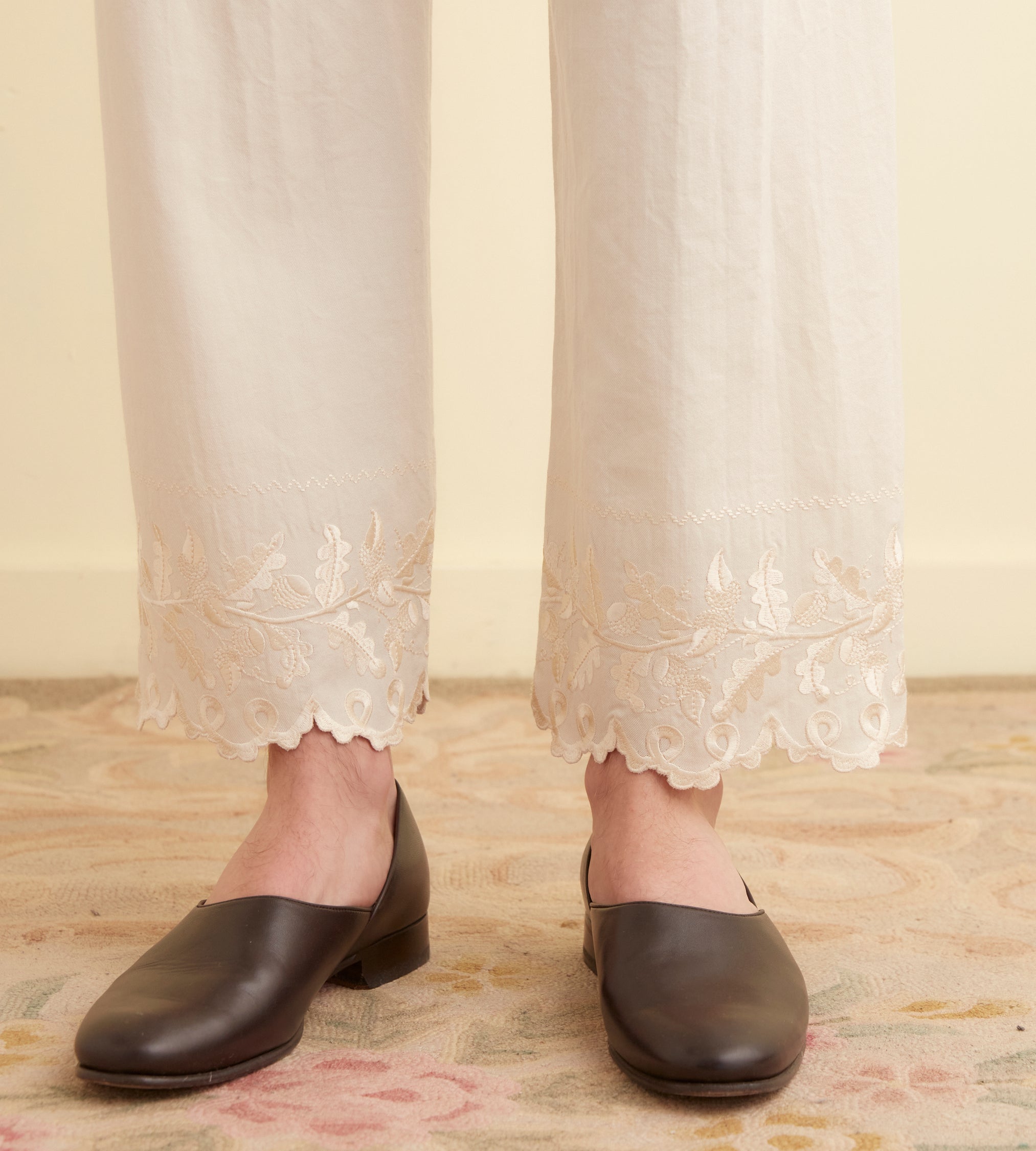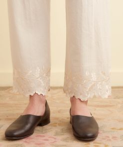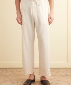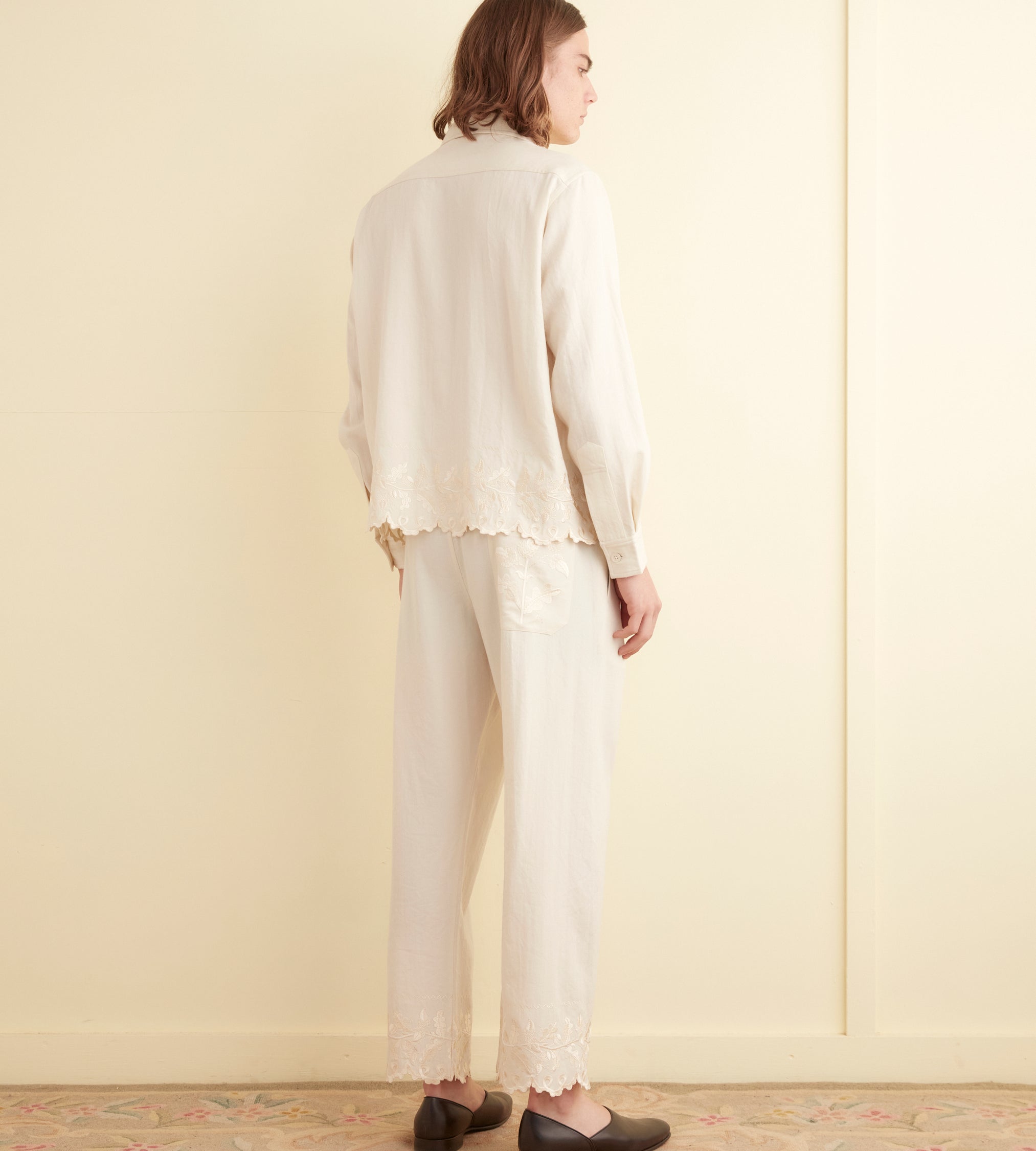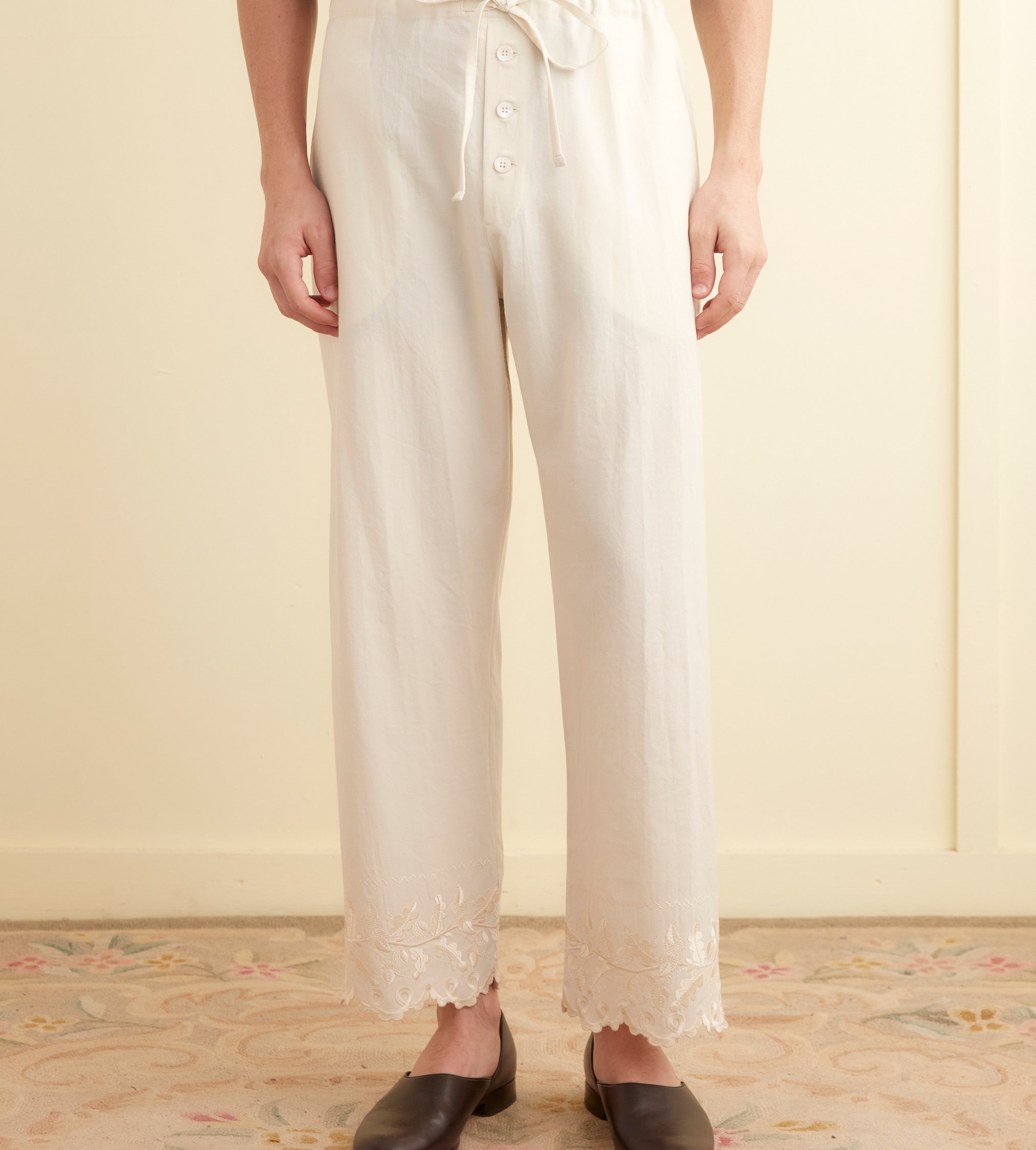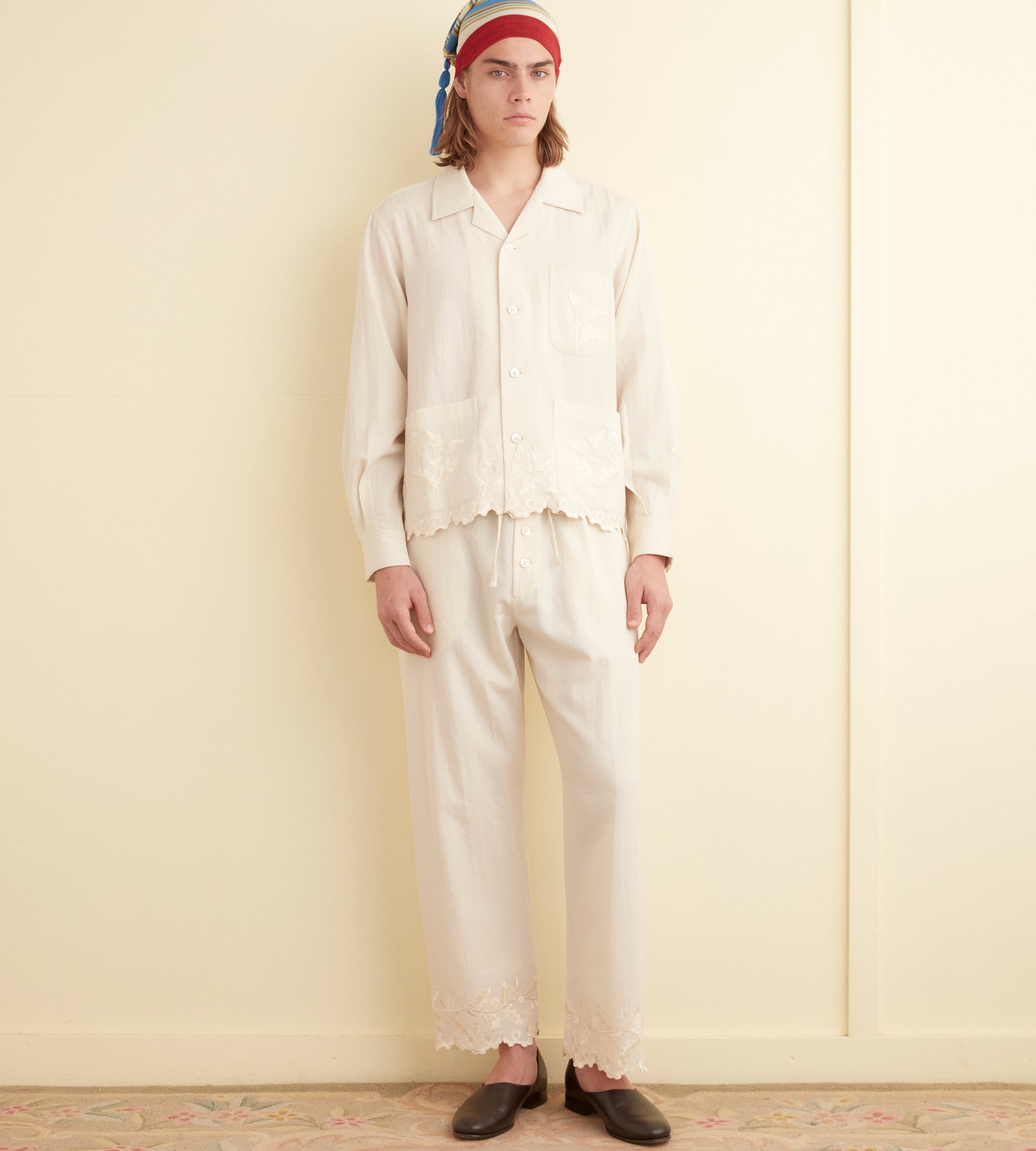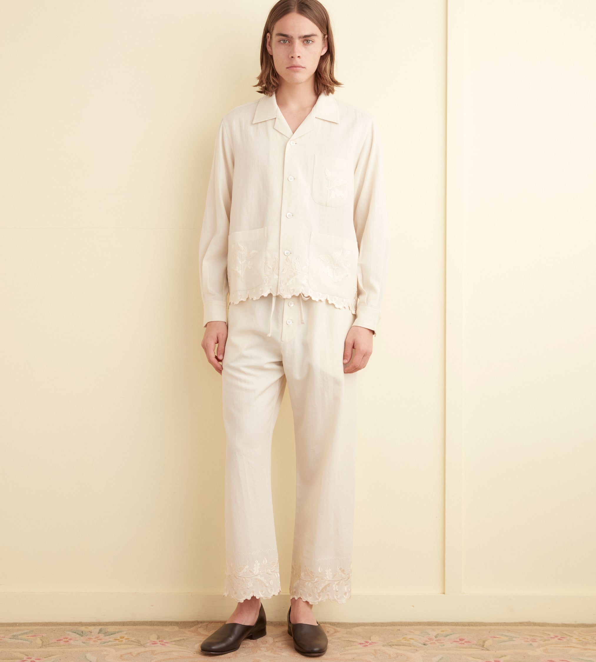 These pajama pants are inspired by a tablecloth, circa 1930s-1950s. We reproduced the embroidery, a champagne-colored pattern of acorns and oak leaves, along the scalloped hem. The pants are cut in a classic men’s pajama silhouette.