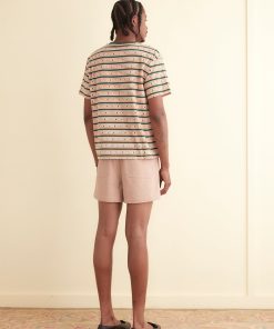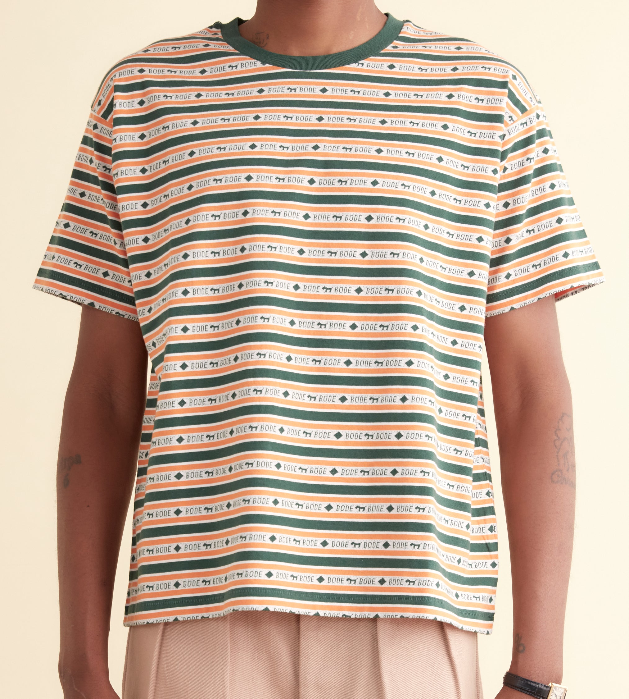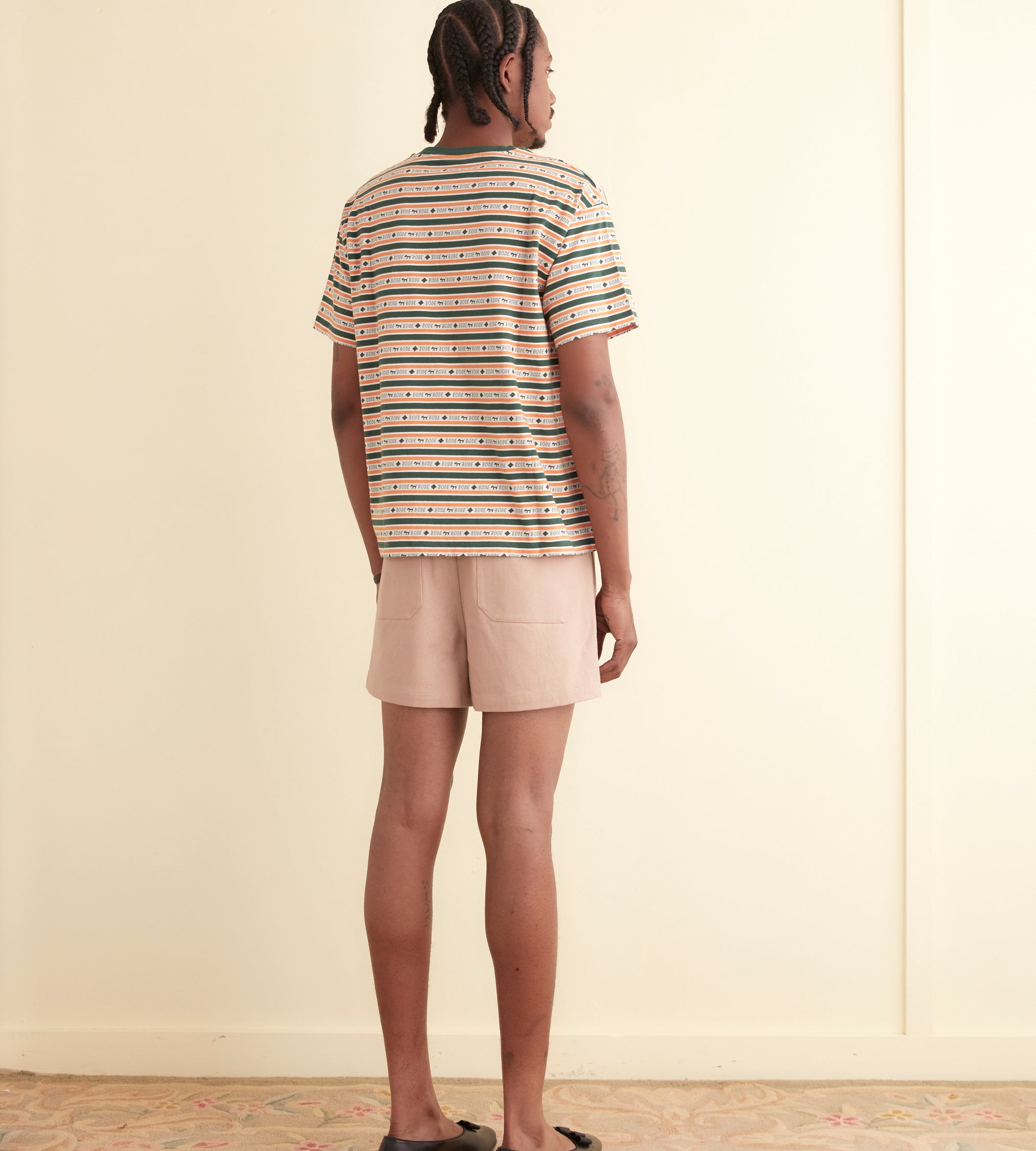 This tee is inspired by a children’s shirt from the 1960s. We reproduced the ringer neckline and the orange, green, and white stripe for this style. The Scottie dog motifs are inspired by Emily’s mother’s childhood collection of Scottie ephemera.