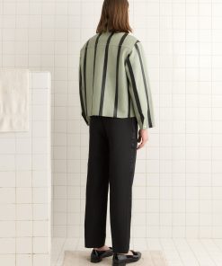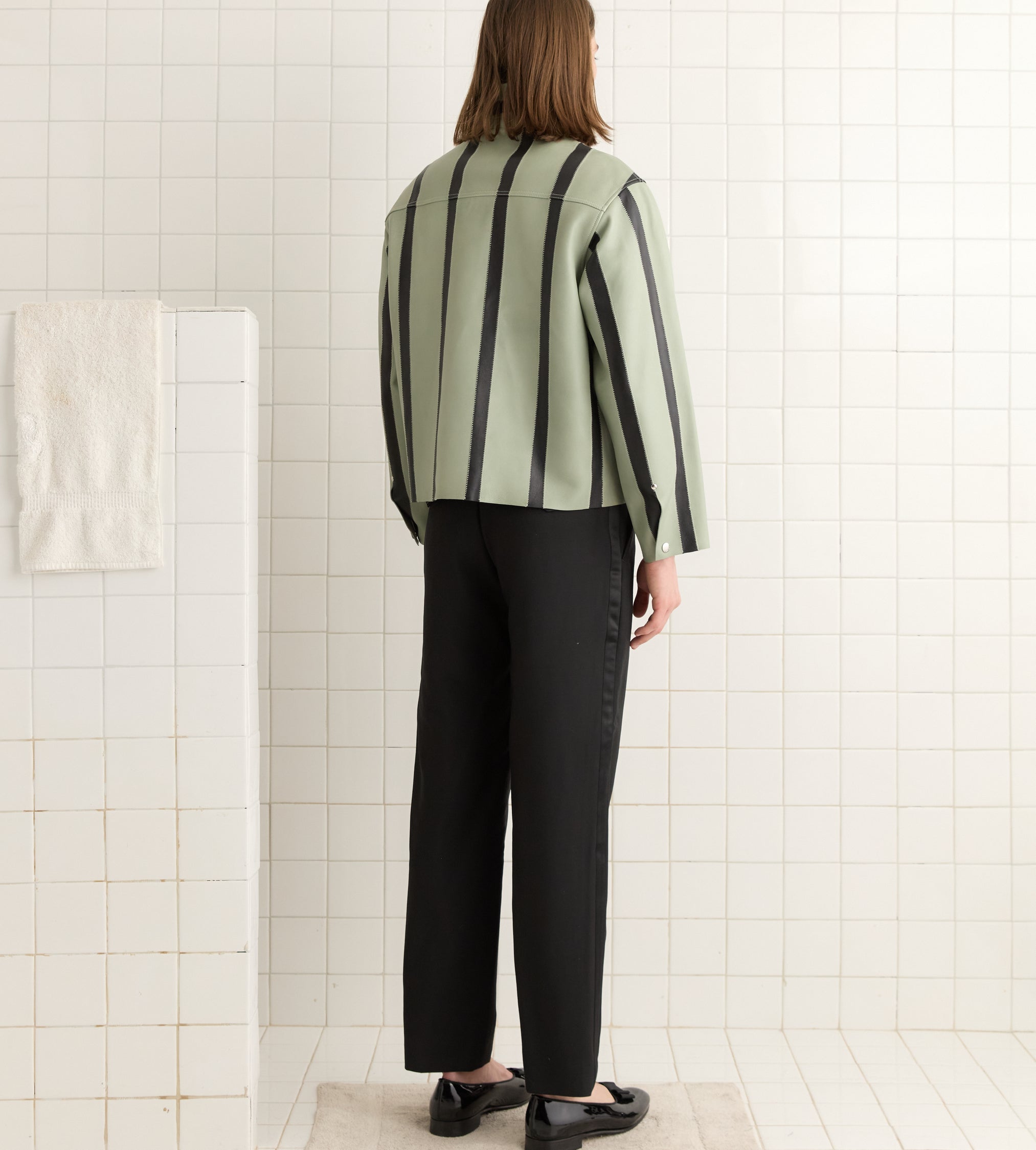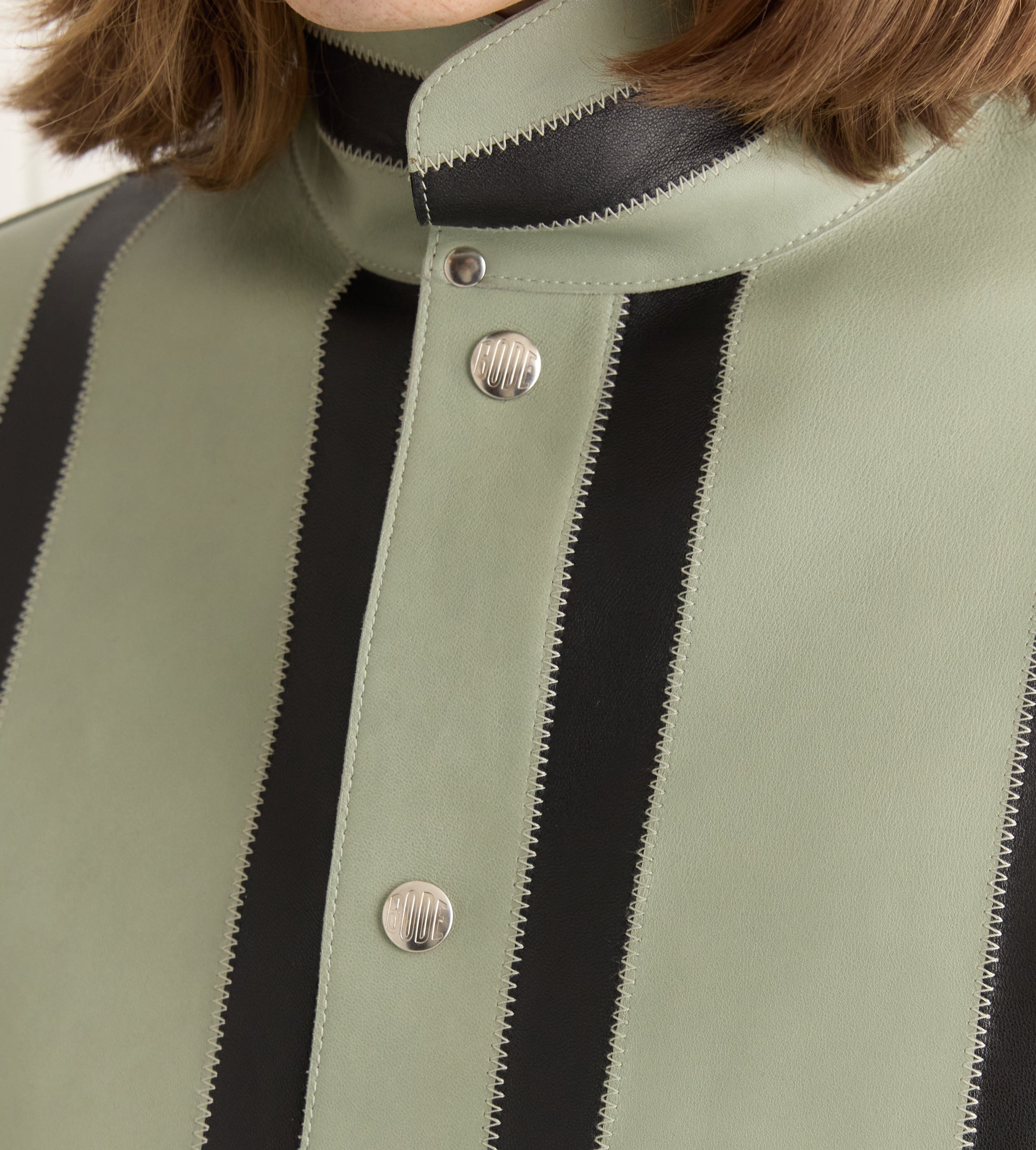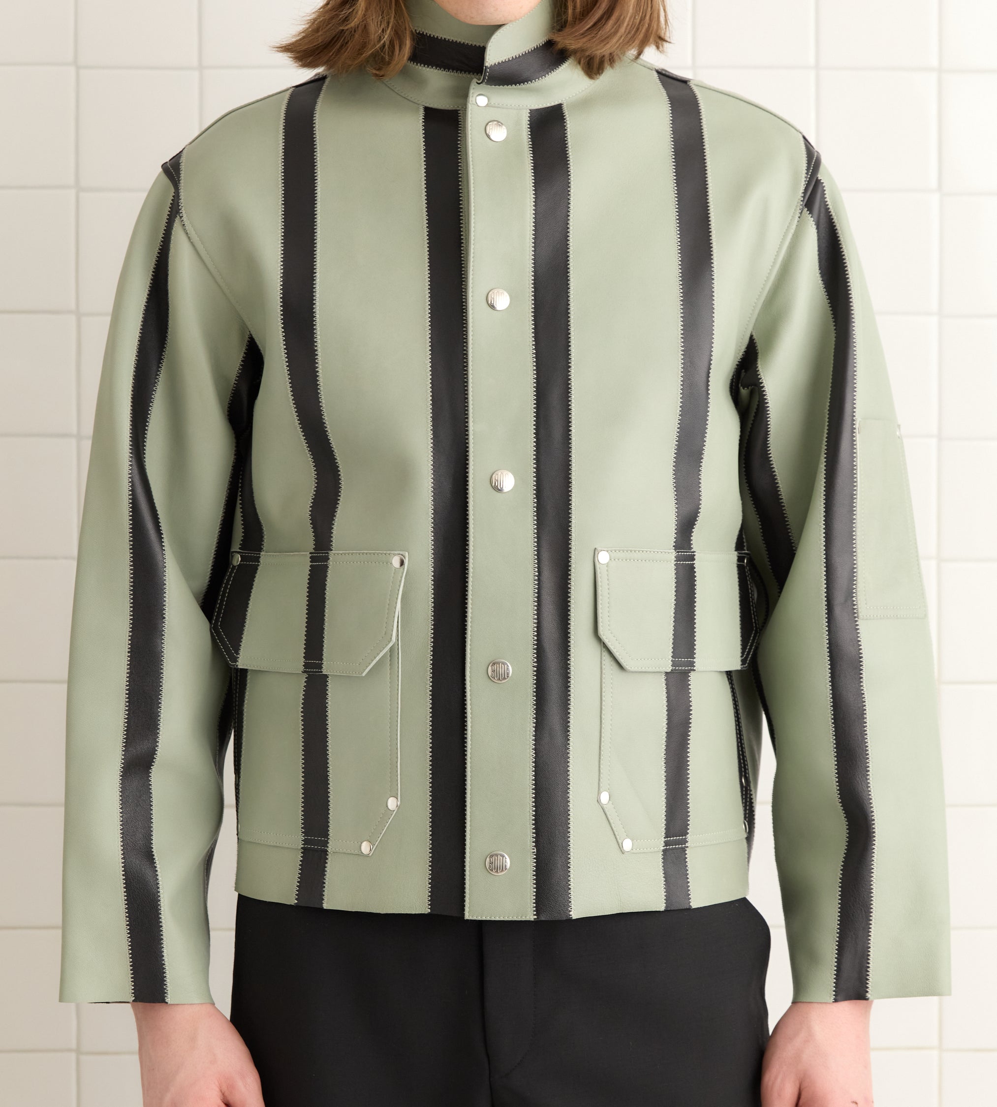 This style is inspired by a welding jacket from the midcentury. We reproduced the silhouette in stripes of black and seafoam leather. The jacket closes with snap buttons.