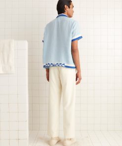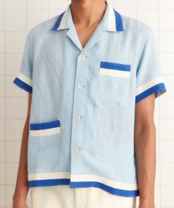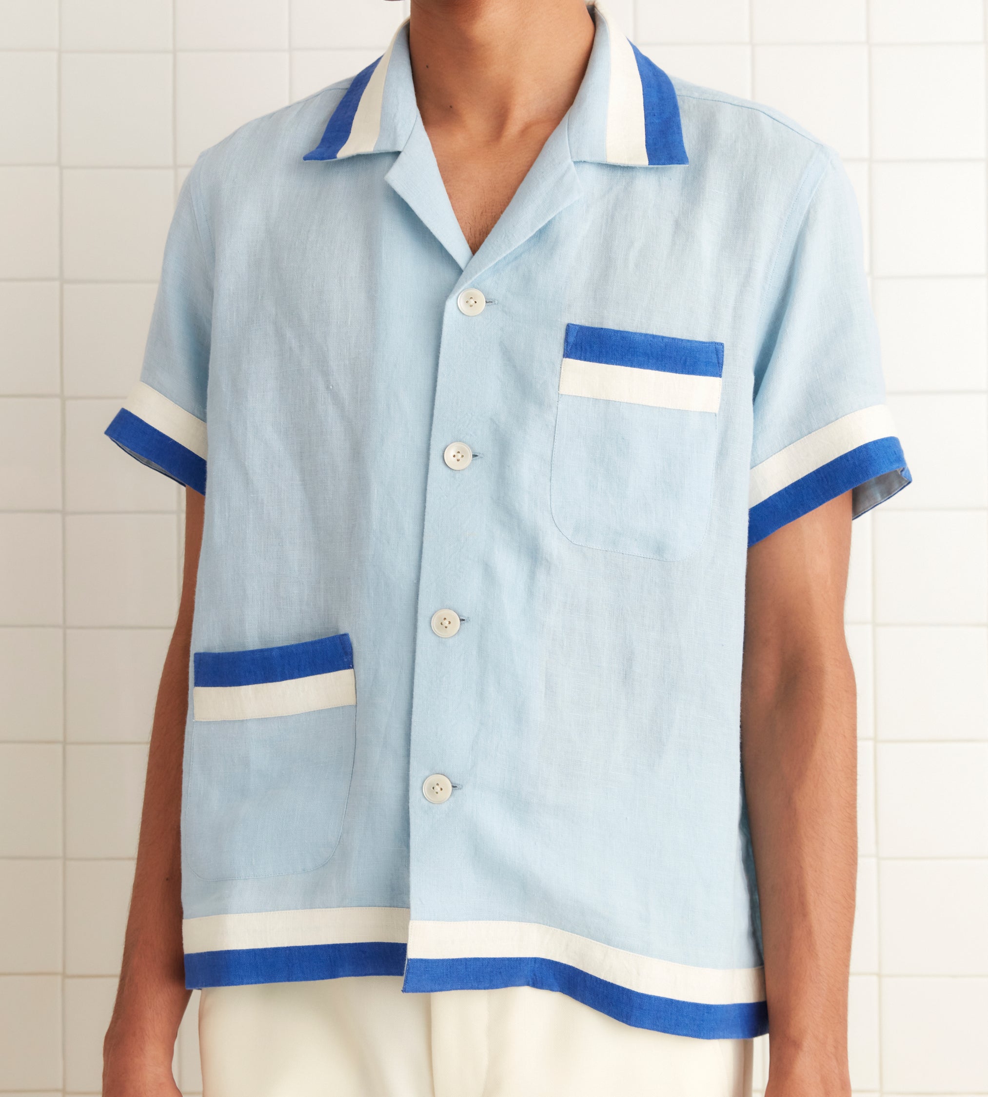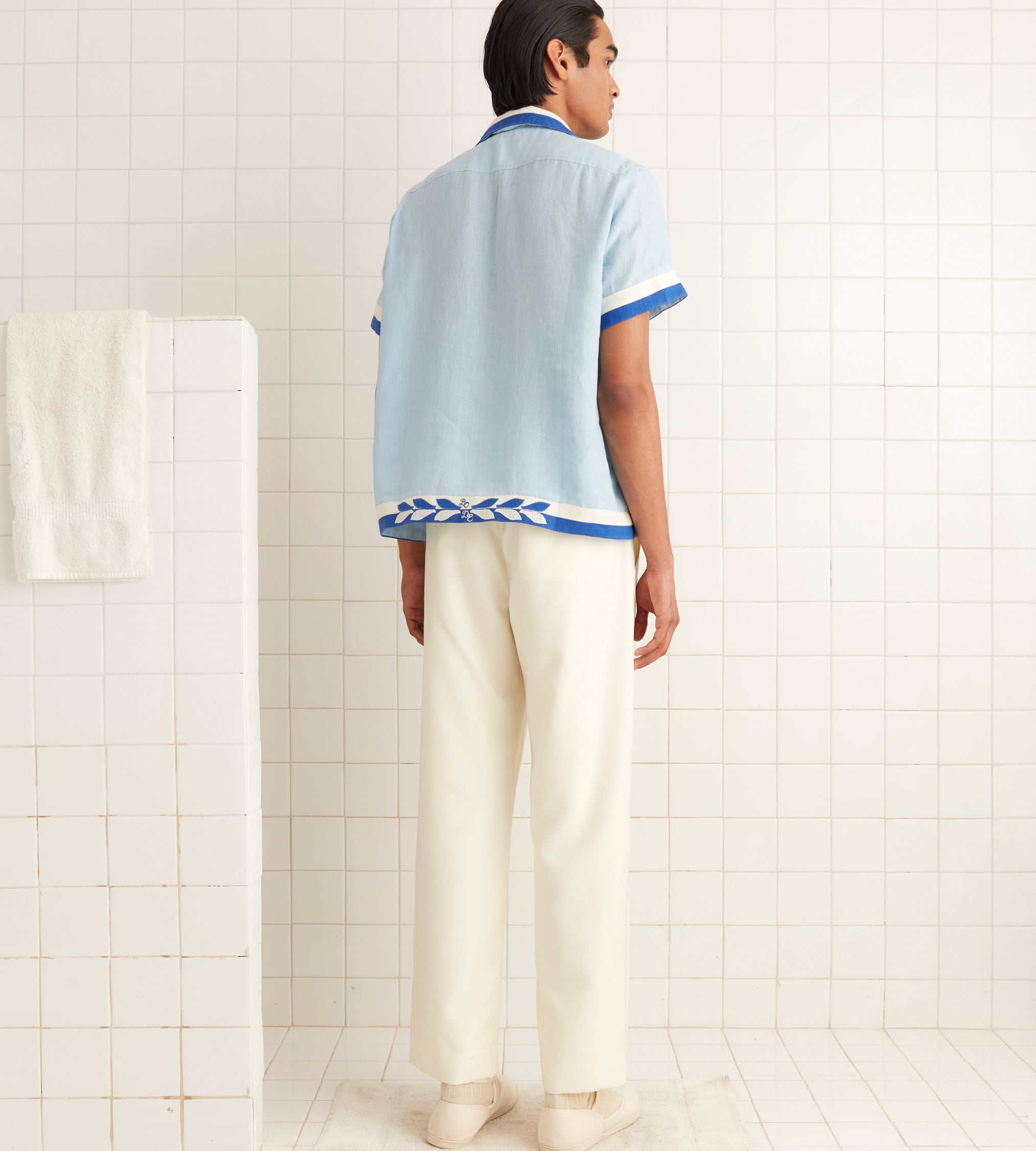 This shirt is inspired by a dishtowel from the midcentury. Made of lightweight linen, it features blue and white appliqué stripes around the hem, collar, and pockets, broken up by an alternating leaf pattern.