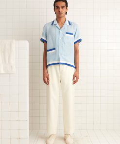 This shirt is inspired by a dishtowel from the midcentury. Made of lightweight linen, it features blue and white appliqué stripes around the hem, collar, and pockets, broken up by an alternating leaf pattern.