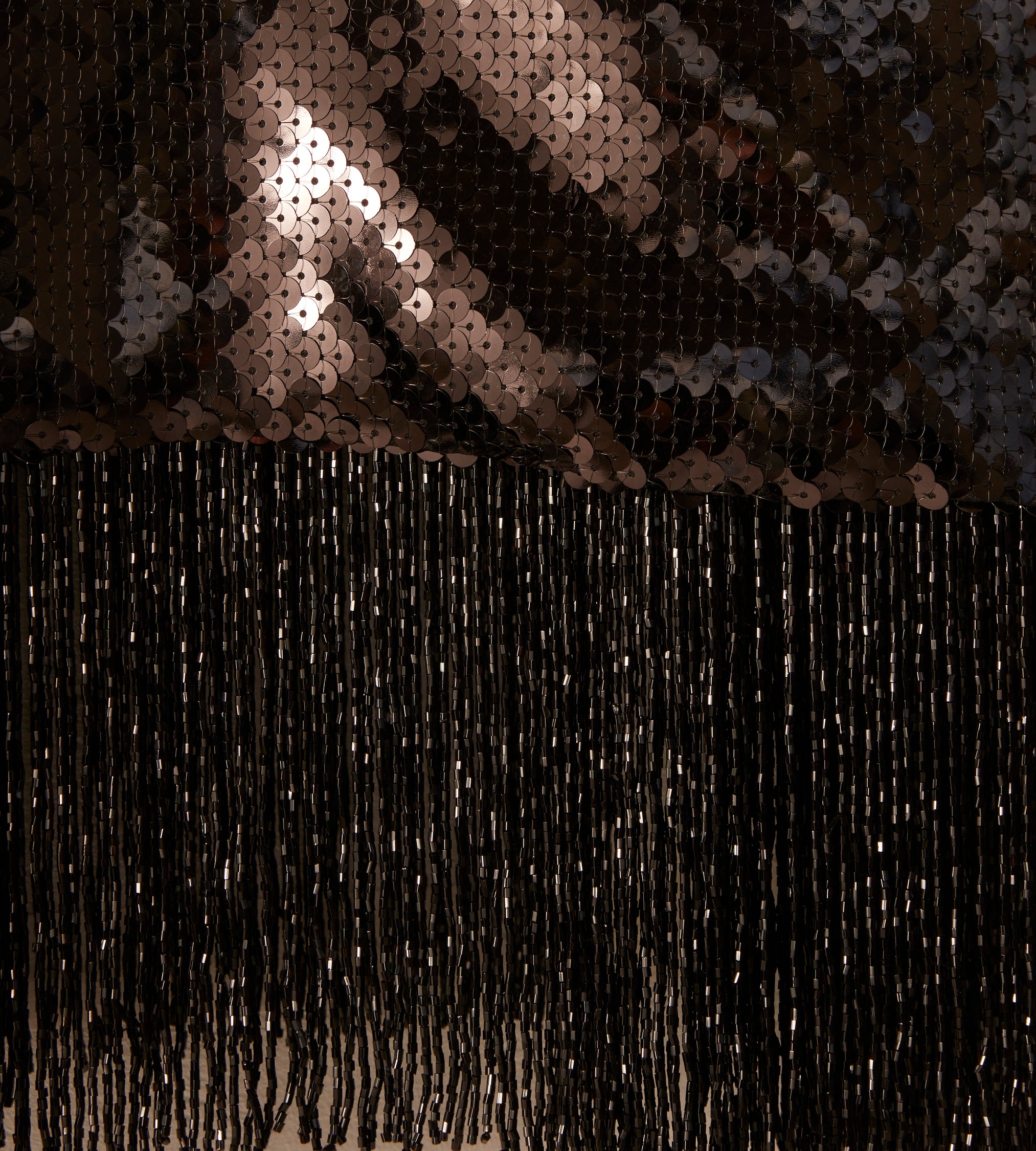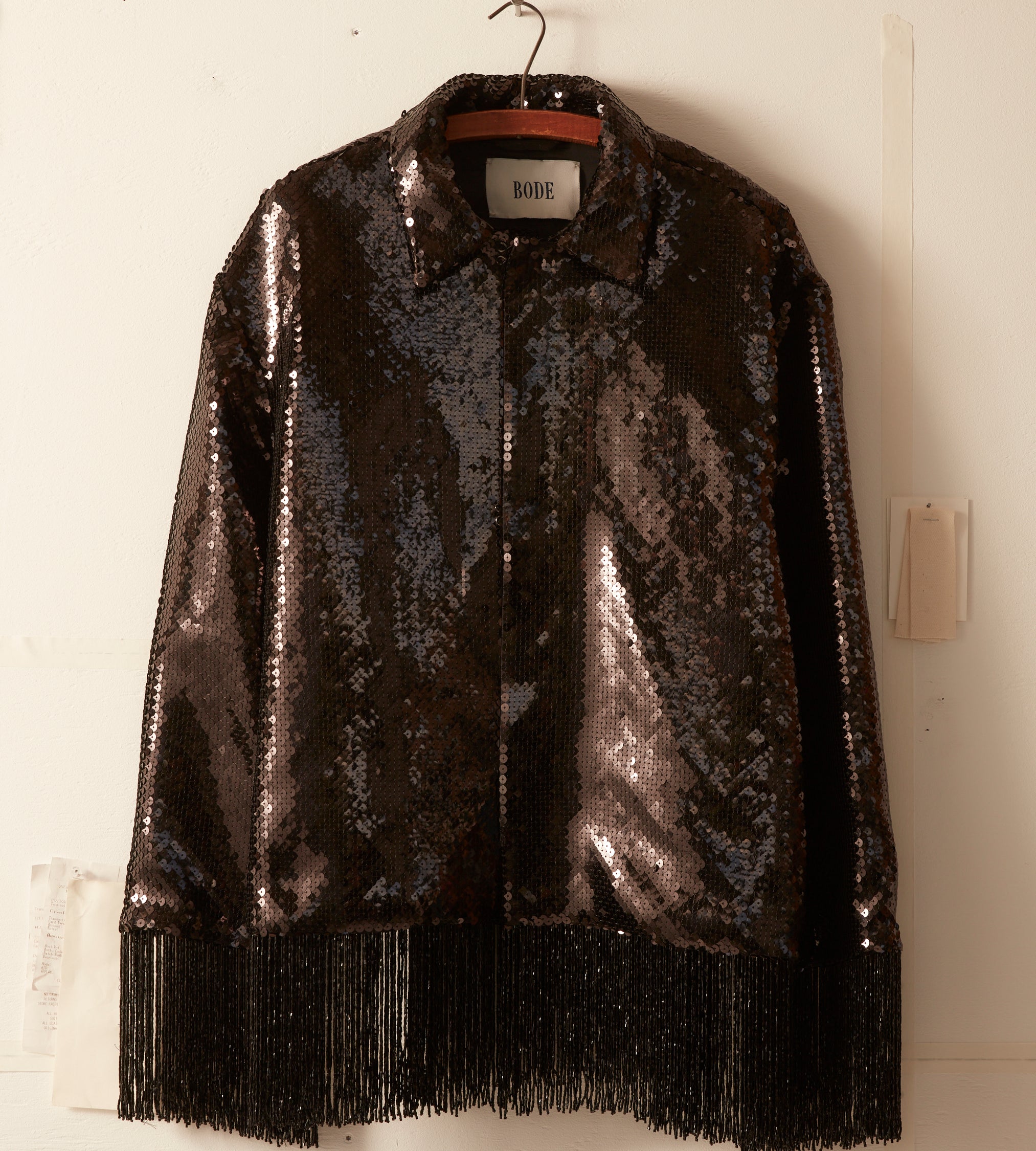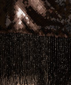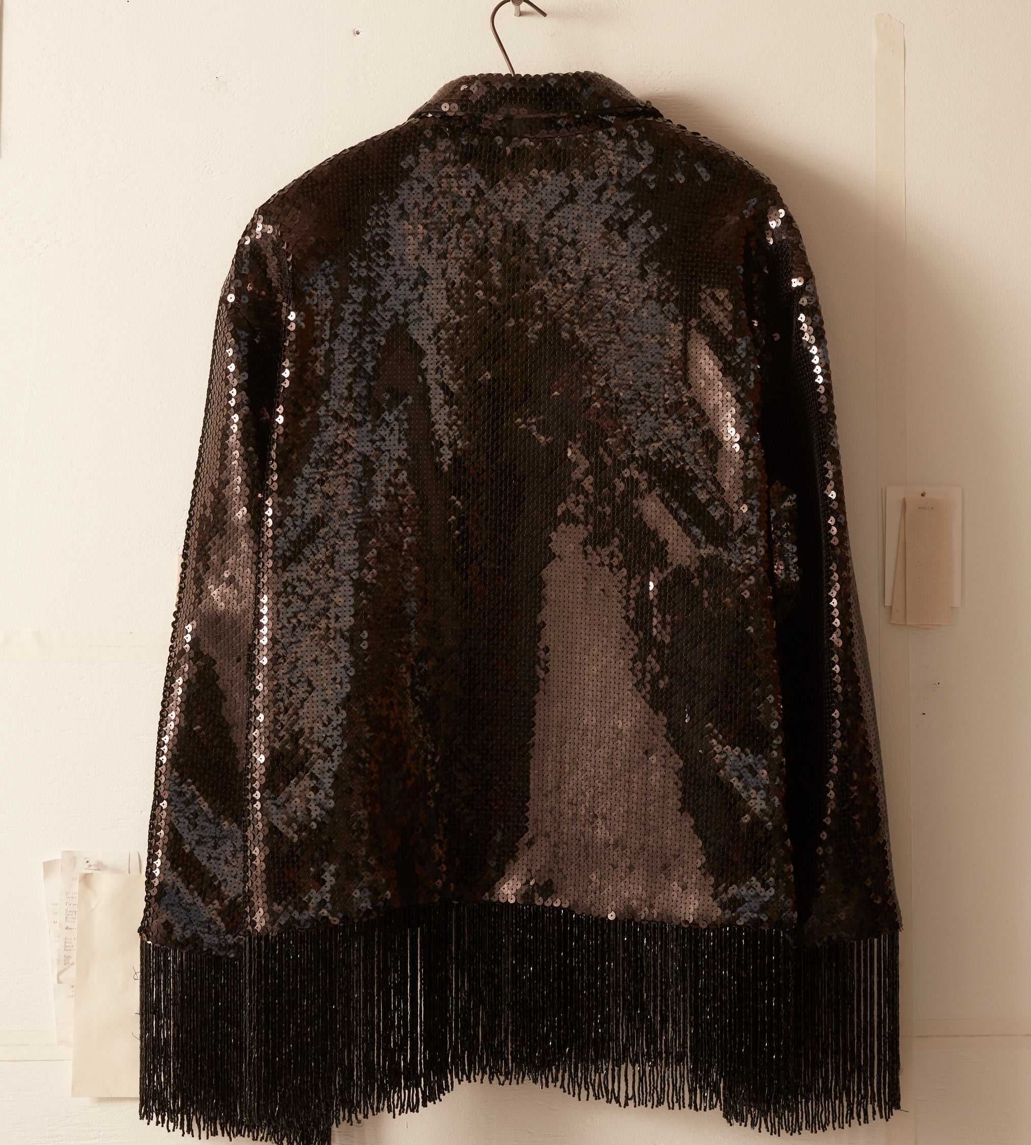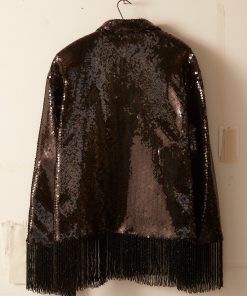 This jacket is inspired by a 1980s formal evening wear set. The jacket’s shimmering sequined design is a faithful reproduction of the original set with a fringed hem.