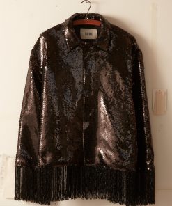 This jacket is inspired by a 1980s formal evening wear set. The jacket’s shimmering sequined design is a faithful reproduction of the original set with a fringed hem.