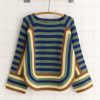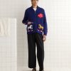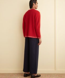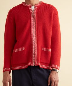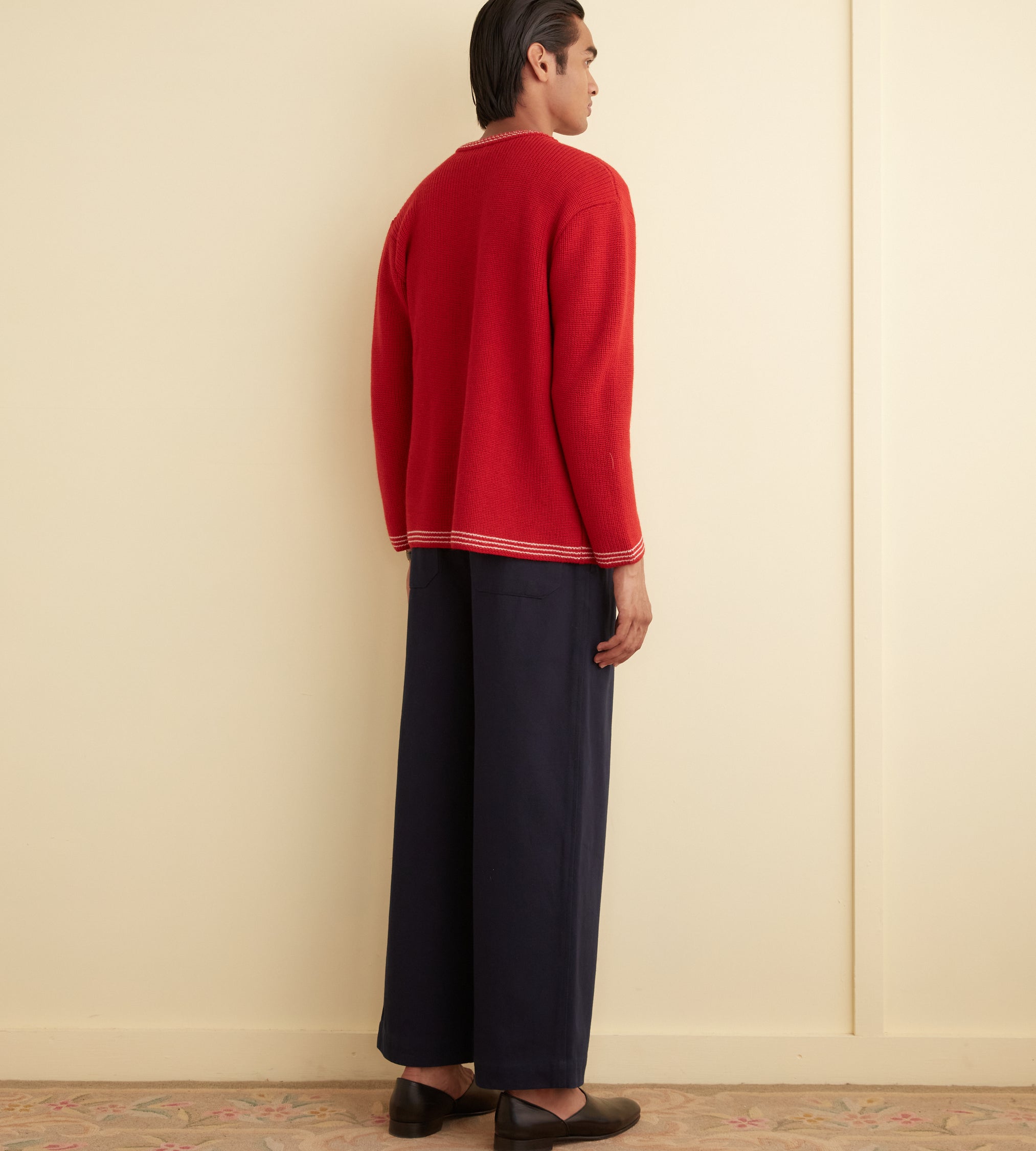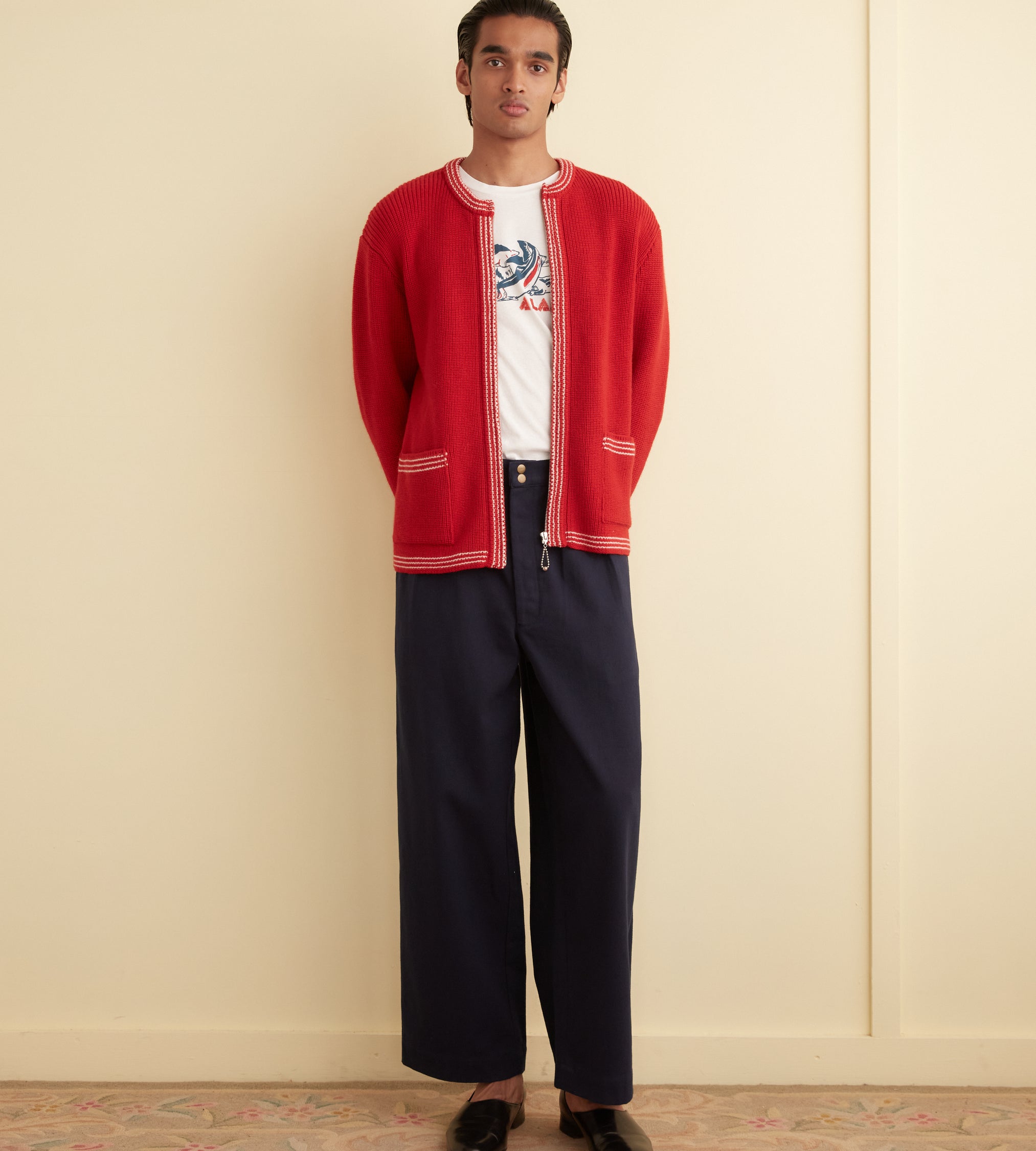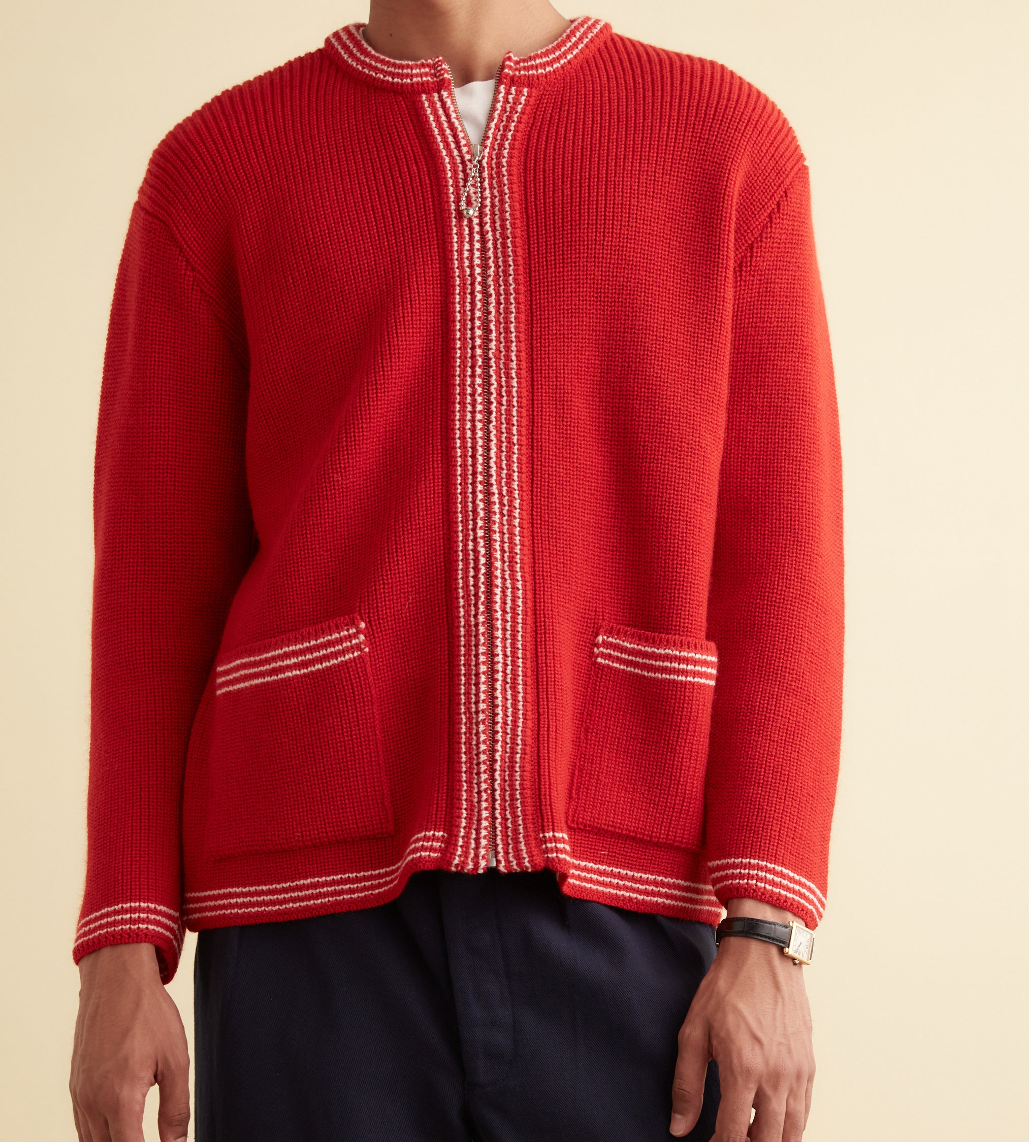 This cardigan is inspired by a sweater from the 1970s, owned by Emily’s mother. We reproduced the original piece, with its zip front and white striping details around the placket and pockets.