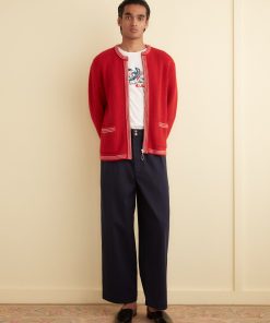This cardigan is inspired by a sweater from the 1970s, owned by Emily’s mother. We reproduced the original piece, with its zip front and white striping details around the placket and pockets.