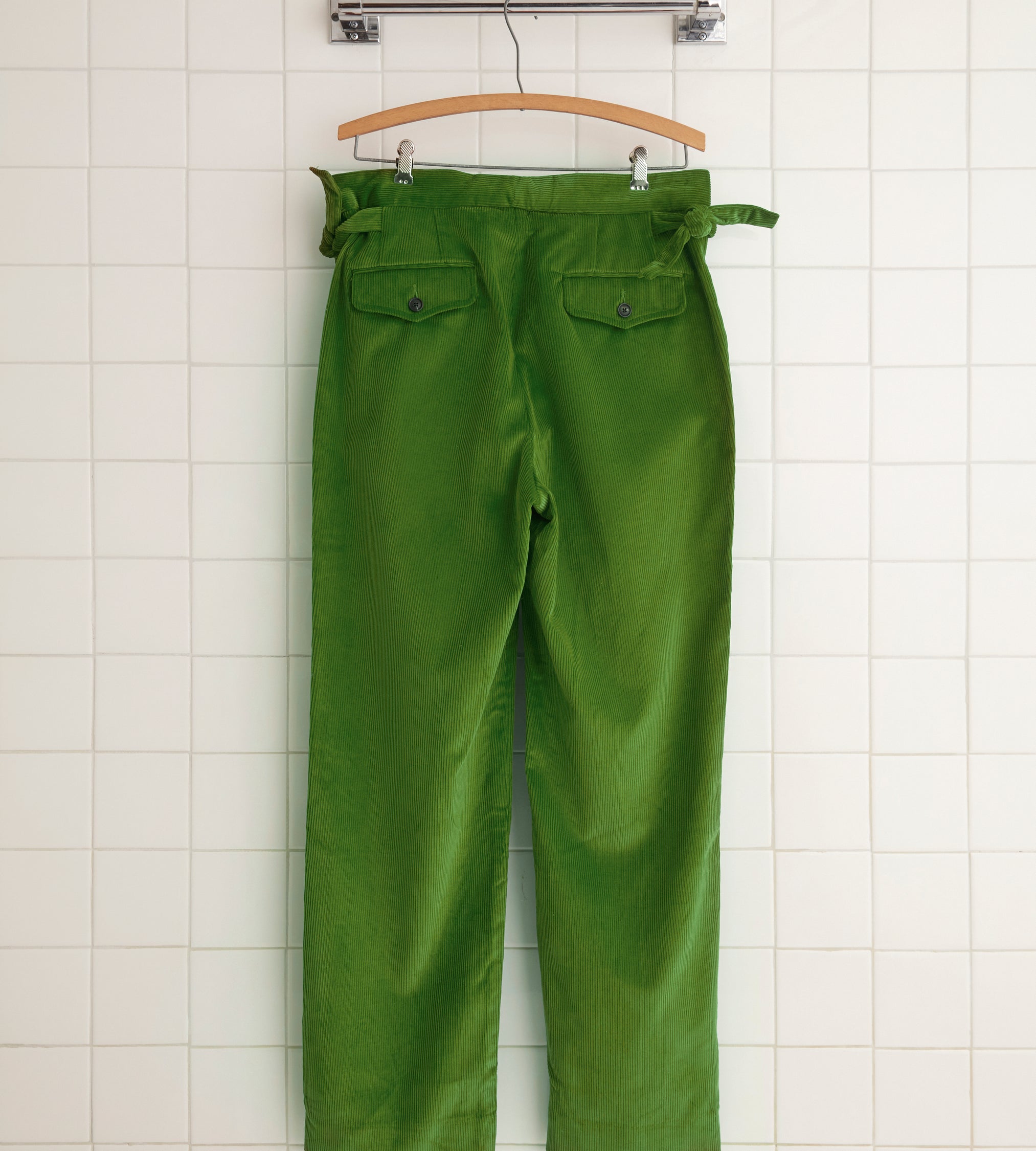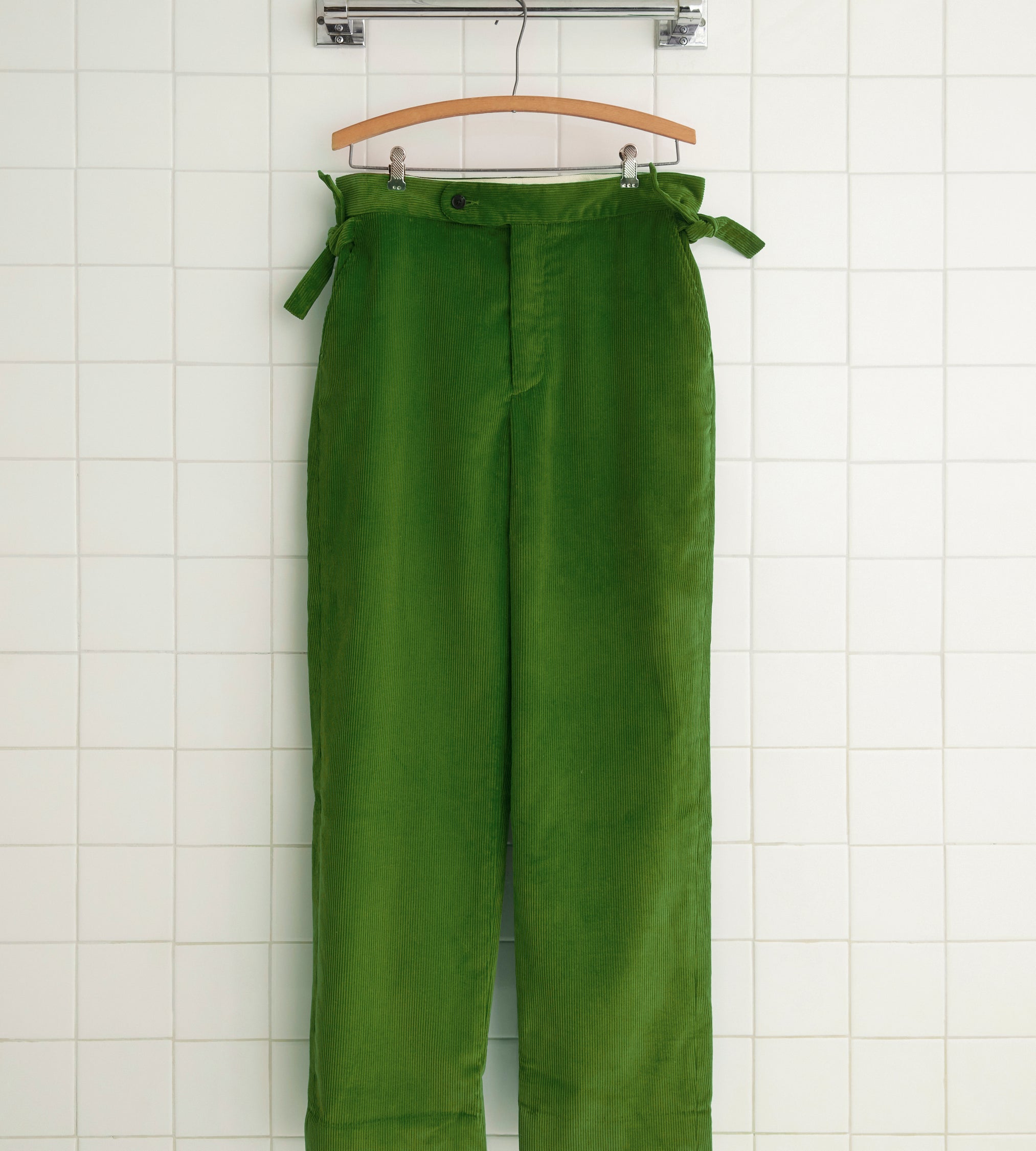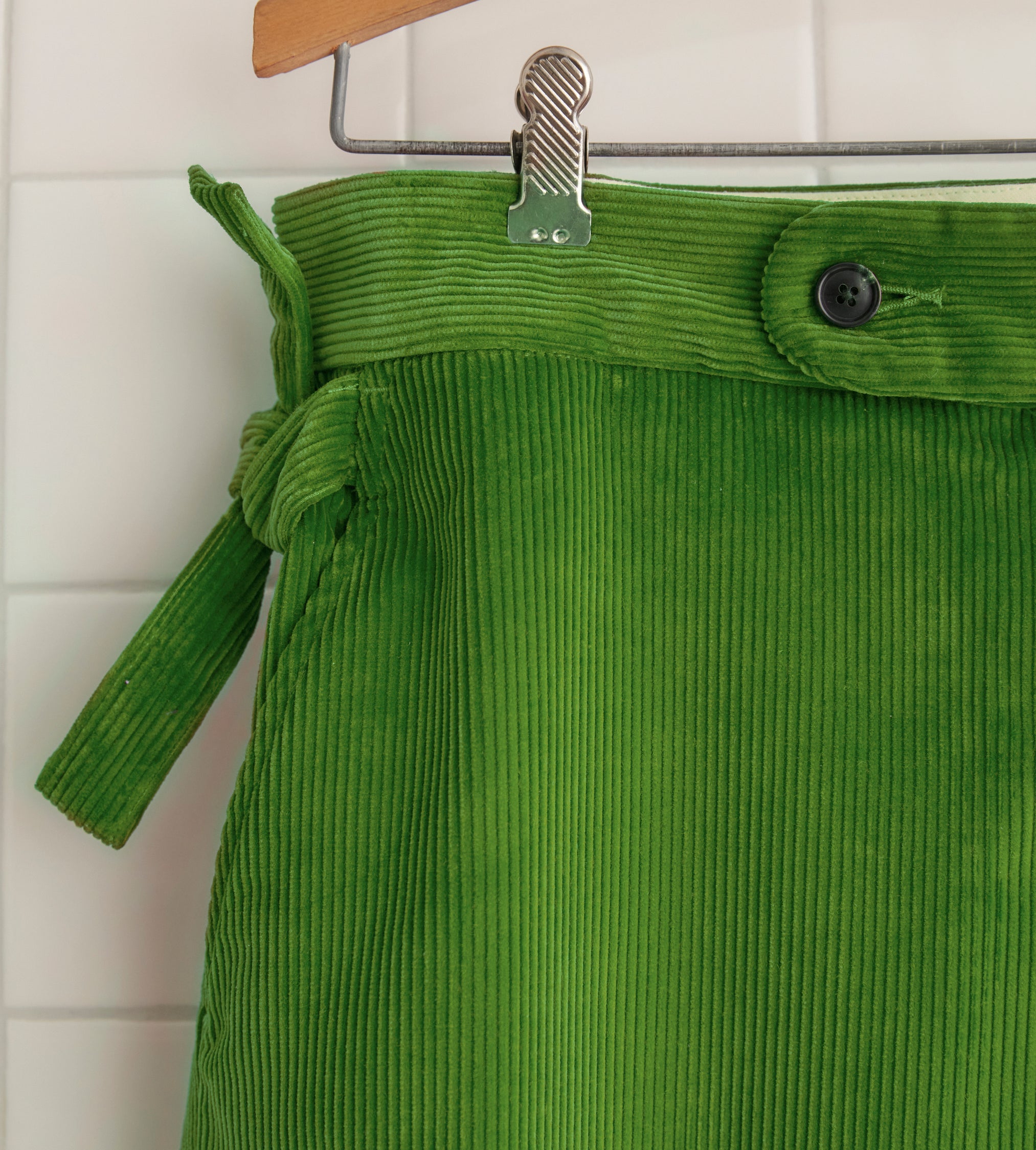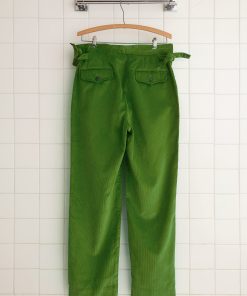 These one-of-a-kind trousers are made from midcentury deadstock corduroy fabric. the pair feature side-tie adjusters for the desired fit. Hand-mending throughout.