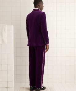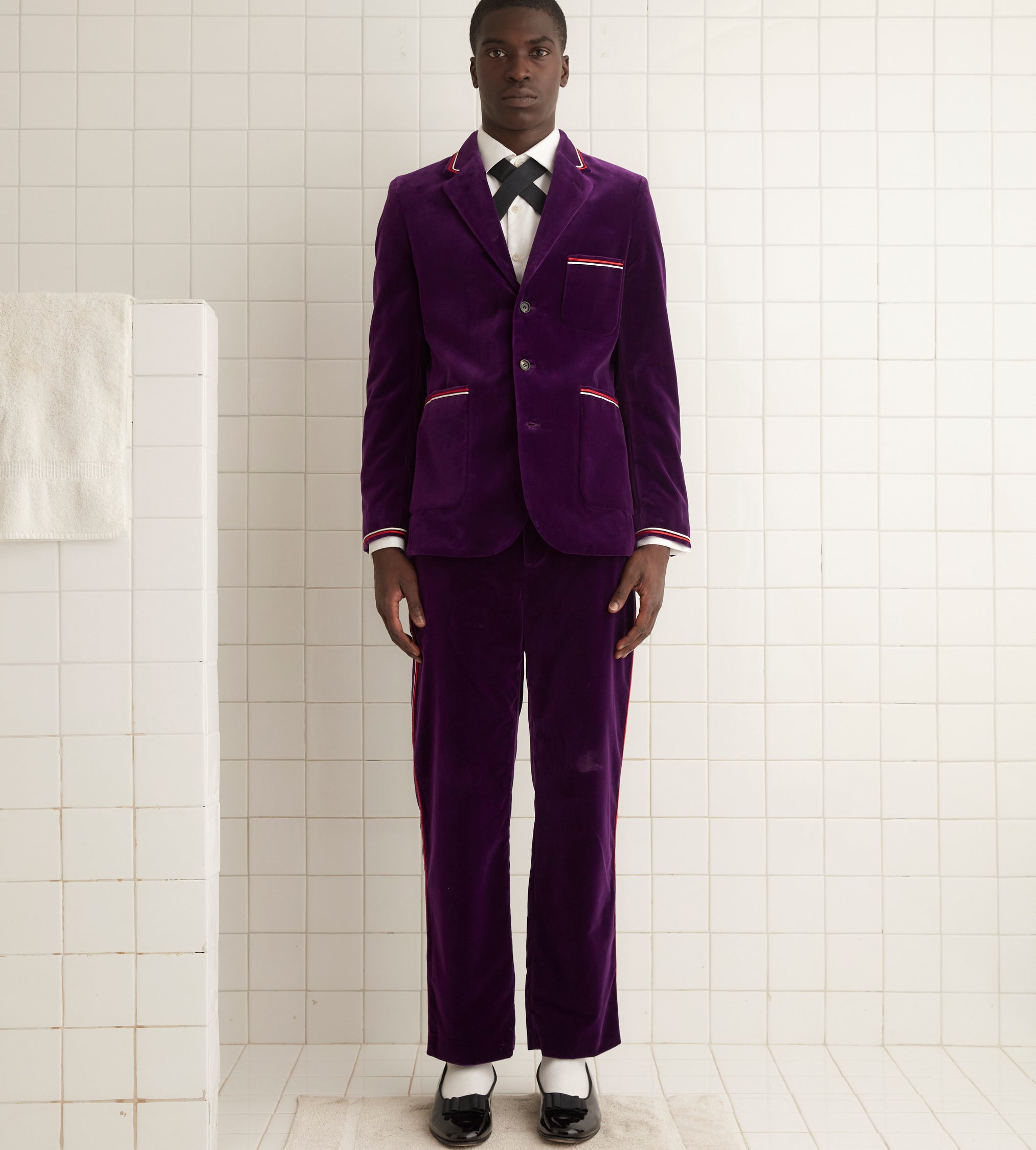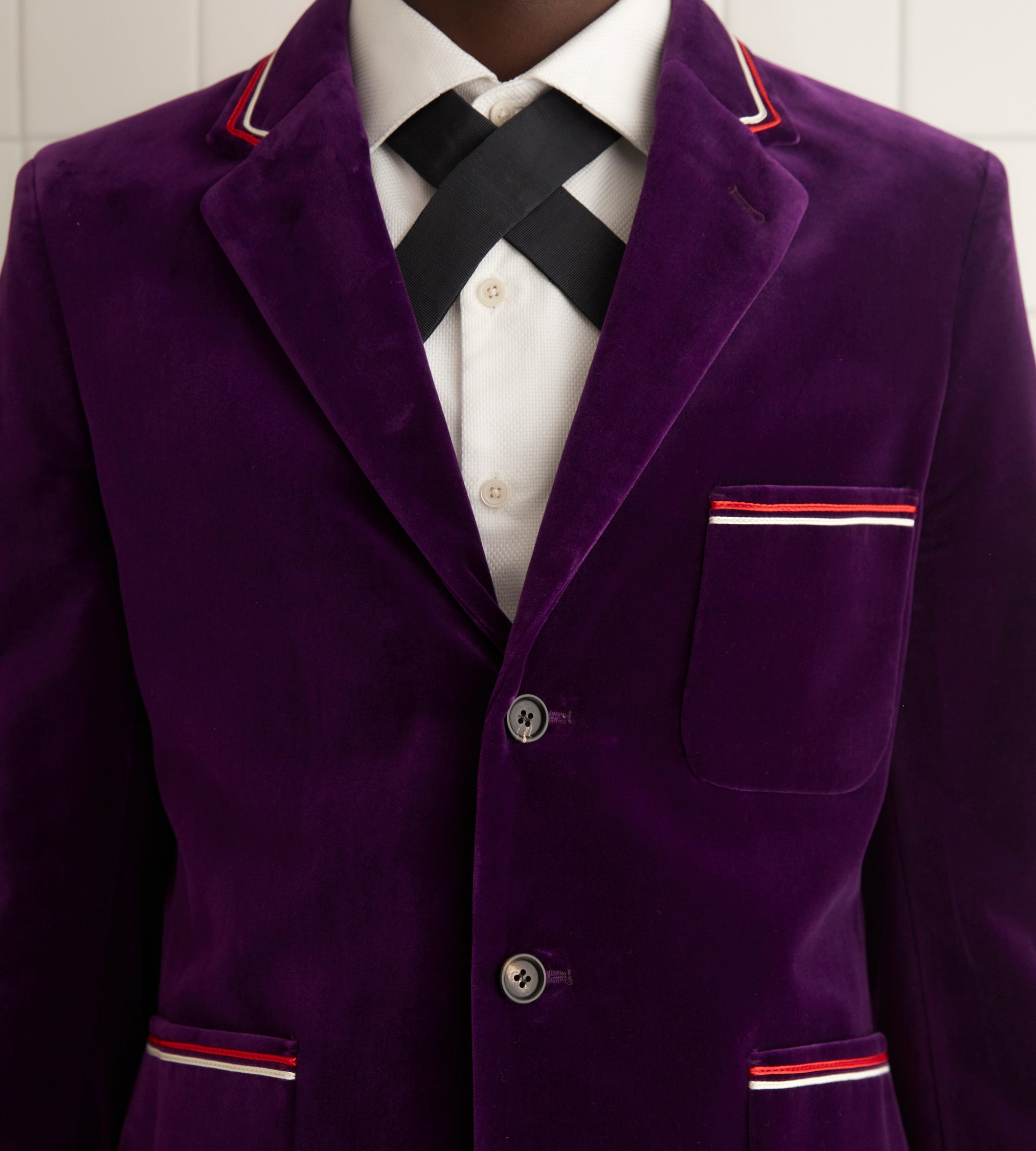 This piece is inspired by a velvet jacket from the late 19th century. We reproduced the purple velvet for this style, which is edged with red and cream soutache trim.