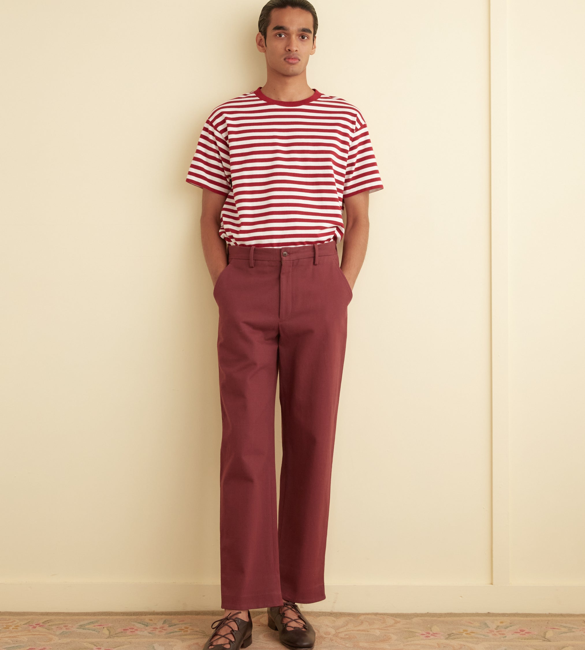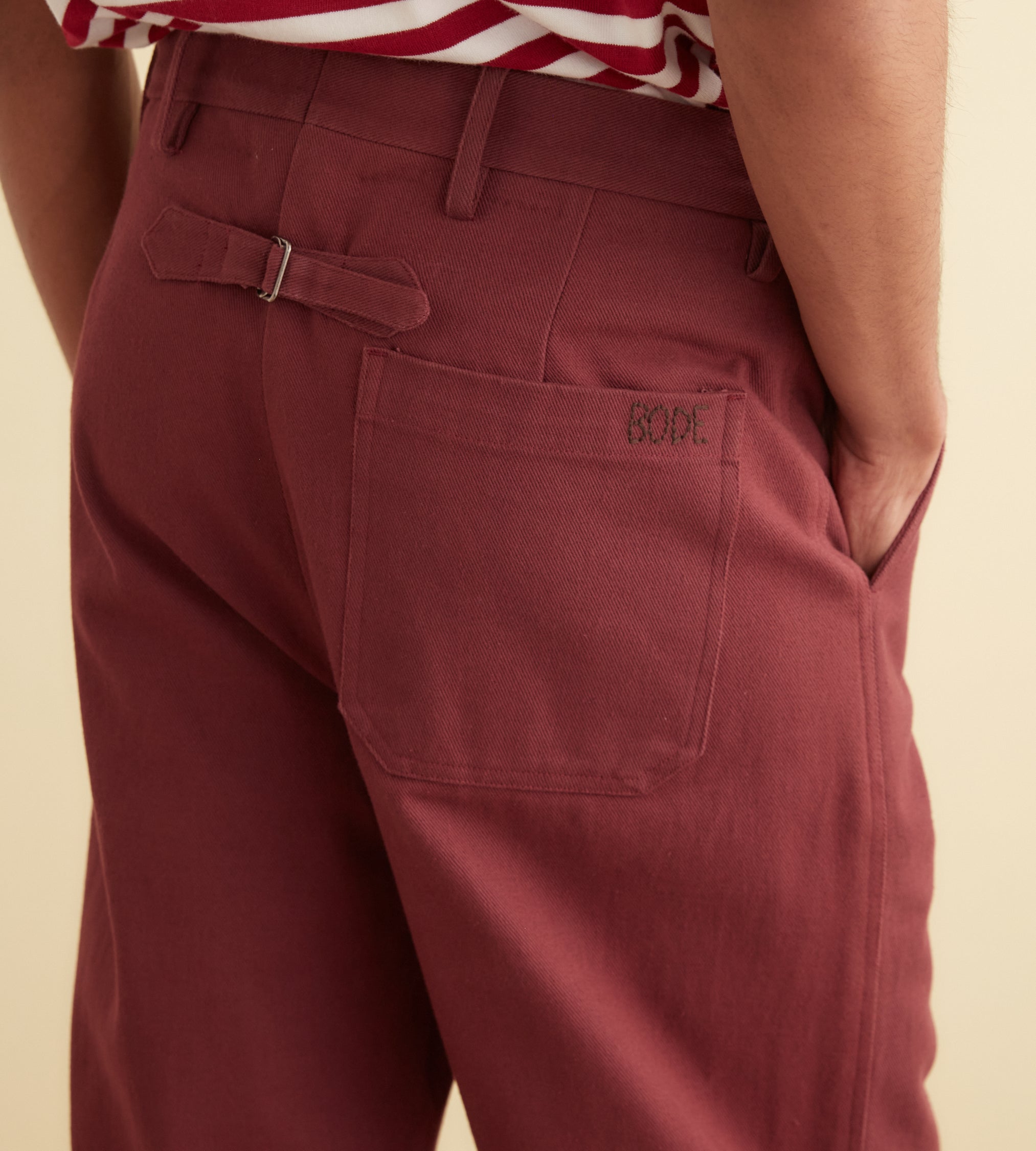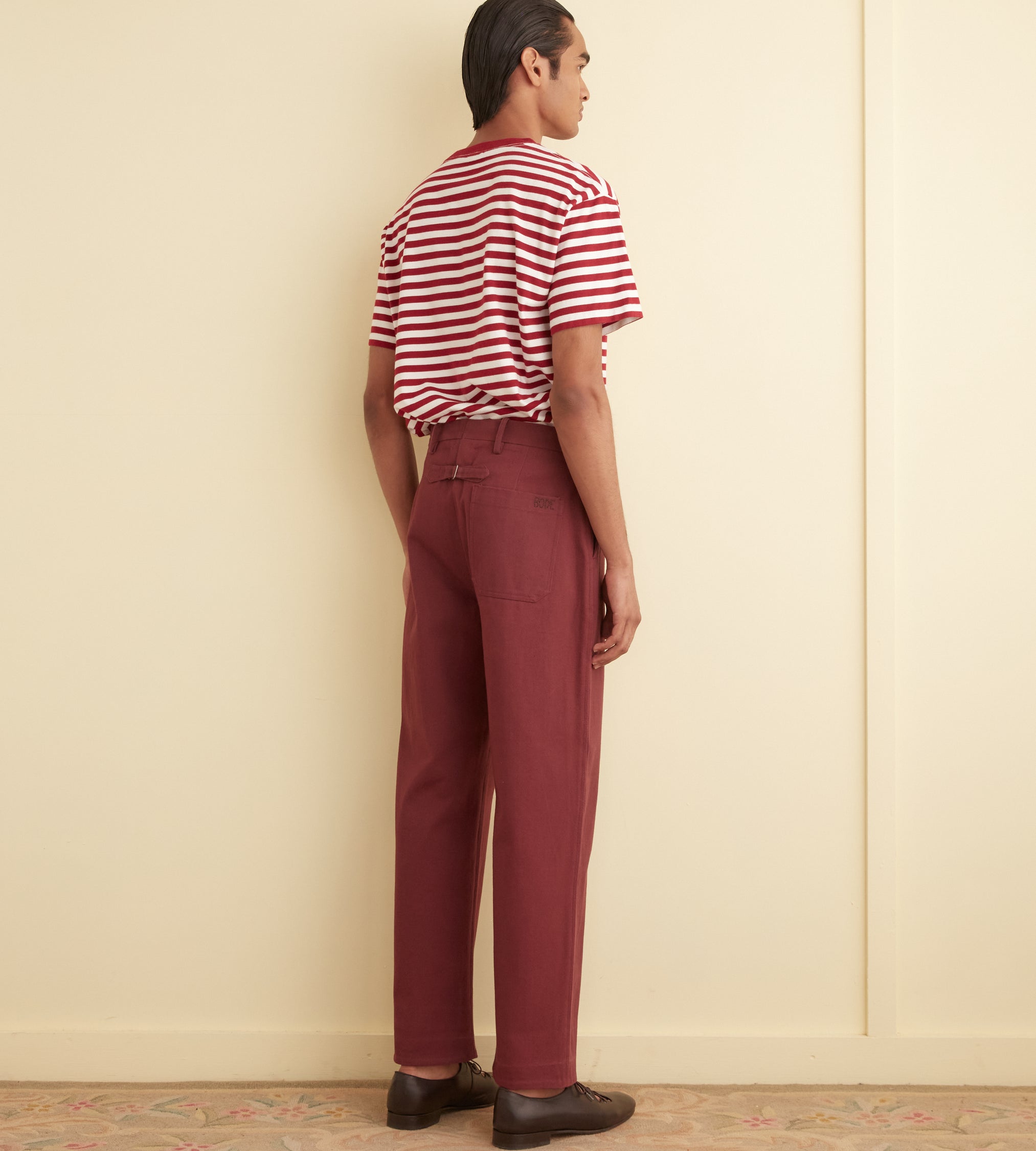This style is inspired by a pair of French twill workwear trousers, circa 1940s. The silhouette is that of a traditional trouser—high rise, straight leg.