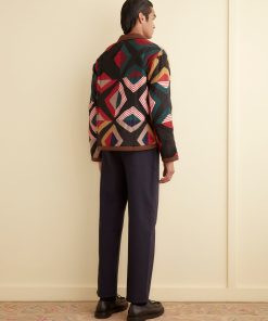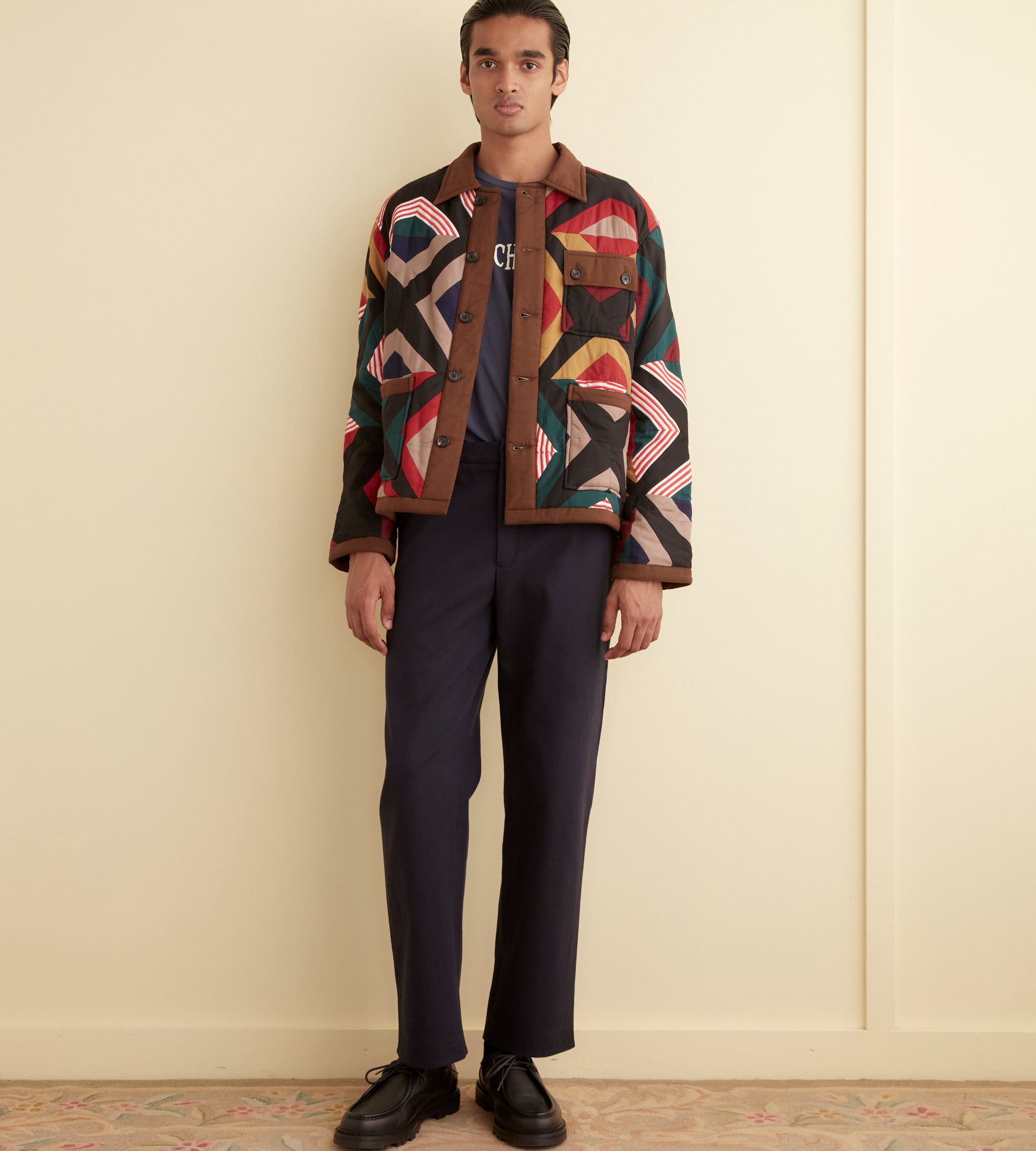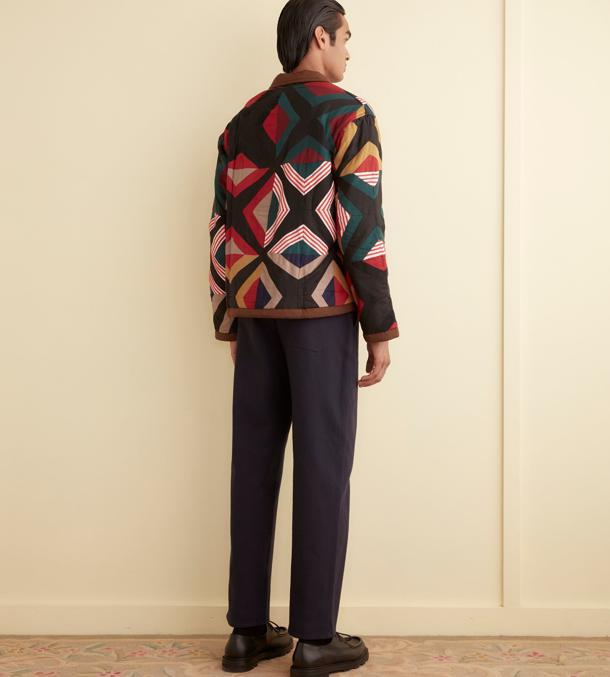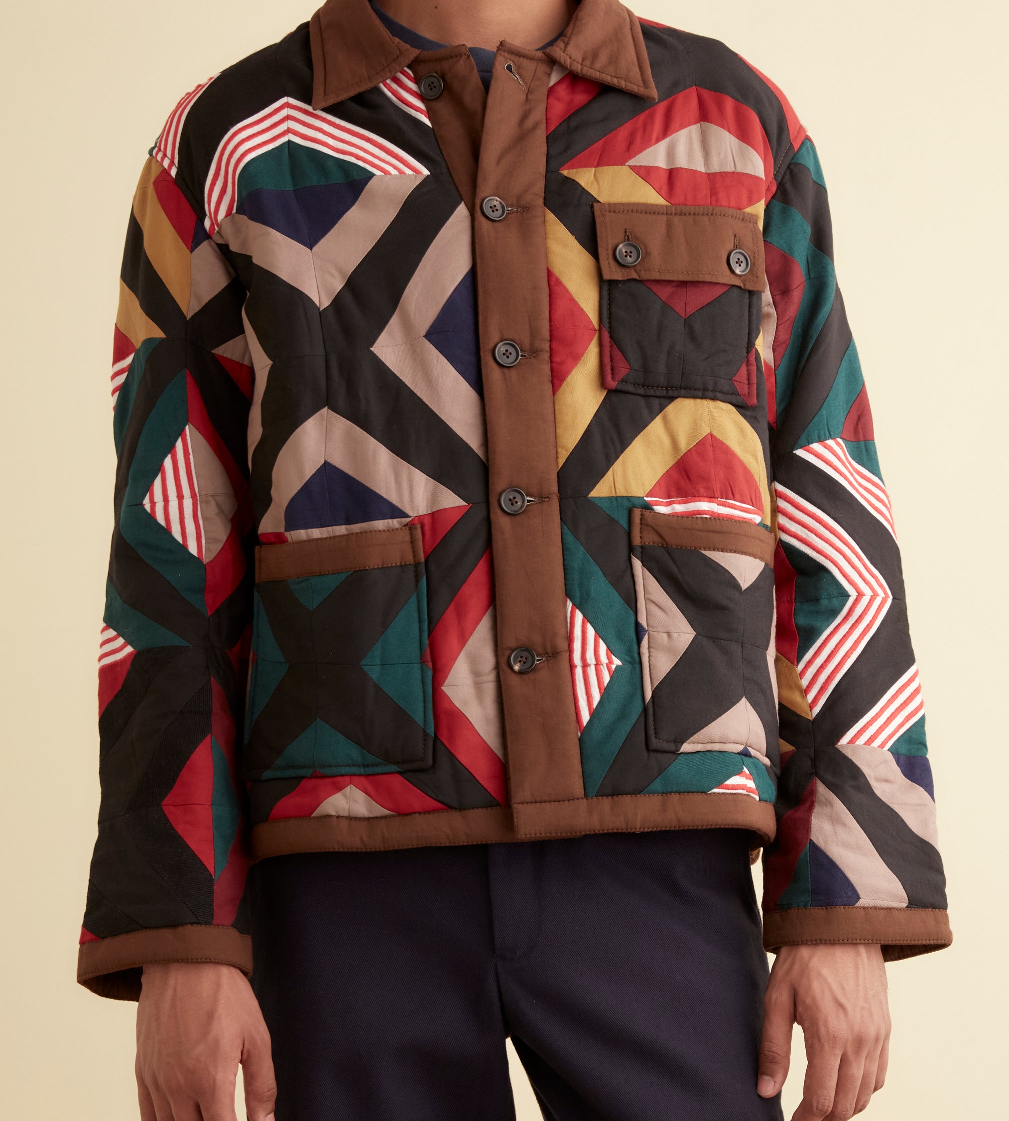 This jacket is inspired by a quilt from the midcentury. We reproduced the original piece, with its muted colors, for this style. The jacket is cut in a classic workwear silhouette.